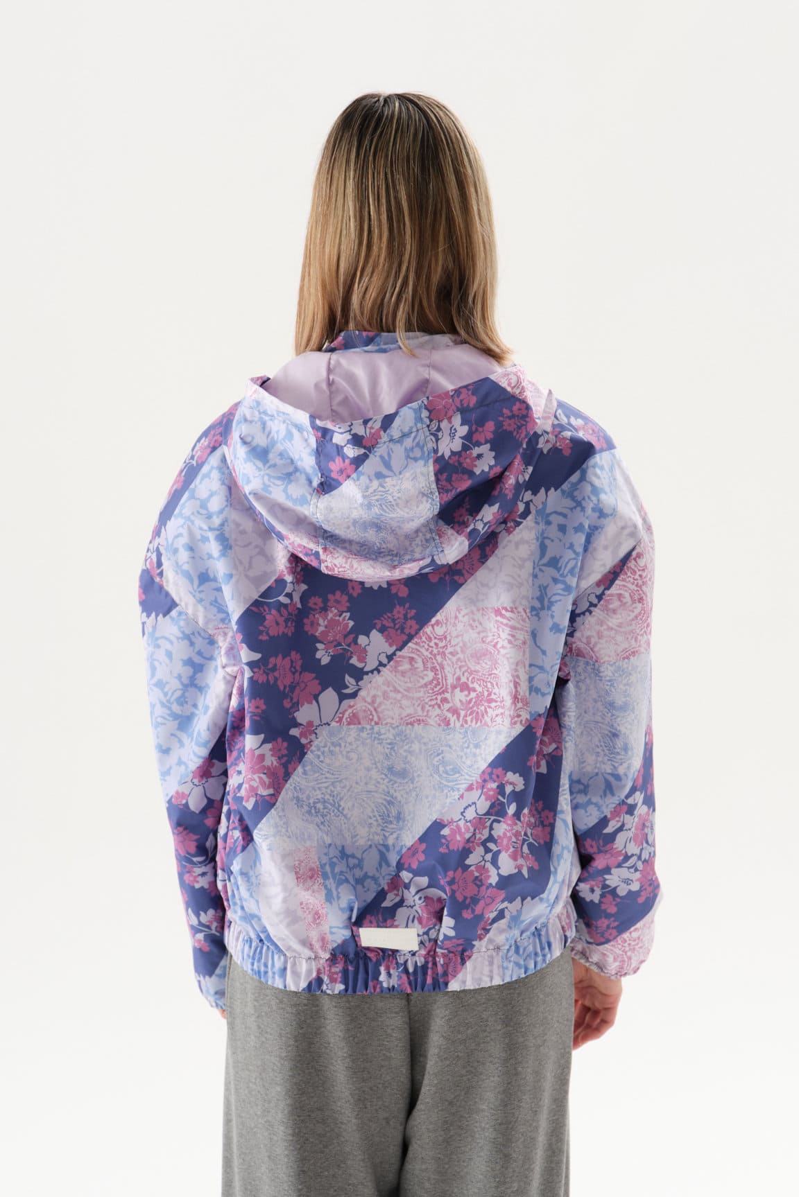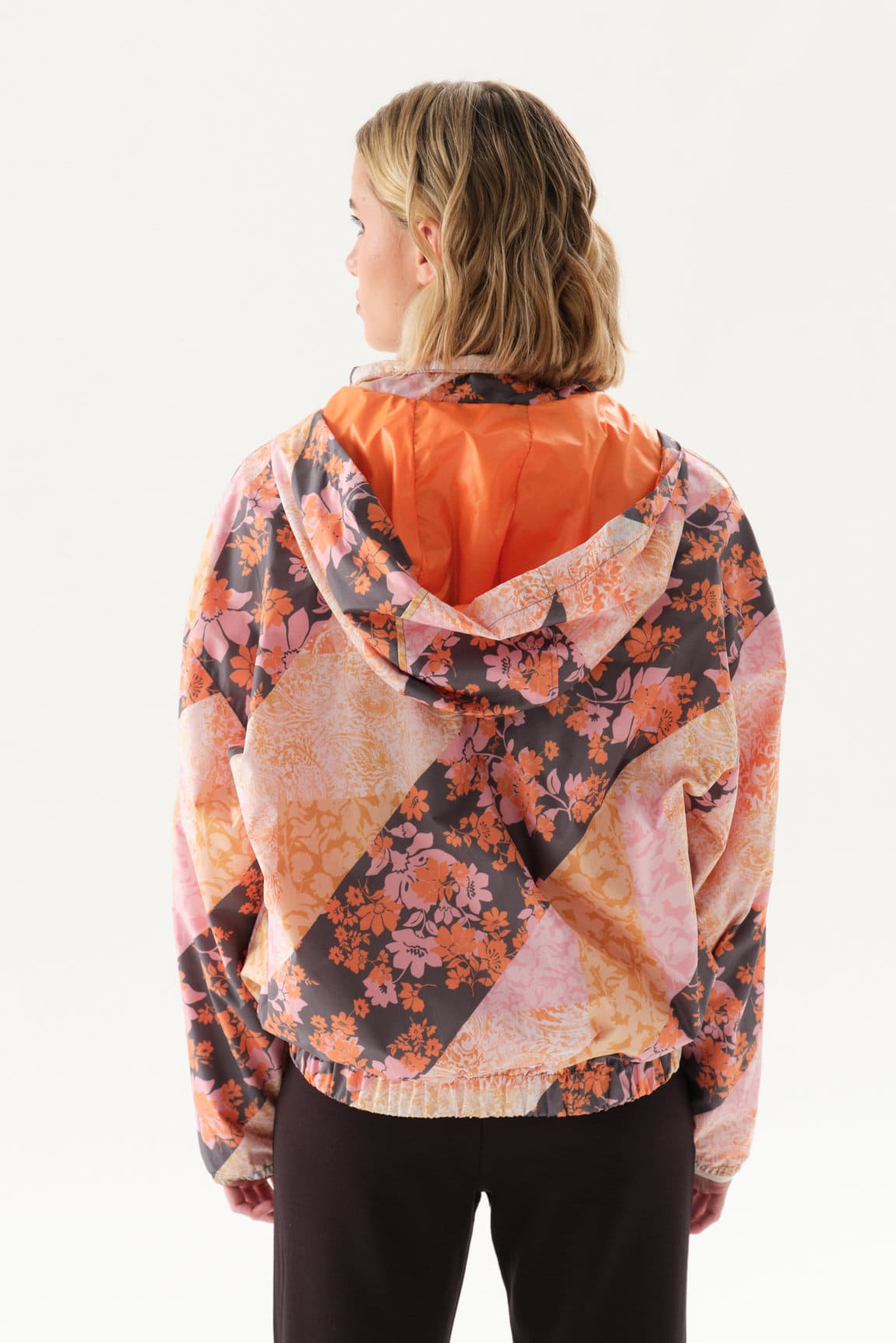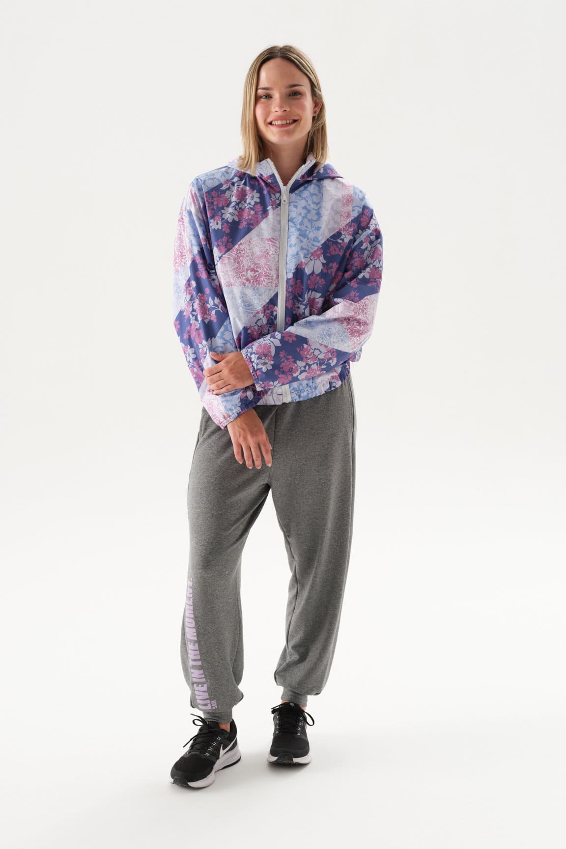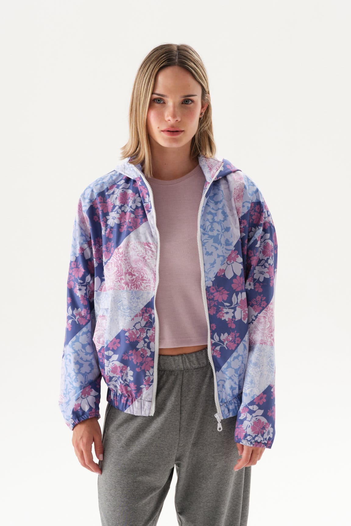 Chaqueta deportiva full print con capucha, cierre central y bolsillos laterales.