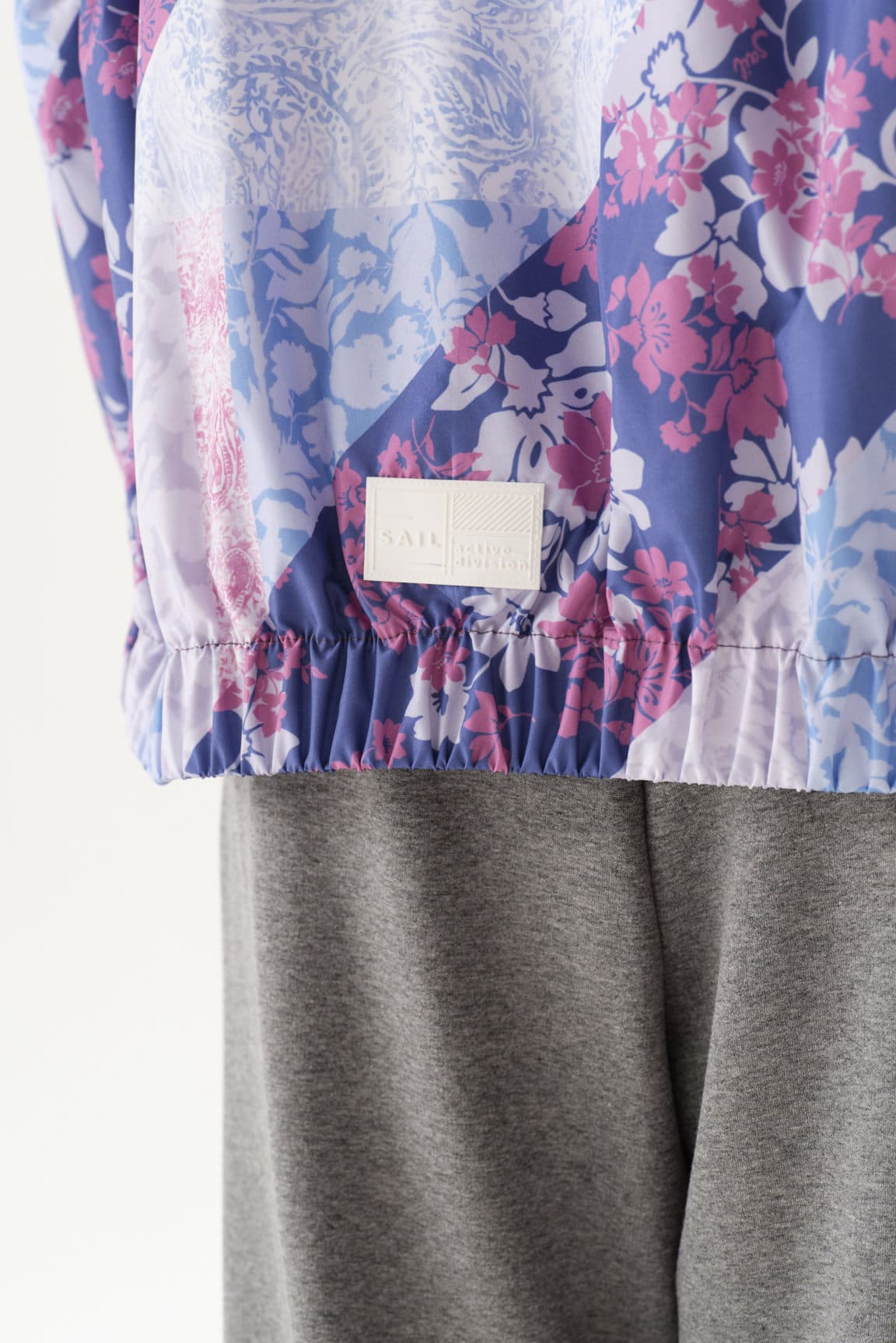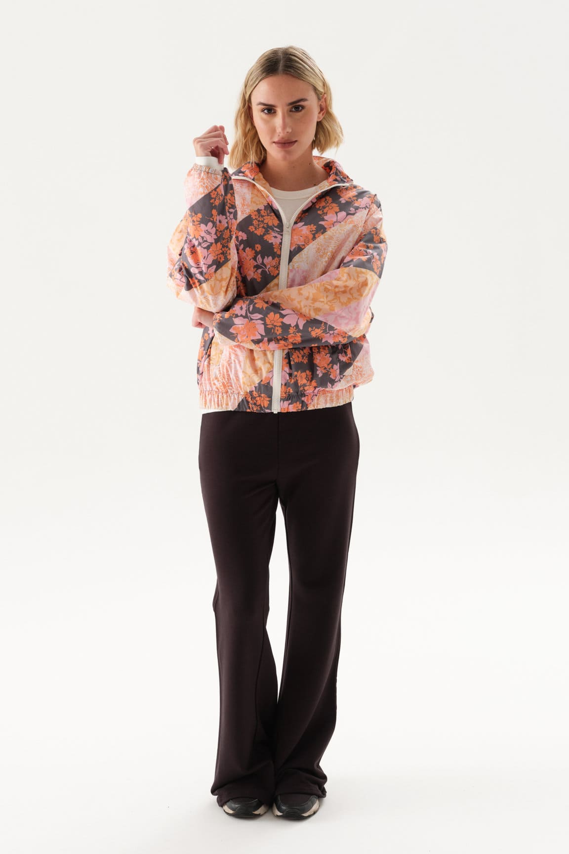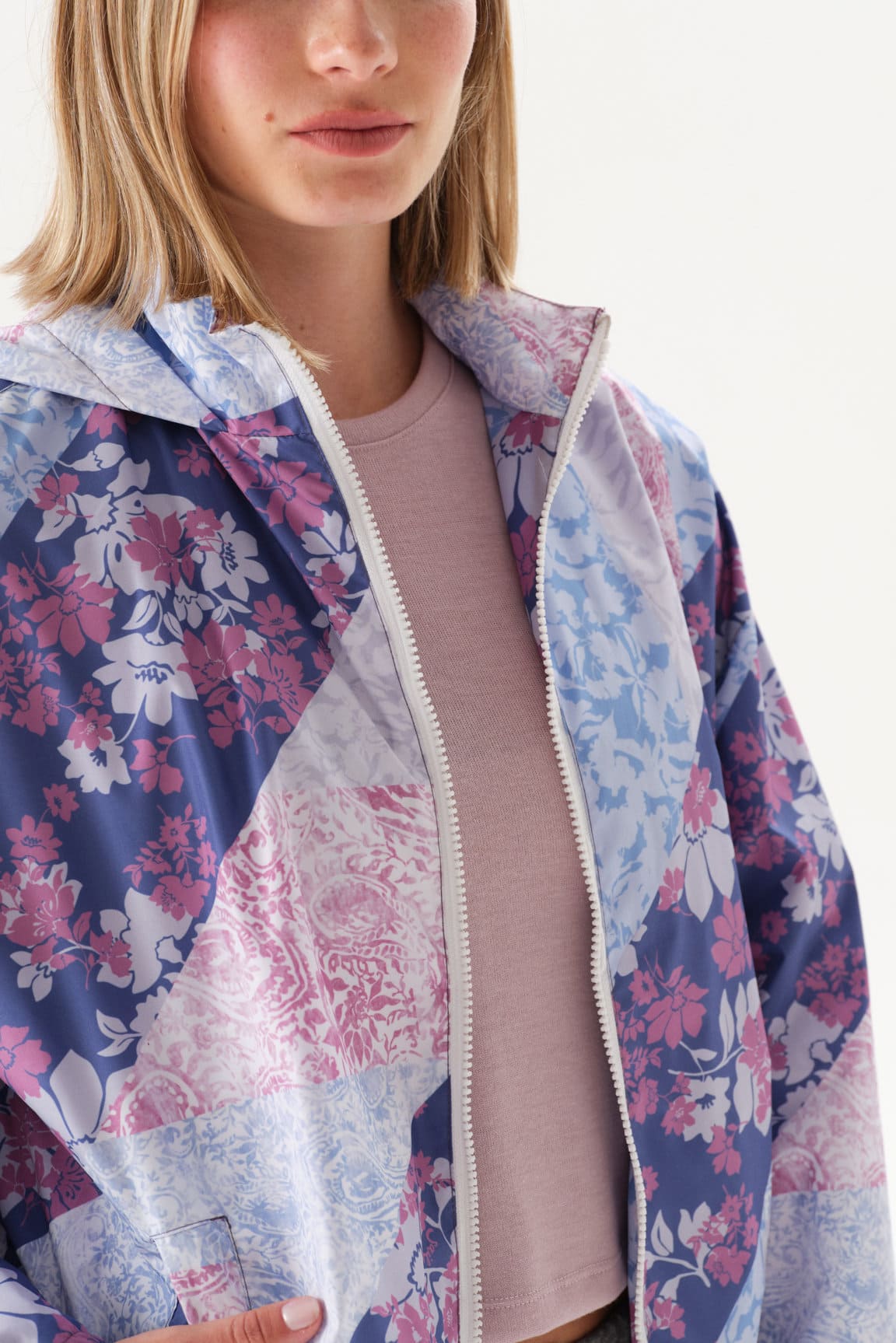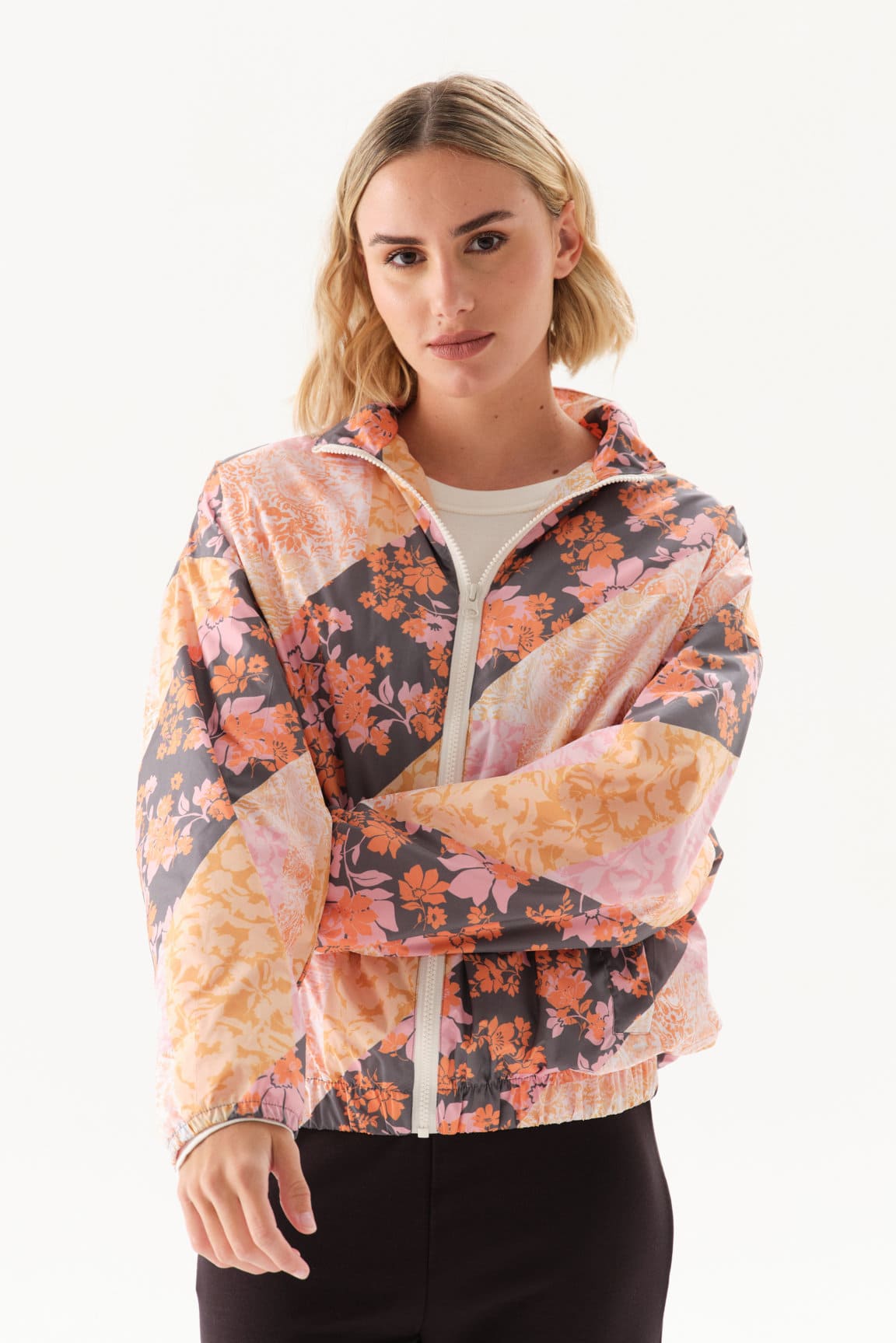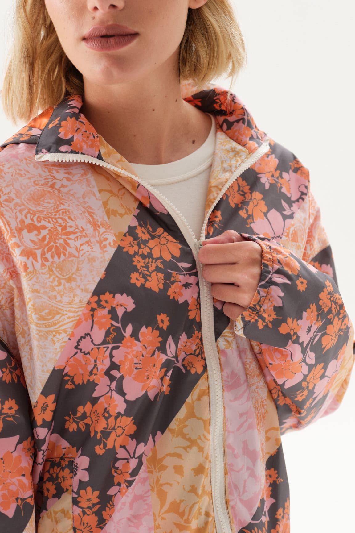 Chaqueta deportiva full print con capucha, cierre central y bolsillos laterales.