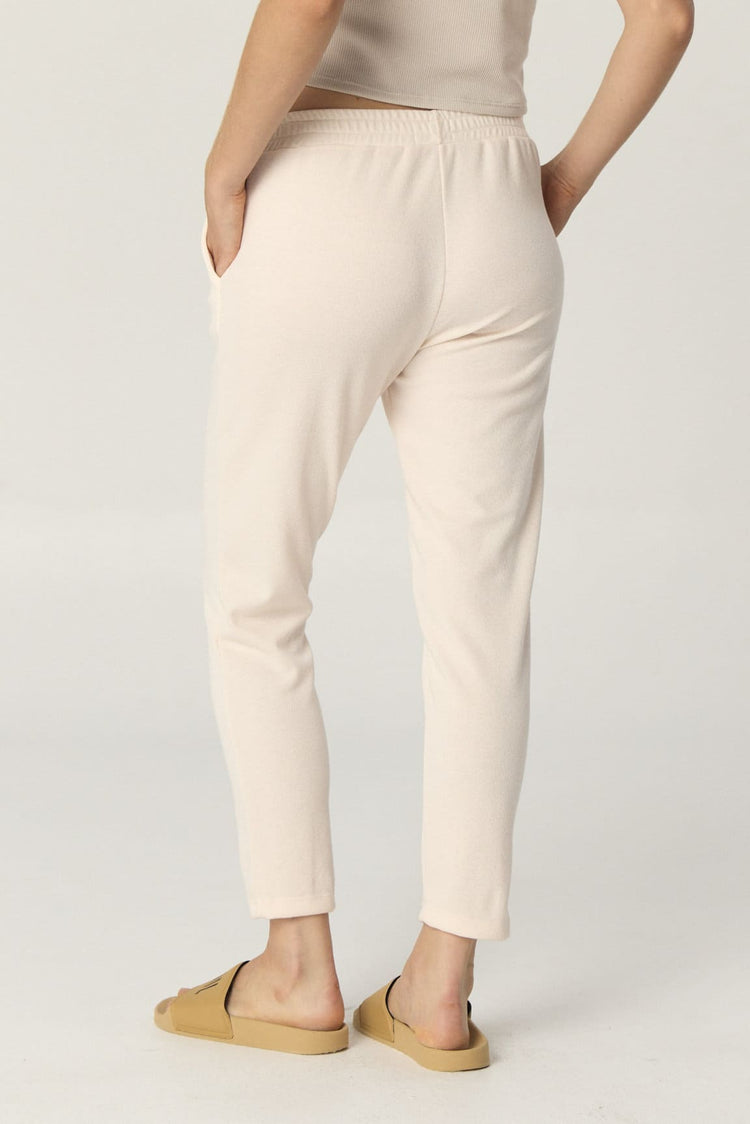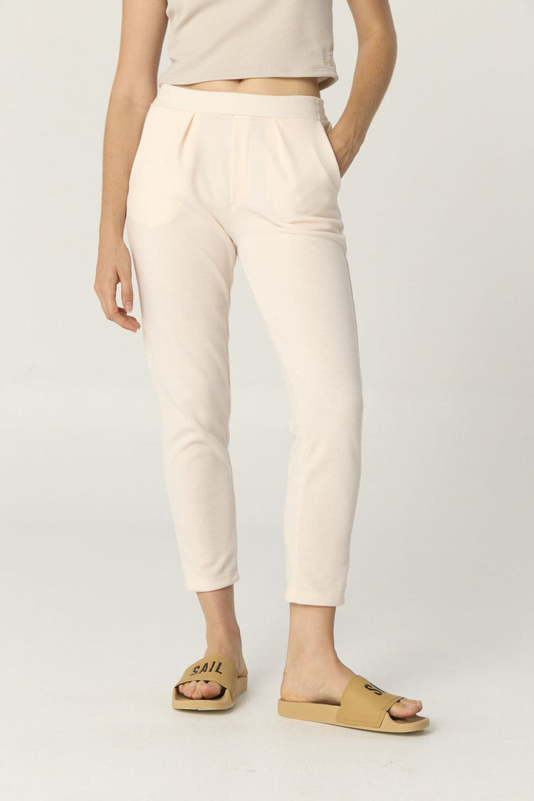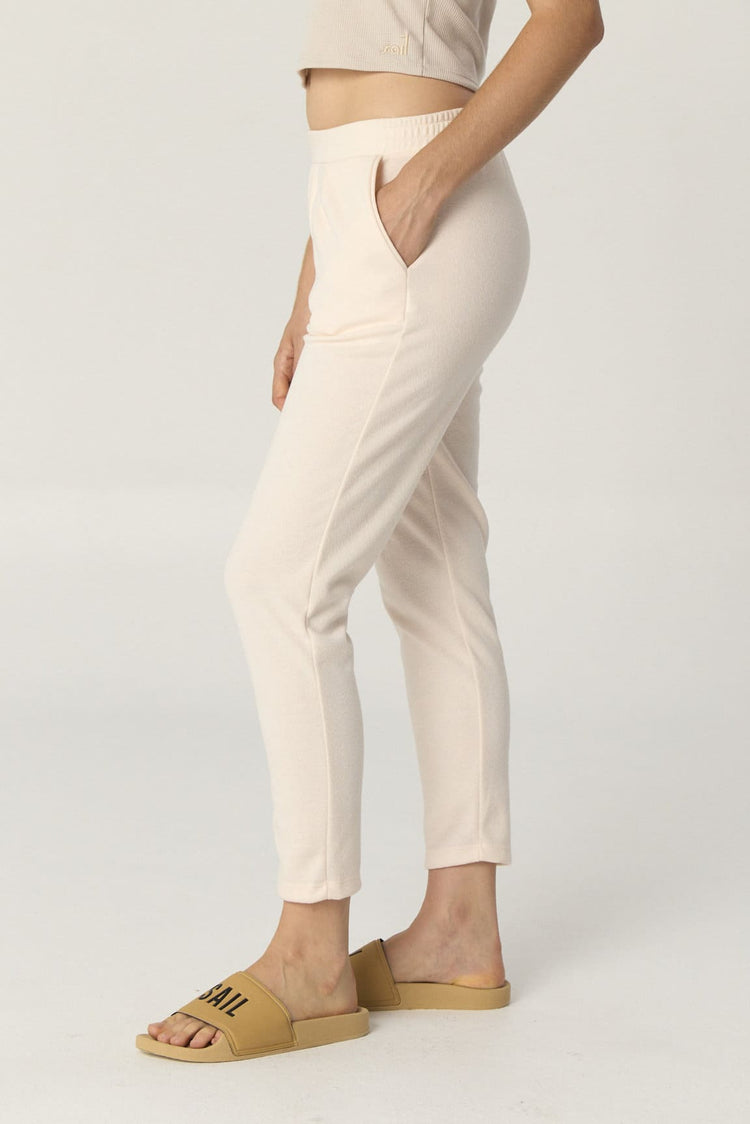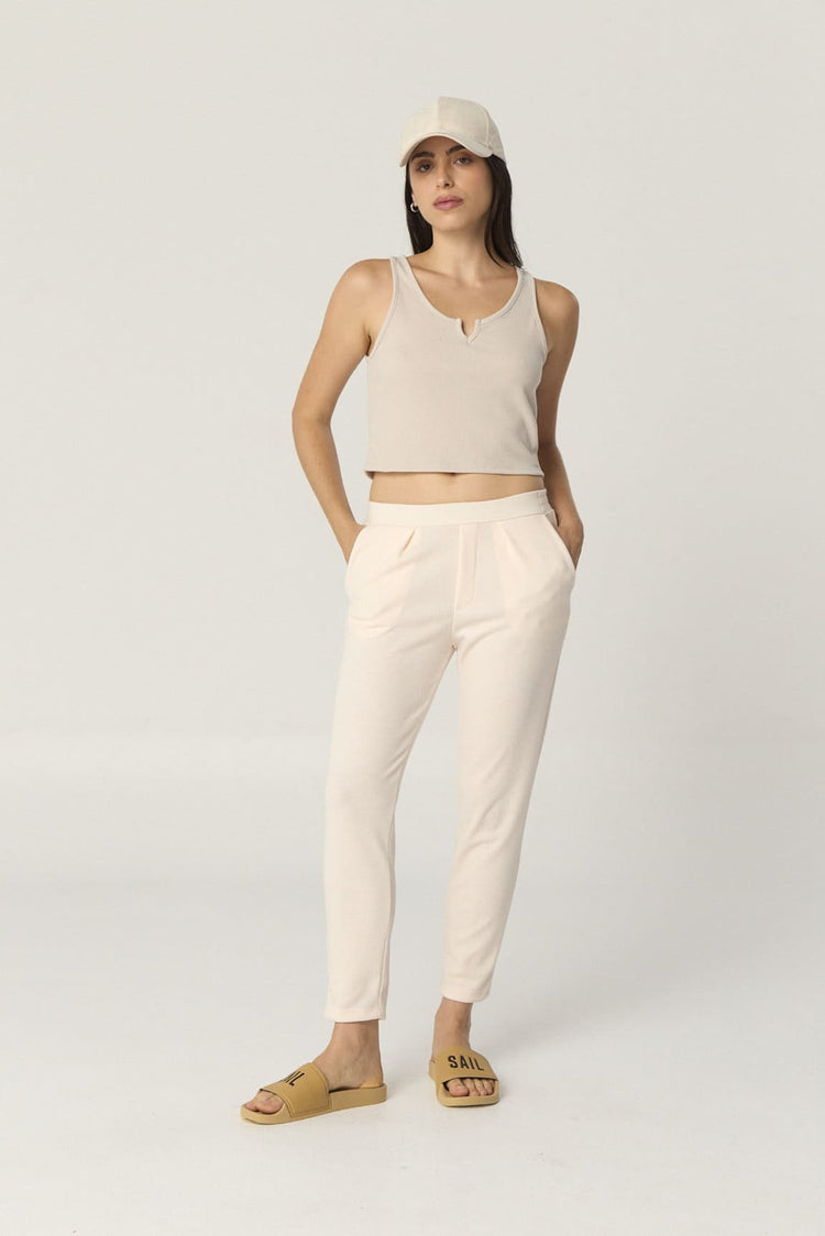 Pantalón liviano de punto con elástico en la cintura, pinzas y vivo en bolsillos.