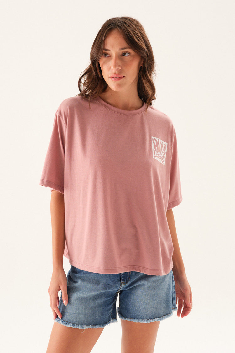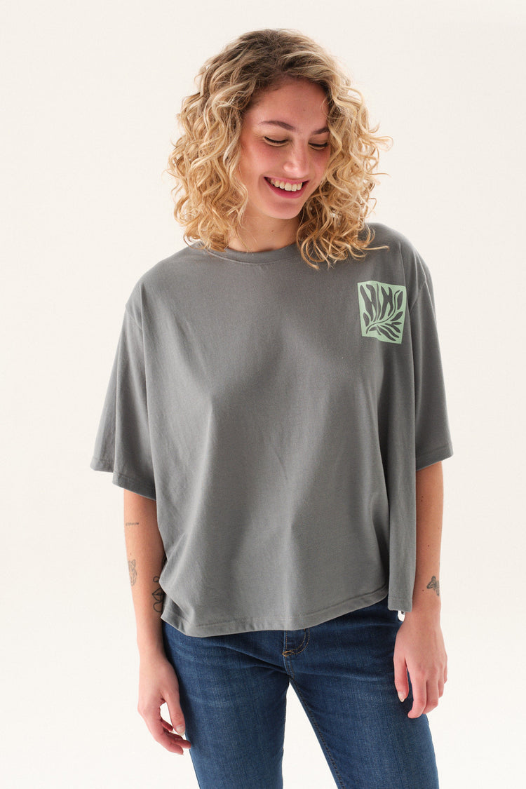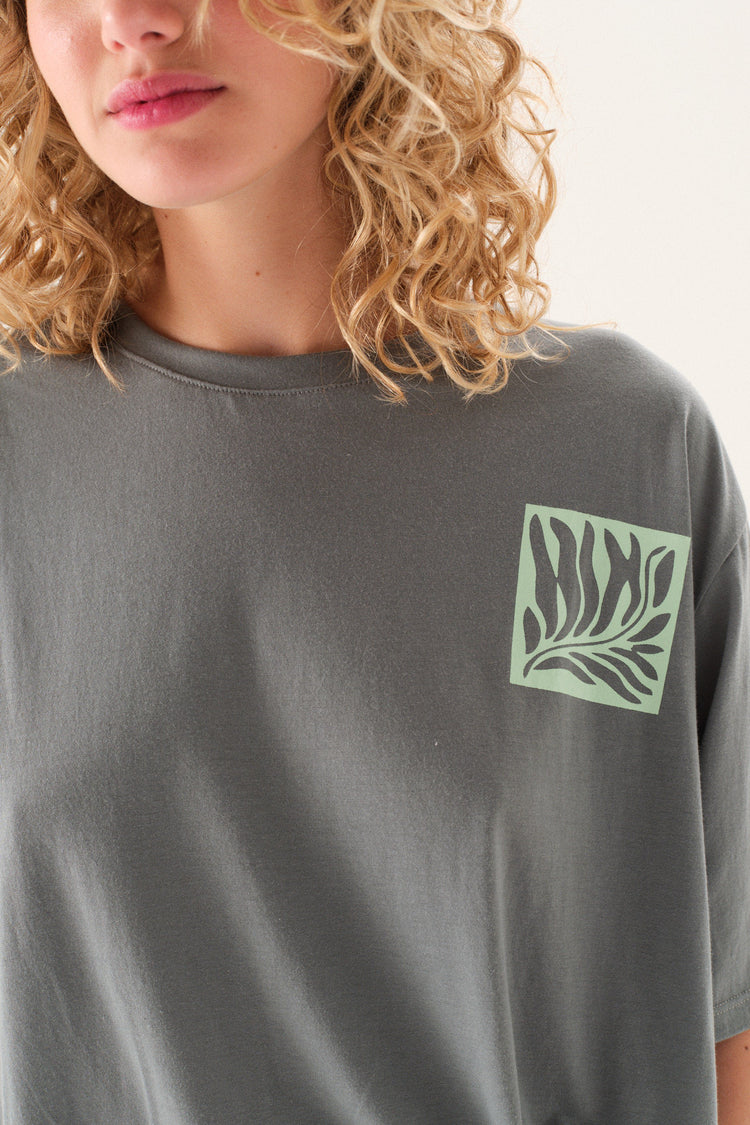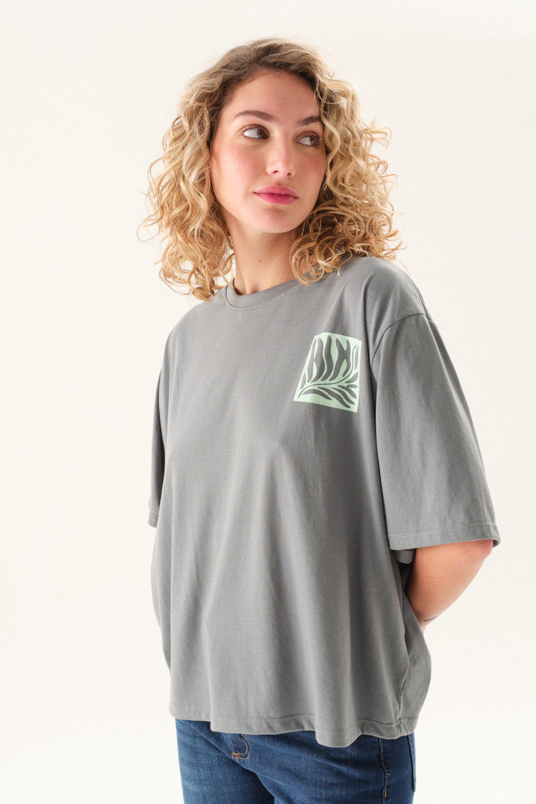 Remera oversize de jersey, con manga corta, escote redondo y estampa pequeña en delantero y espalda.