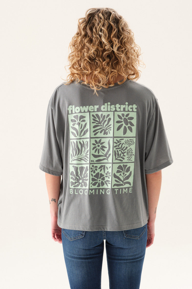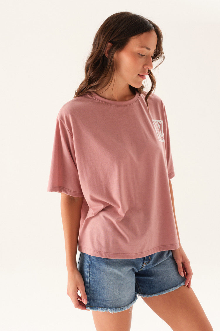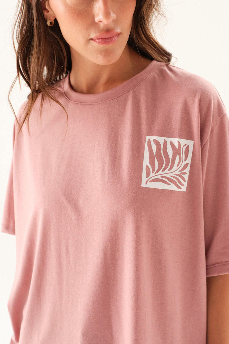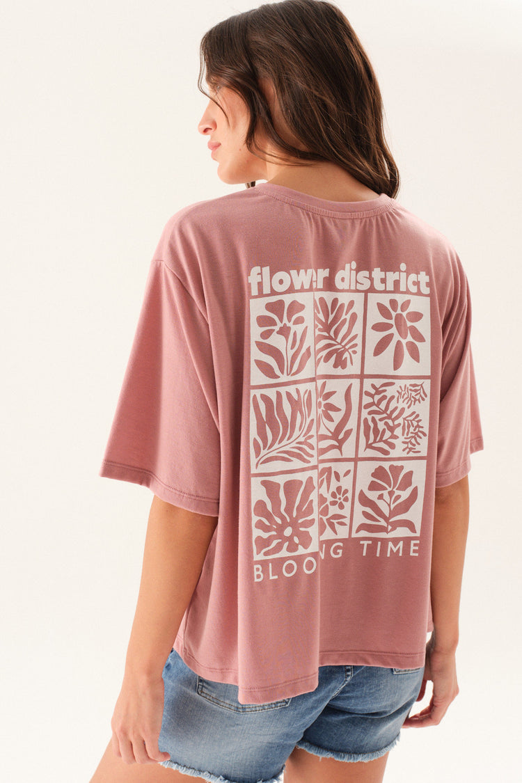 Remera oversize de jersey, con manga corta, escote redondo y estampa pequeña en delantero y espalda.