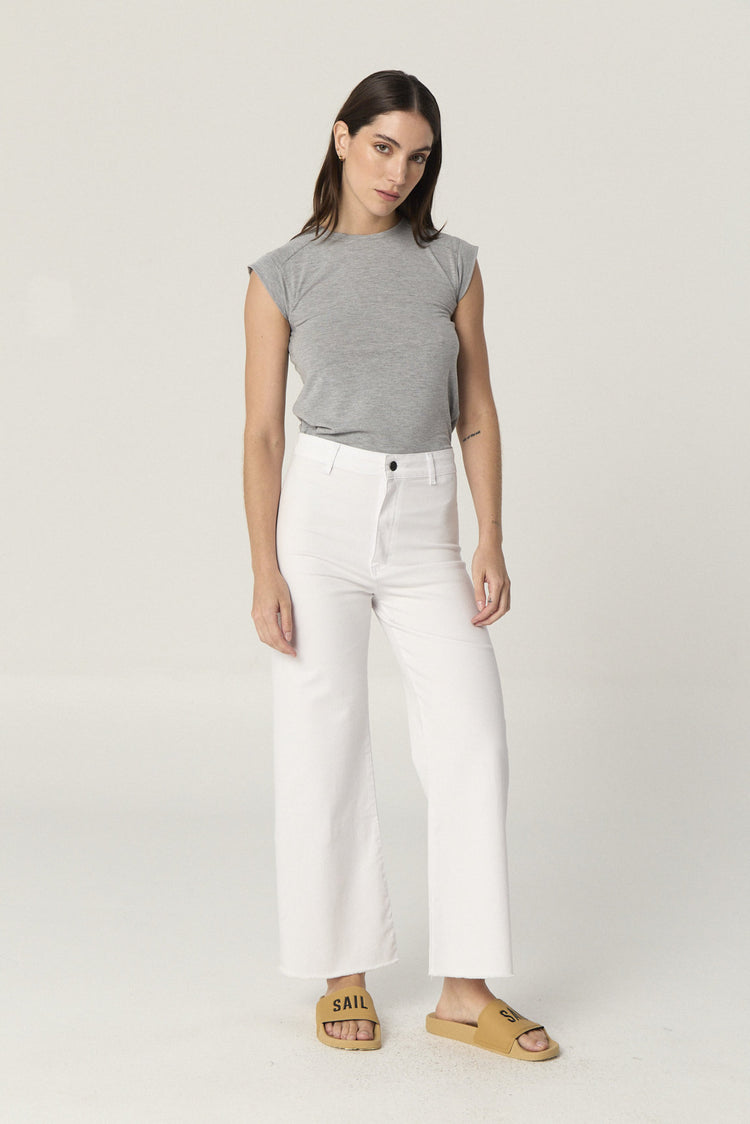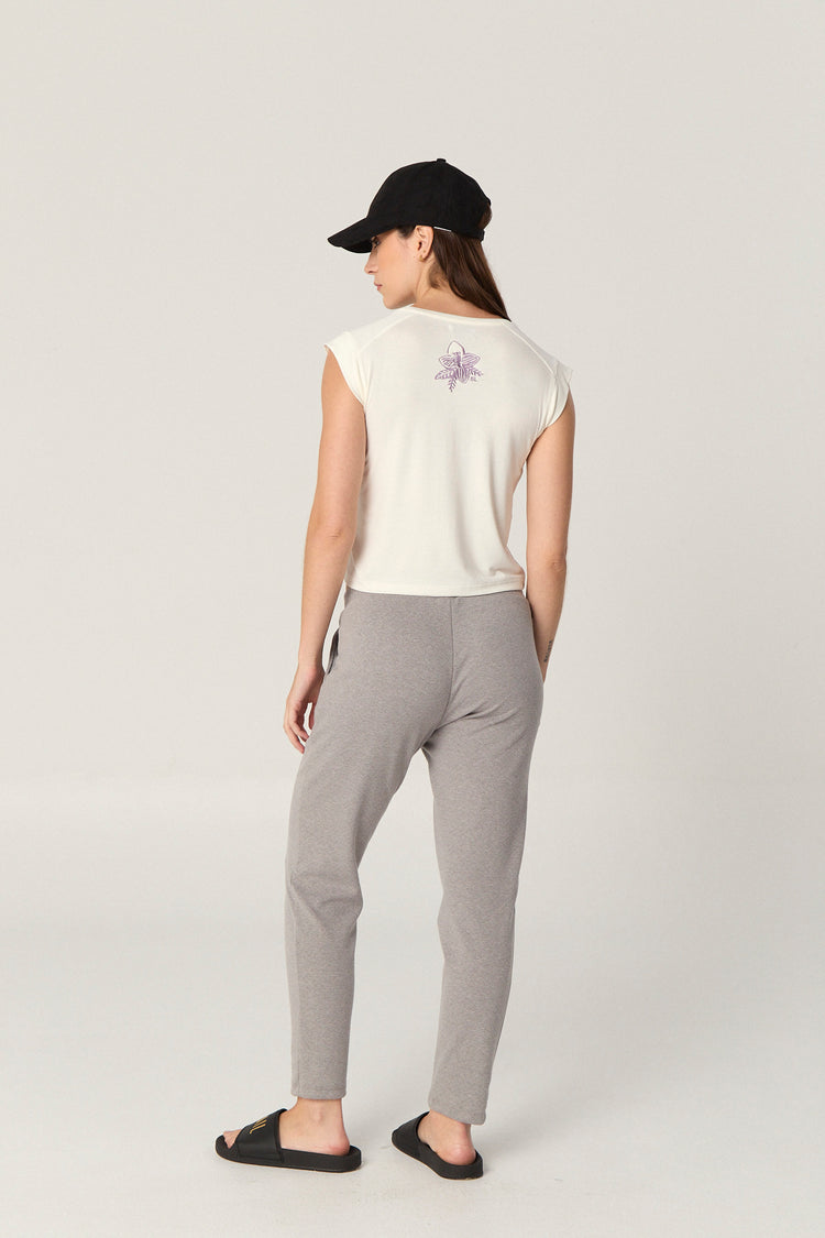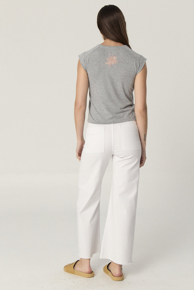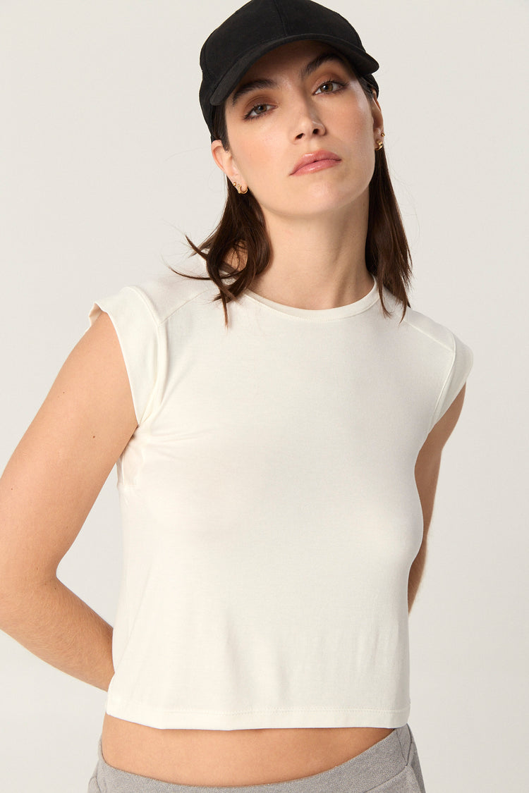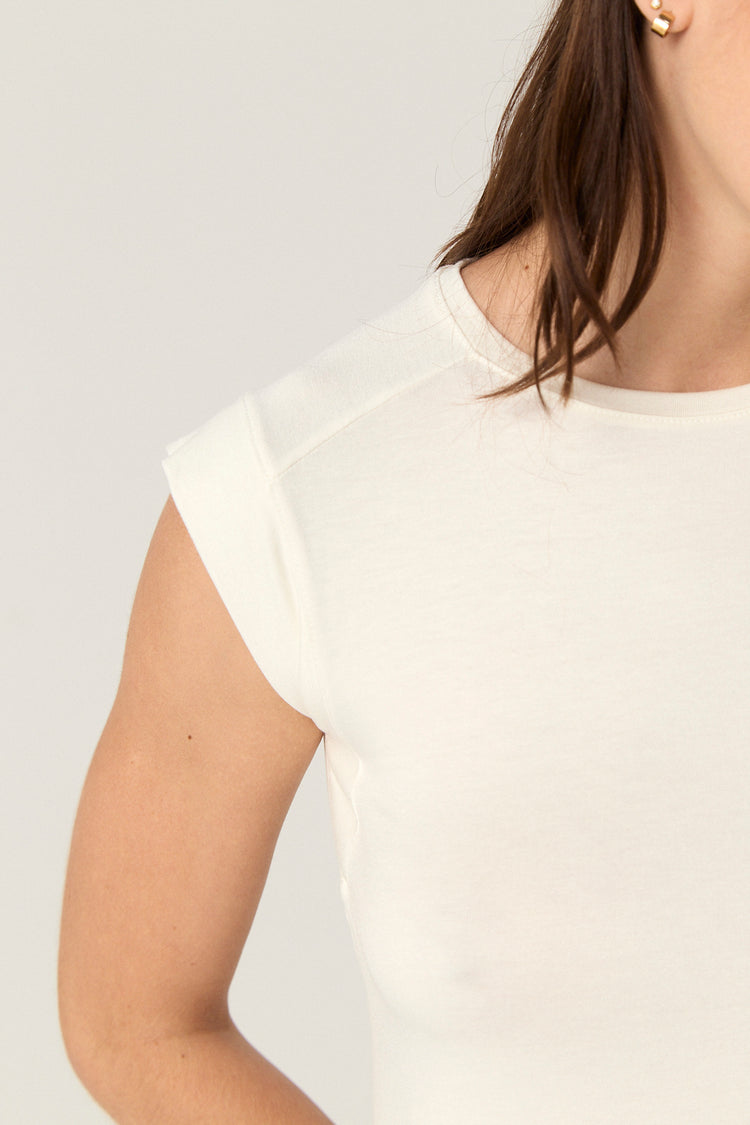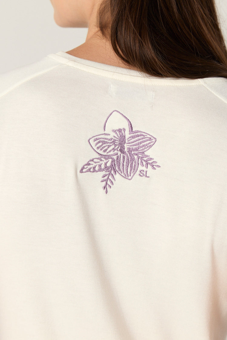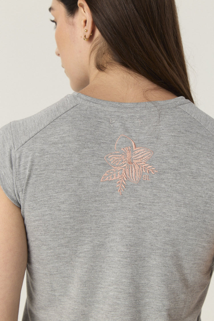 Remera de jersey viscosa con escote redondo, recorte en manga y canesú con bordado en la espalda.