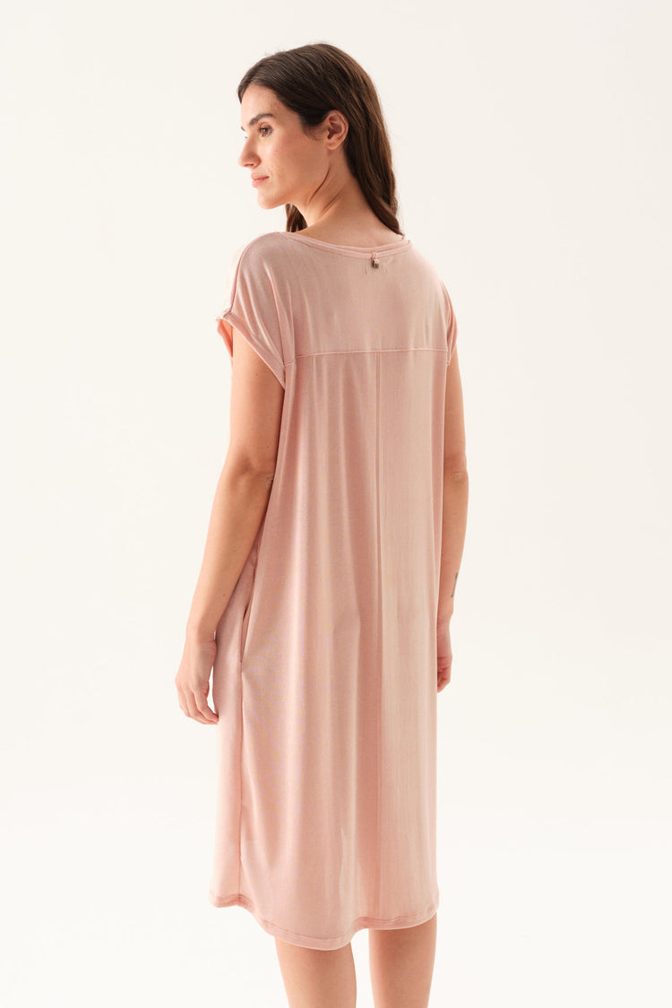 Vestido corto sin mangas, con ruedo irregular y bolsillos laterales.