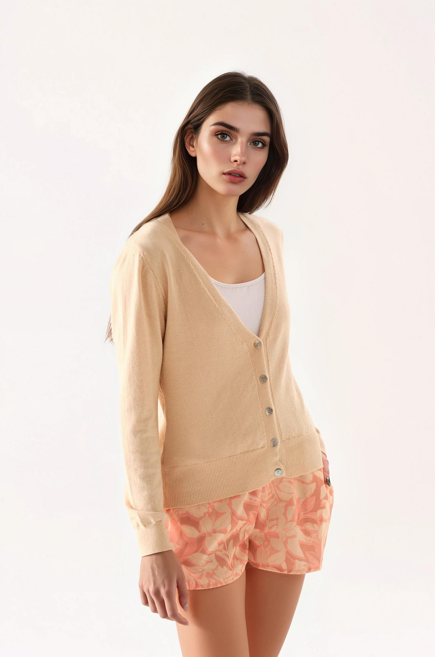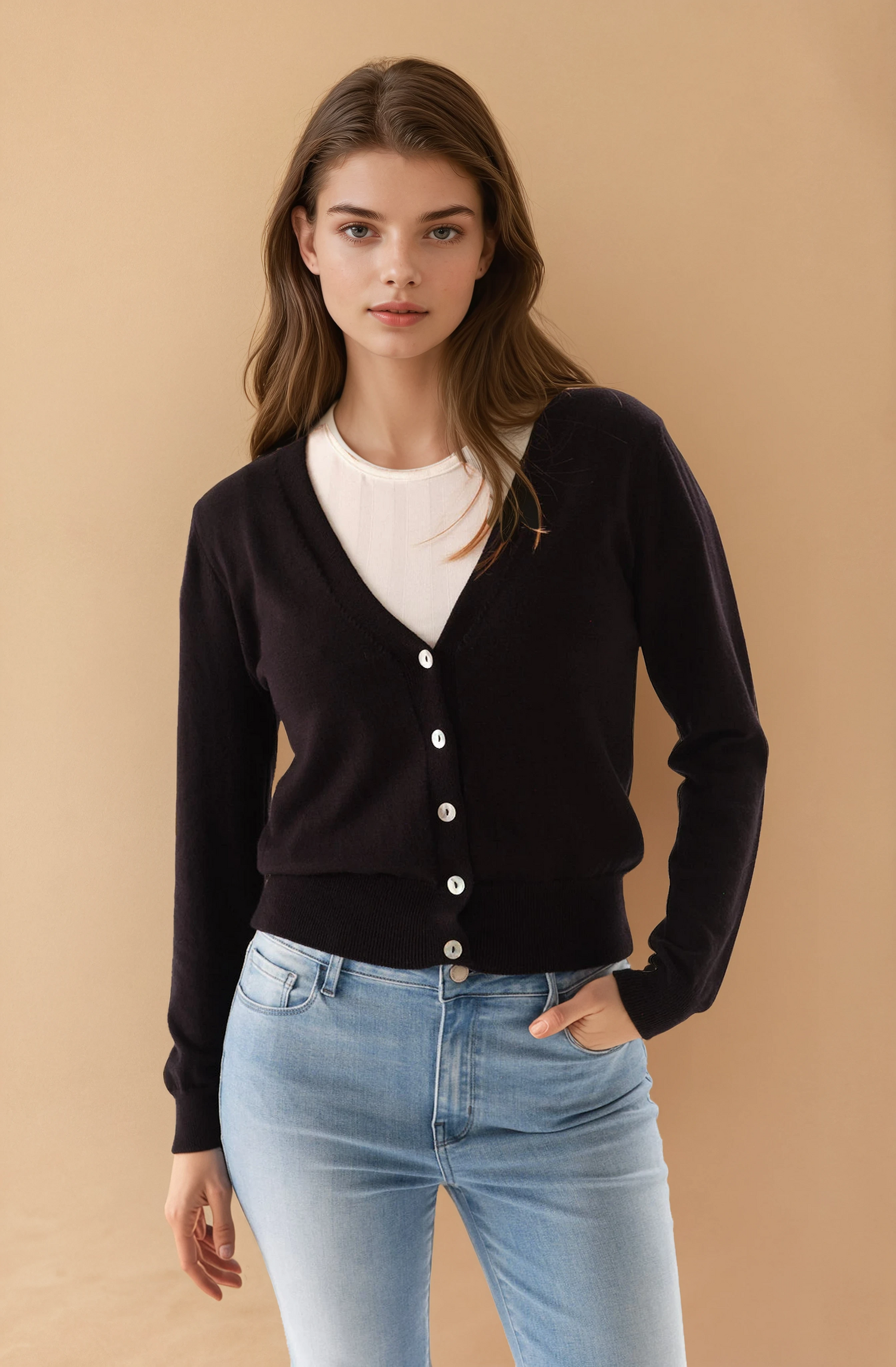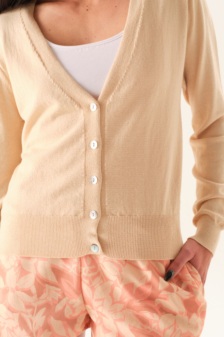 Cárdigan de viscosa, con sisas menguadas, escote en v, cartera frontal con botones, con puños en terminación de mangas y cuerpo