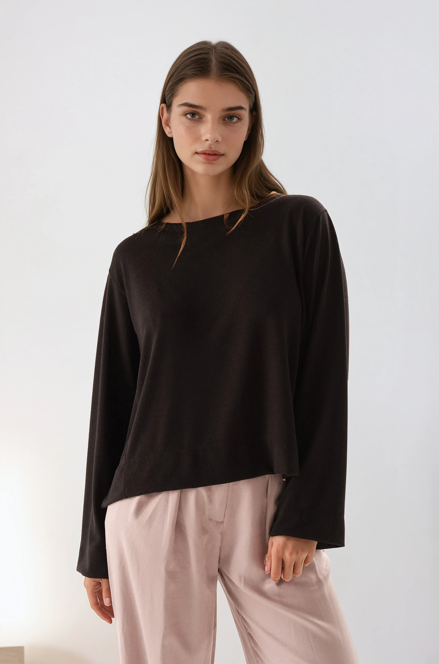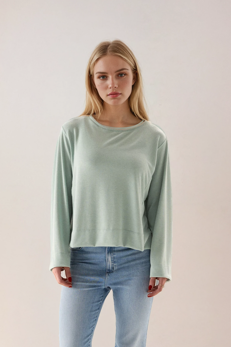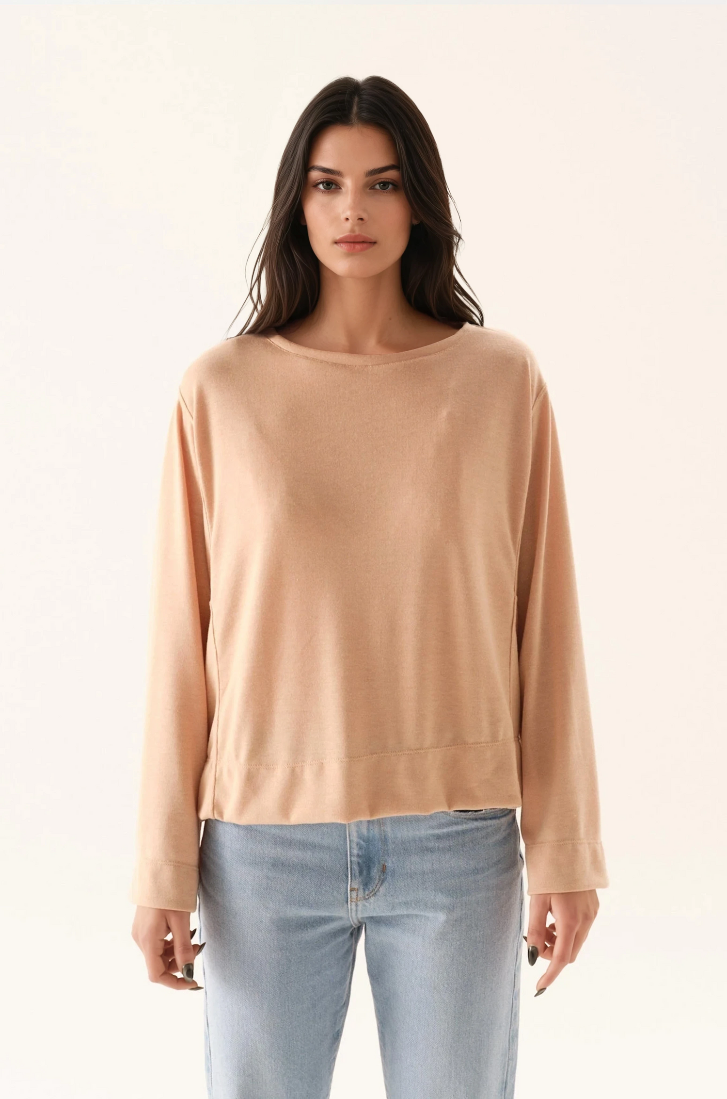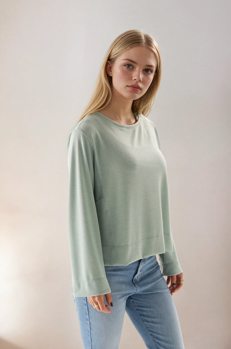 Sweater de lanilla soft, con escote redondo, recortes en frente y espalda, tajos laterales y puños anchos en terminación.