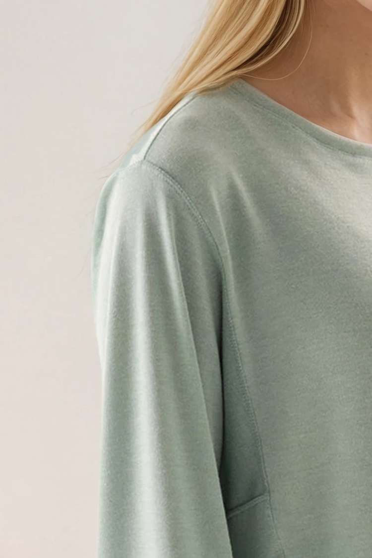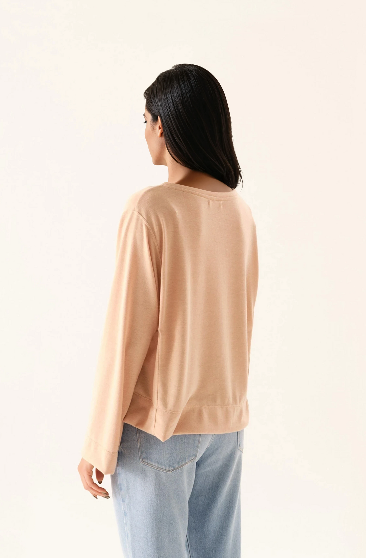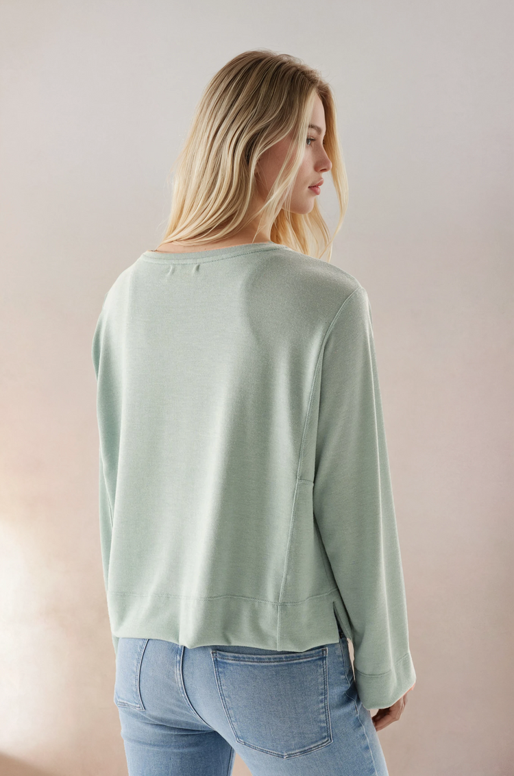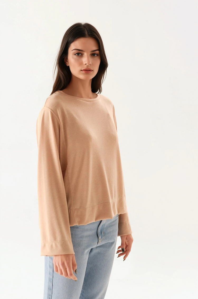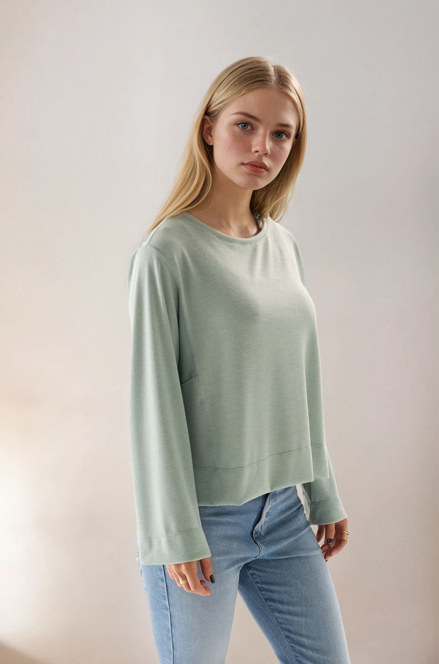 Sweater de lanilla soft, con escote redondo, recortes en frente y espalda, tajos laterales y puños anchos en terminación.