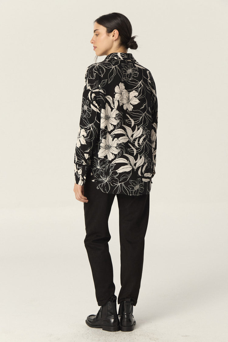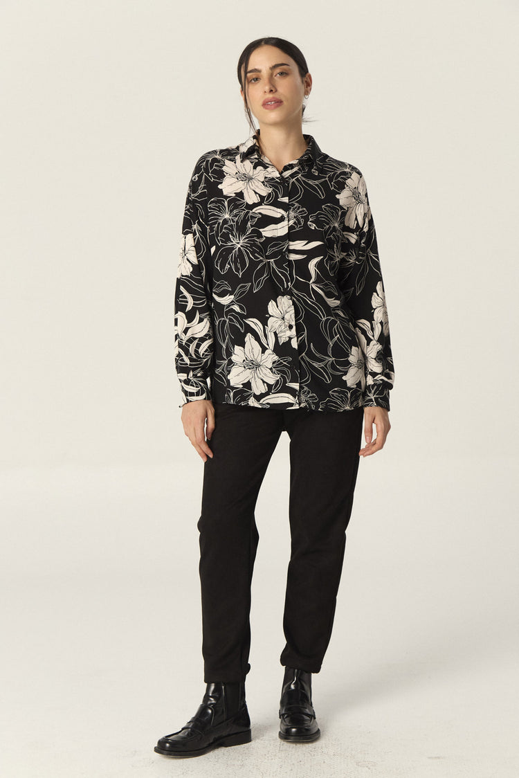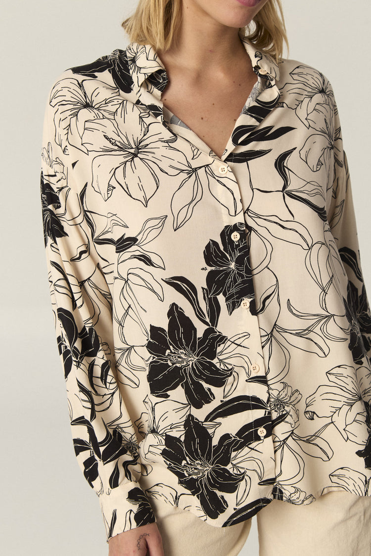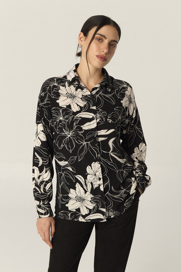 Camisa de rayón estampado amplia, con manga larga. Tiene tajos laterales en el ruedo