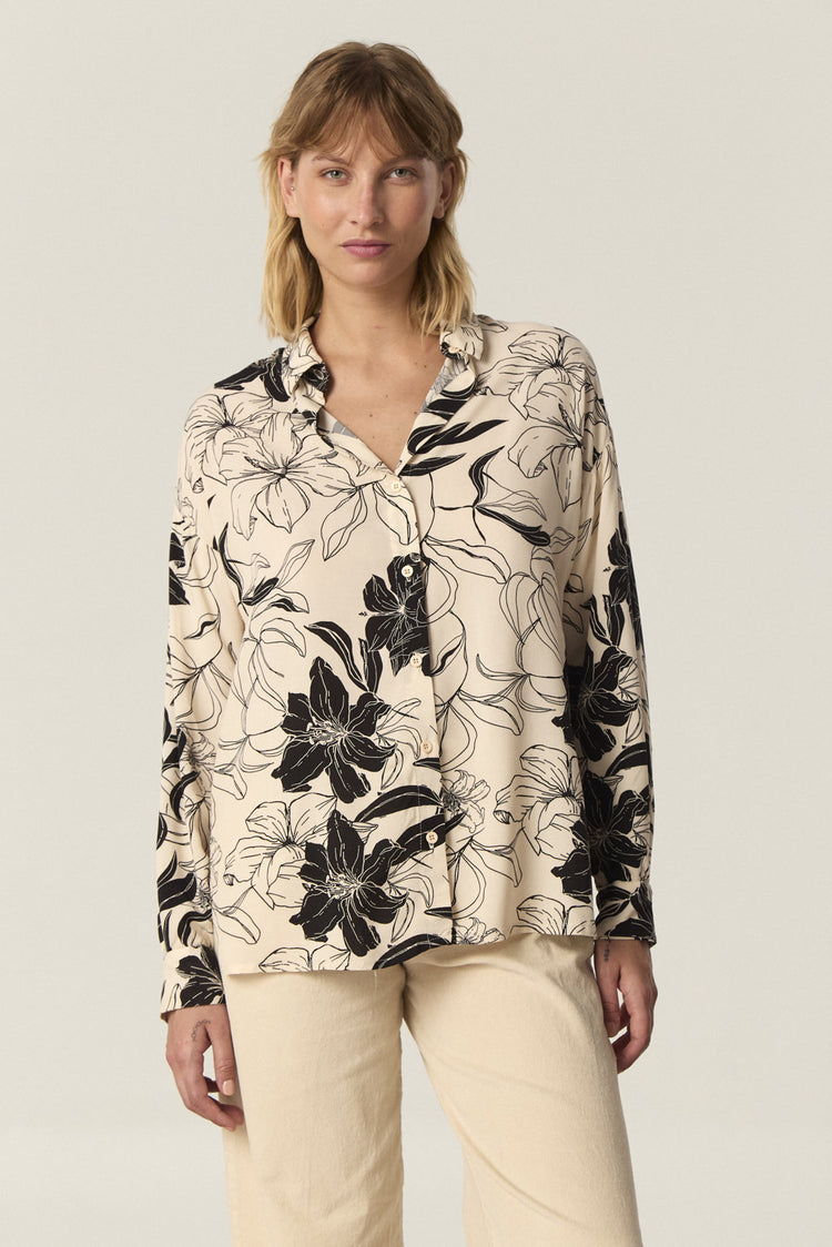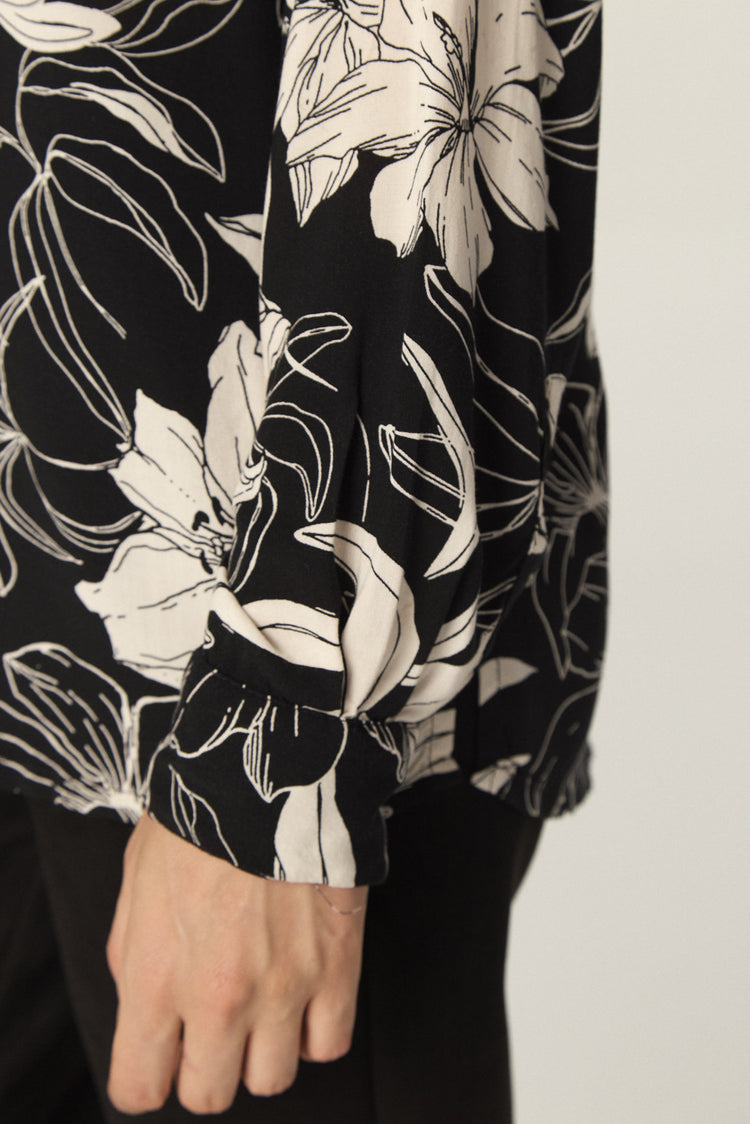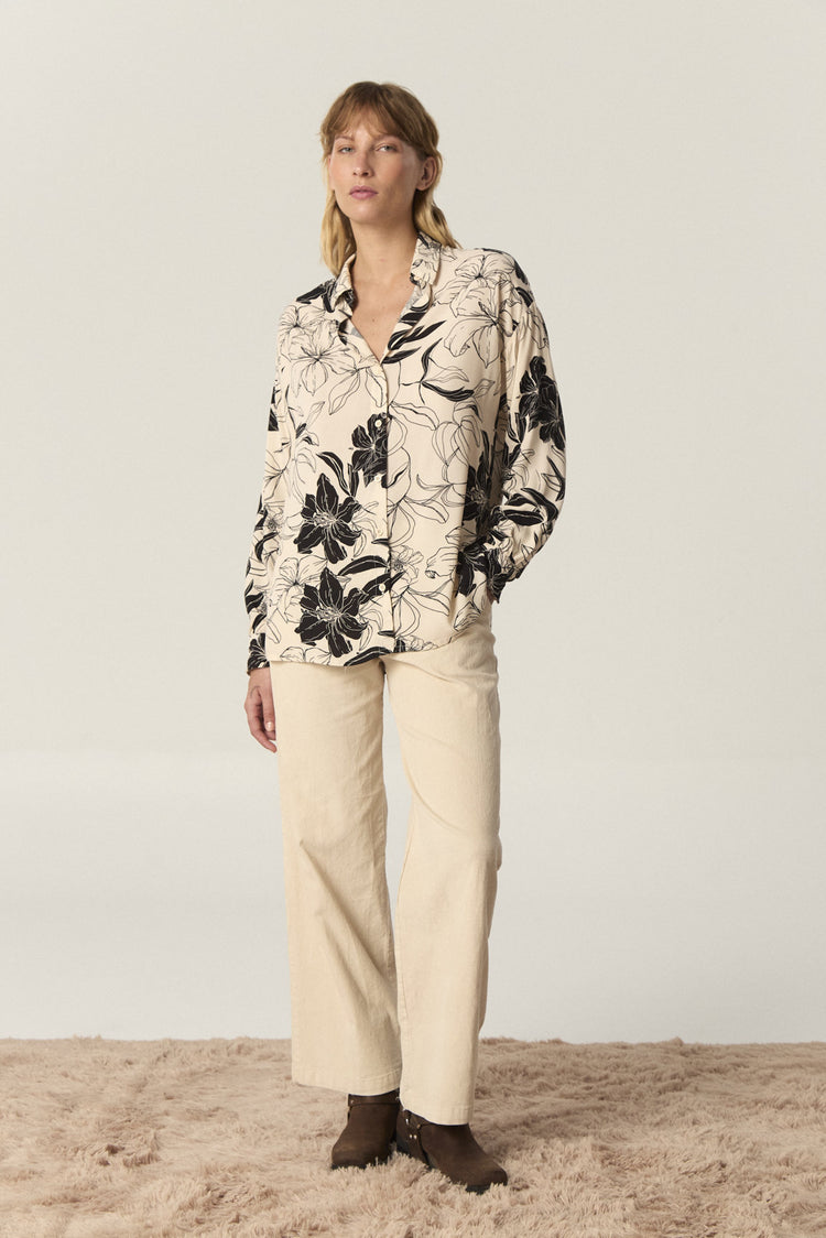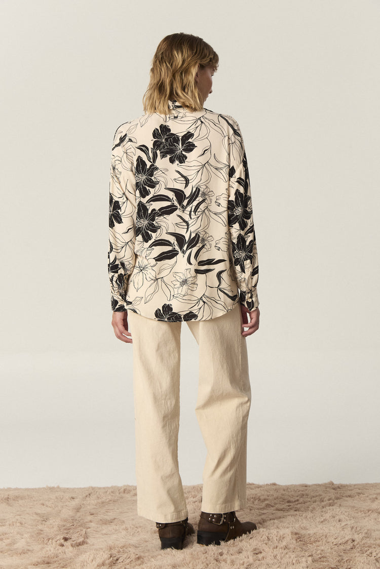 Camisa de rayón estampado amplia, con manga larga. Tiene tajos laterales en el ruedo