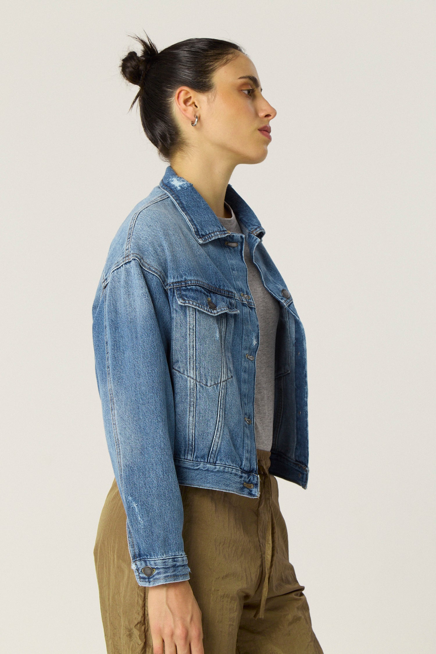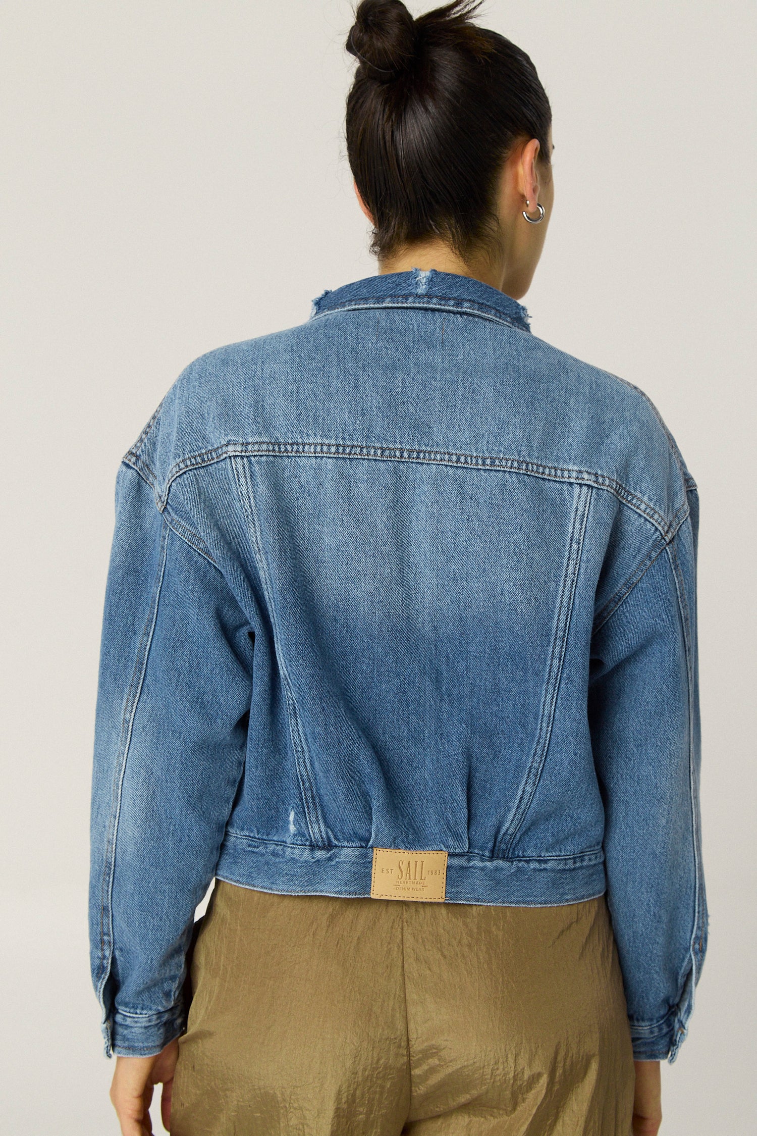 Campera de jean corta con pinzas en espalda, lavada con roturas.