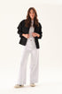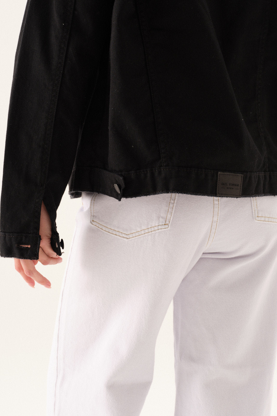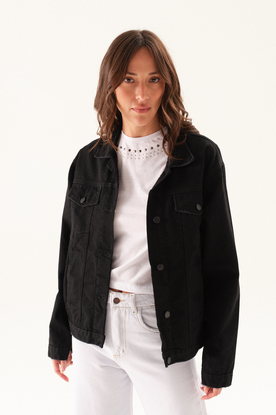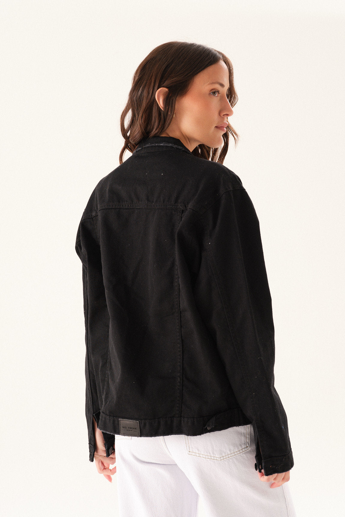 Campera de jean negra, oversize, con desgastes en puños y bolsillos.