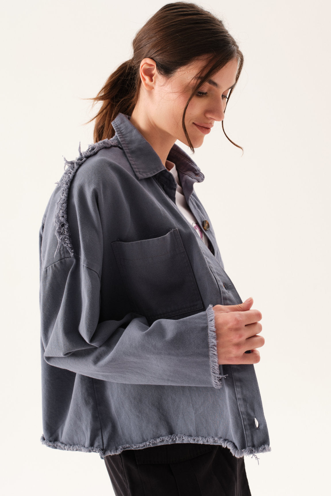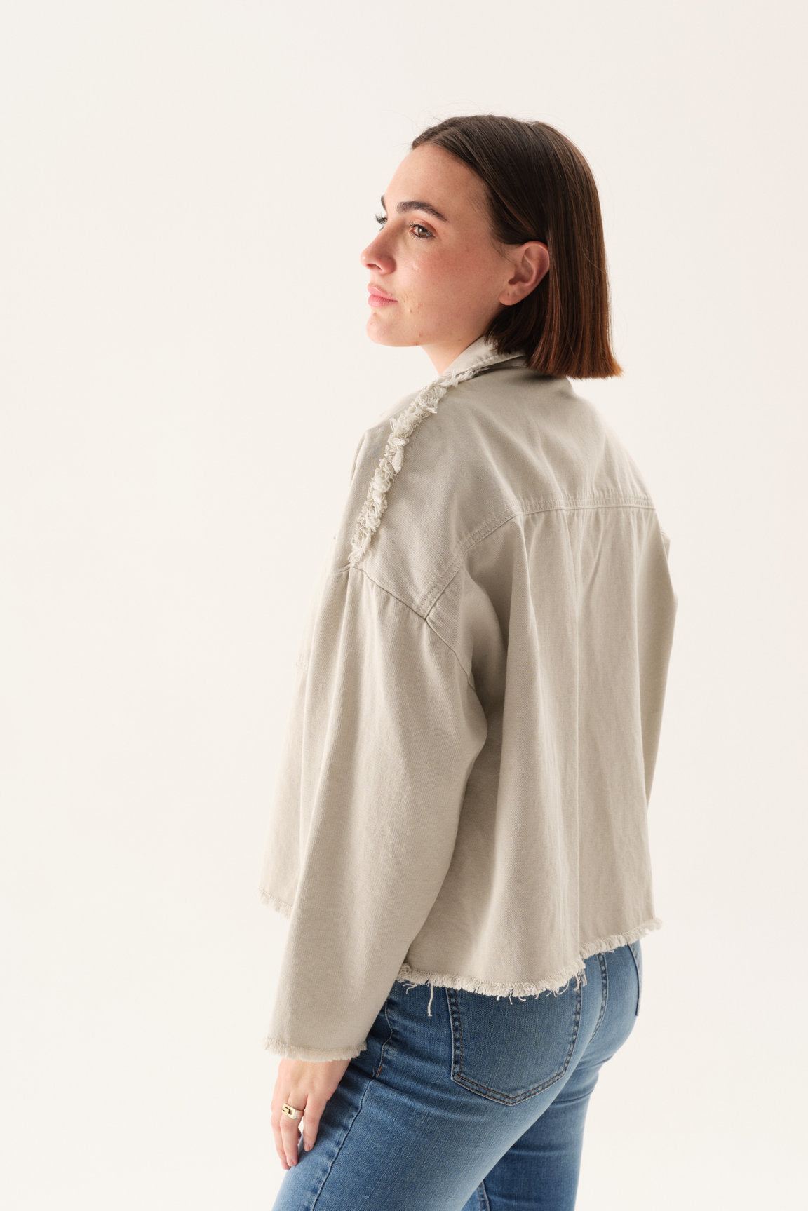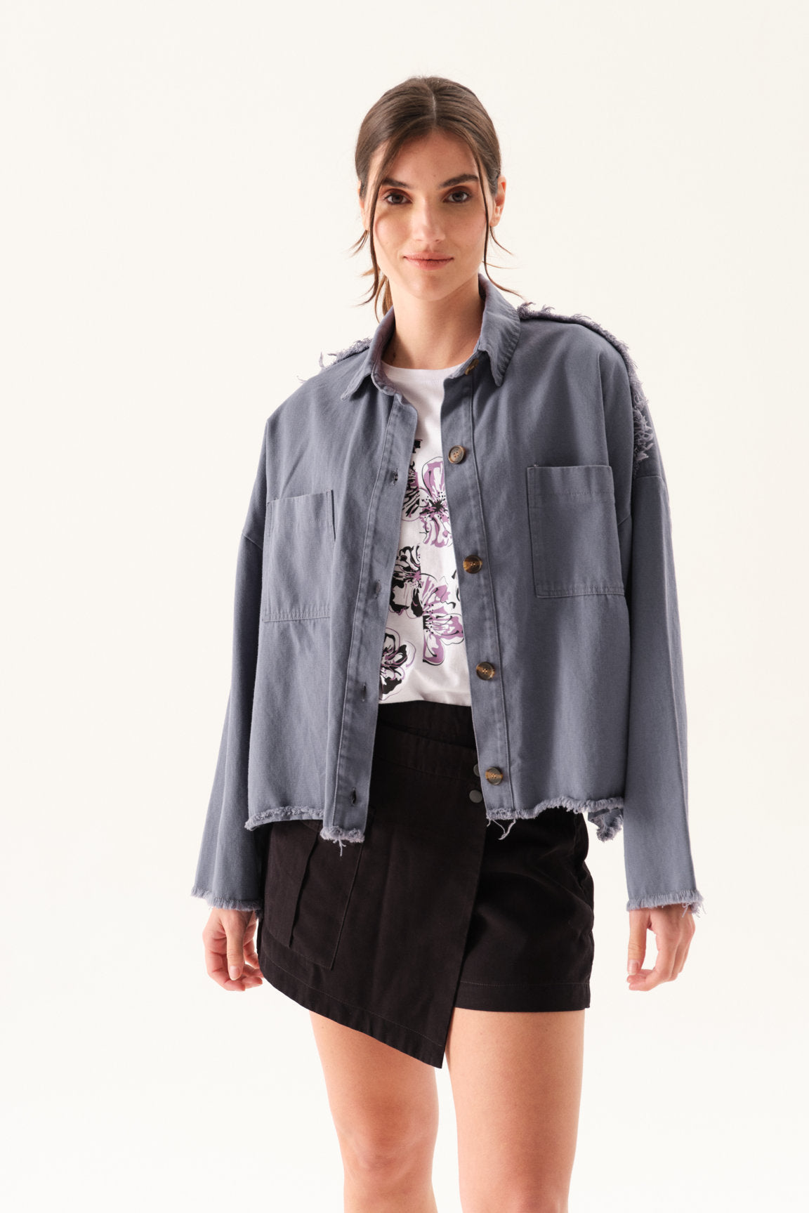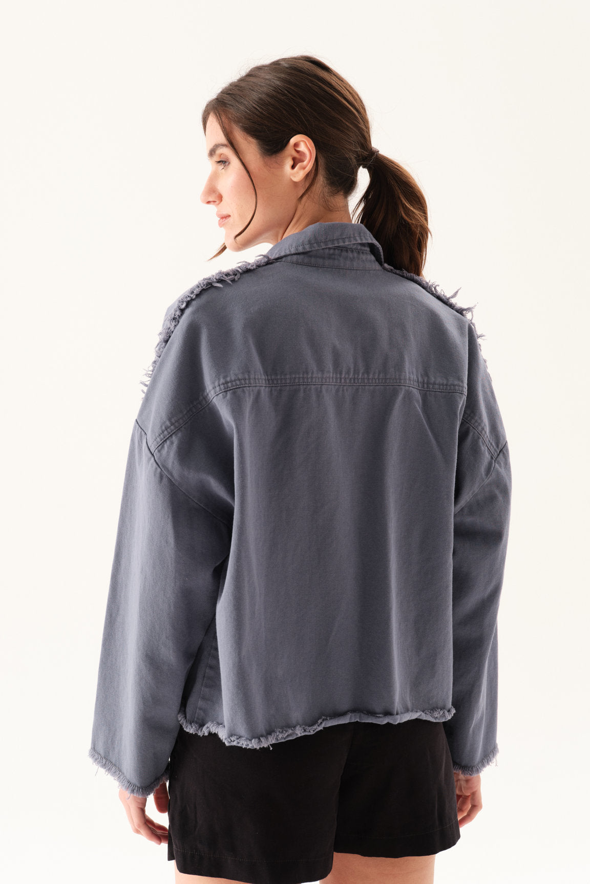 Chaqueta amplia de gabardina pesada con detalles al corte deshilachados.