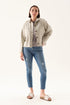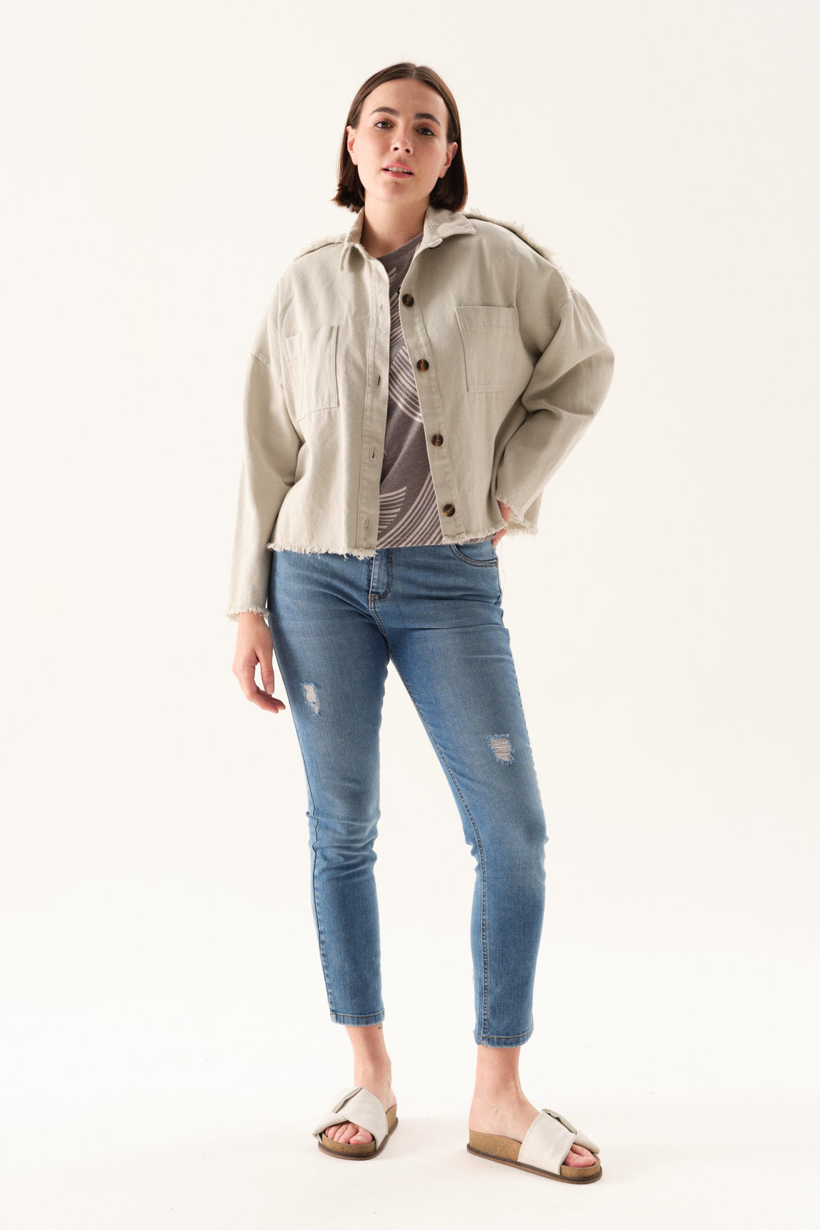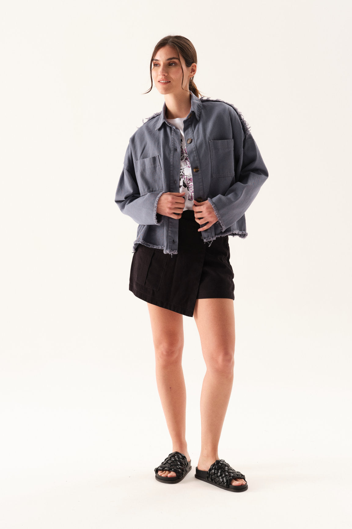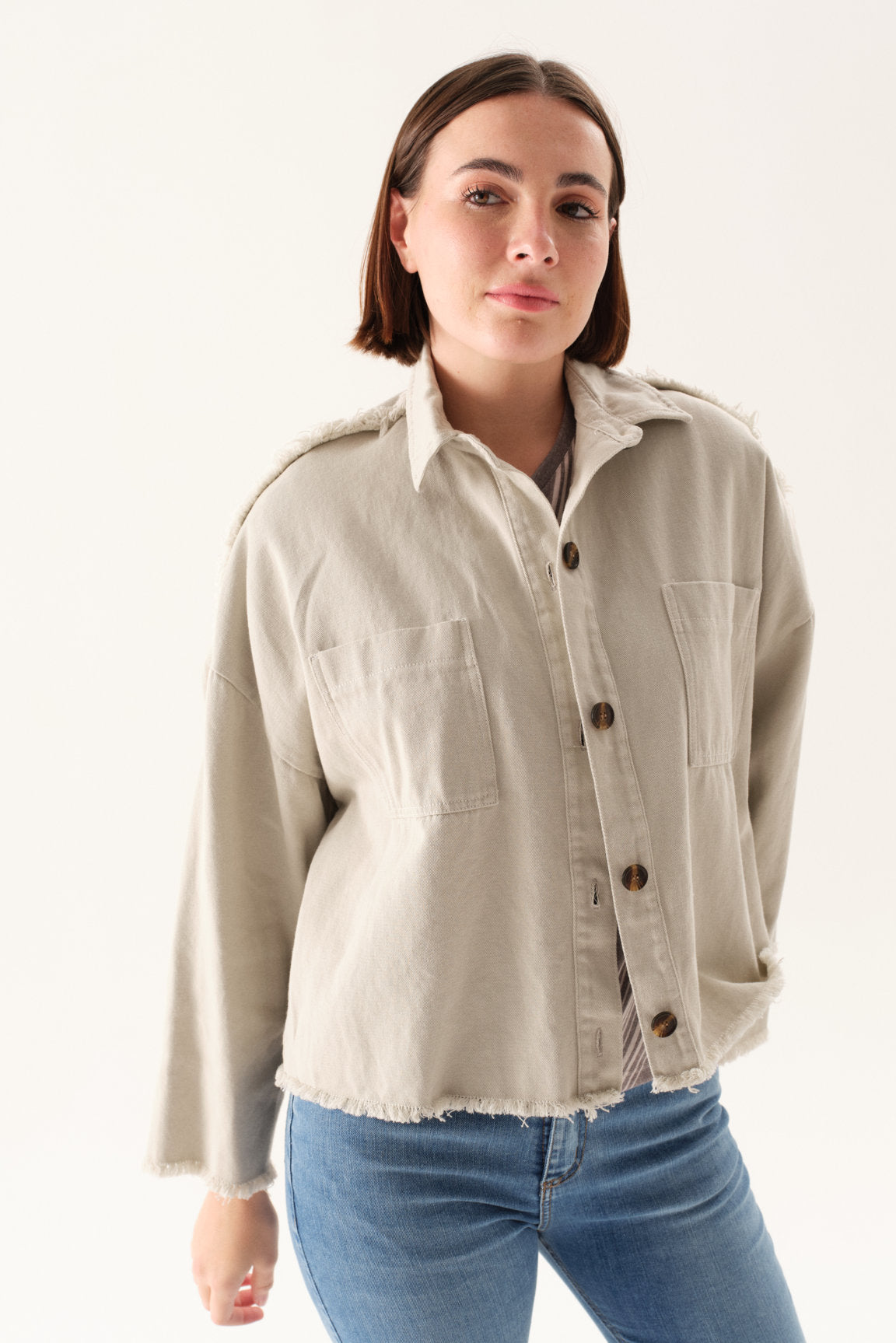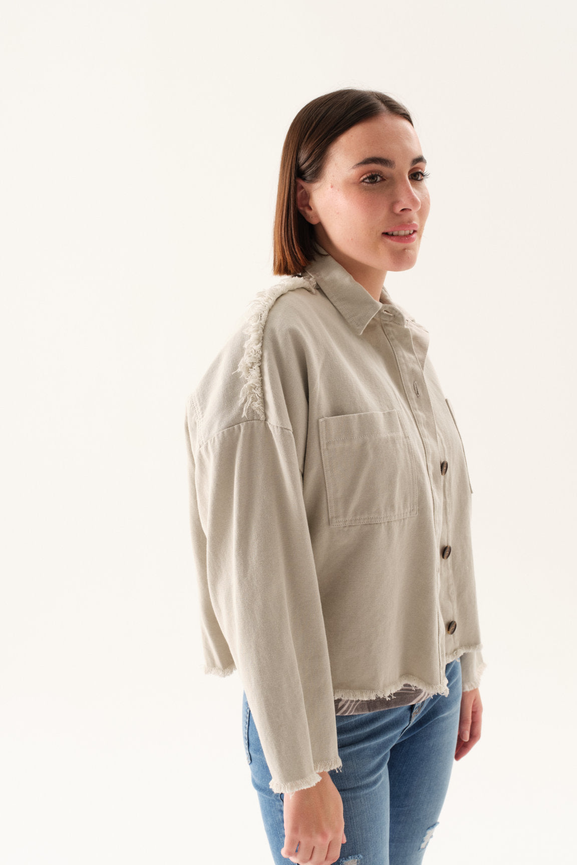 Chaqueta amplia de gabardina pesada con detalles al corte deshilachados.
