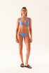 Corpiño triangulo con aro, breteles regulables y broche en espalda. Bombacha tipo vedetina con elástico en trasero y tiras regulables.