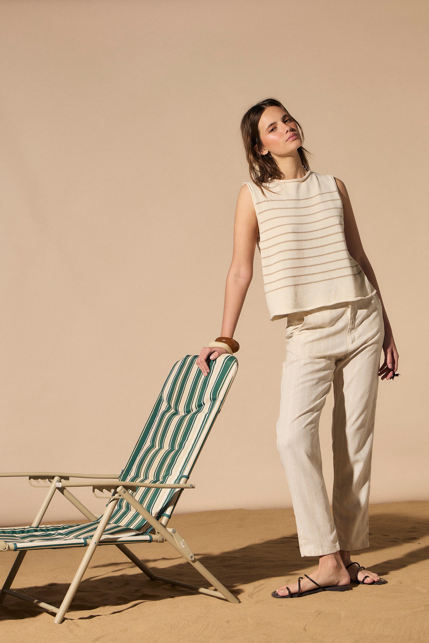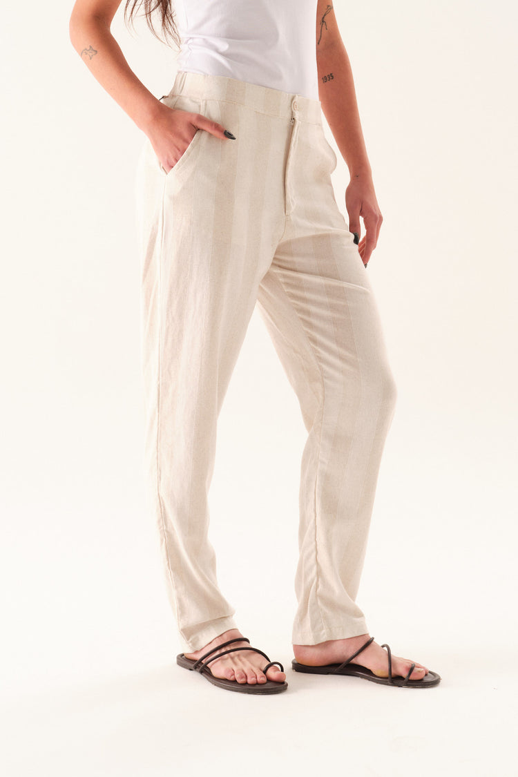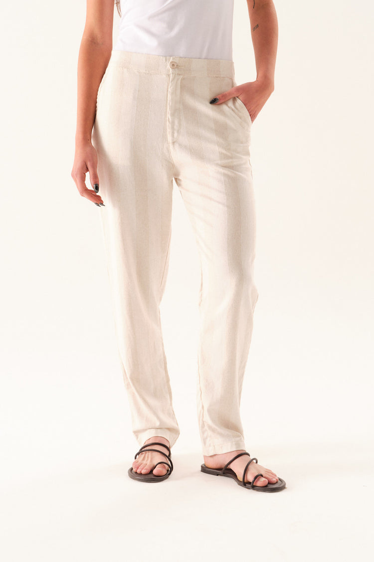 Pantalón de lino rayado con cintura angosta y pinzas en trasero.