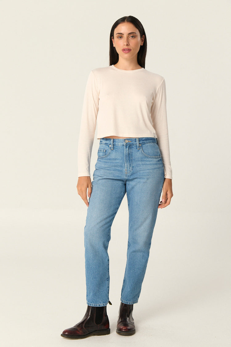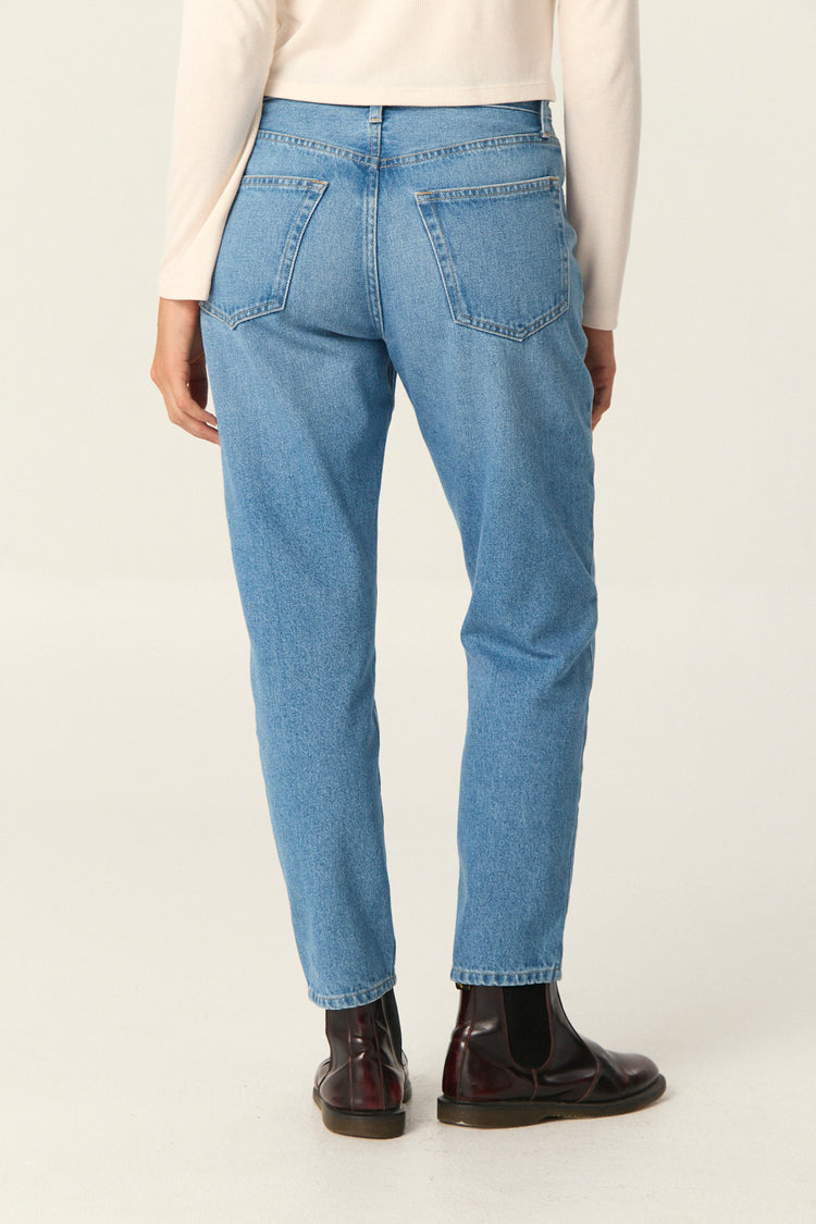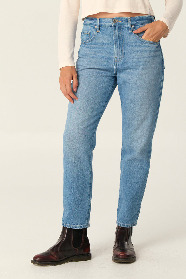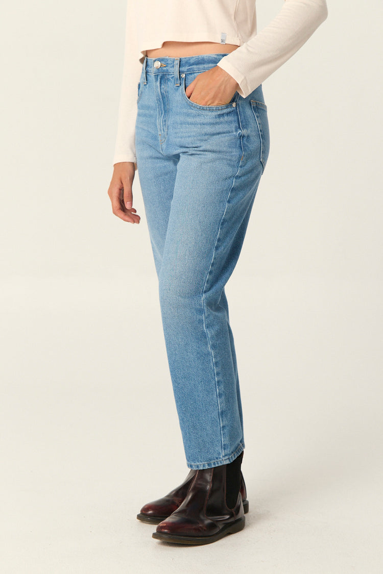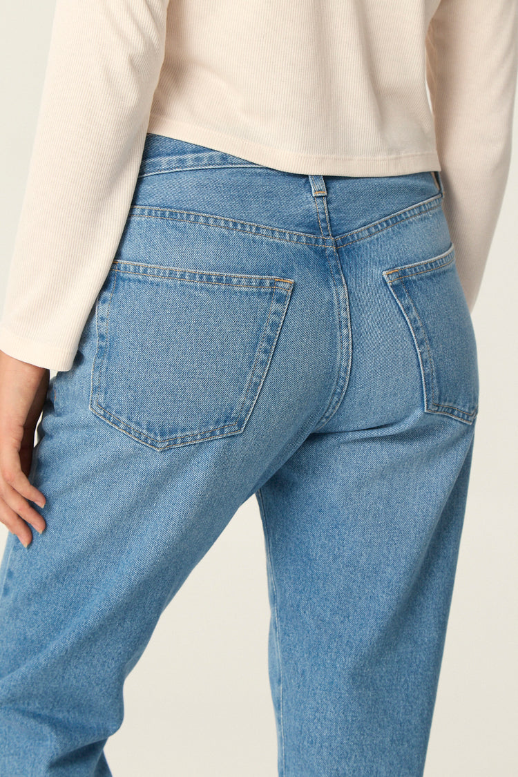 Jean boyfriend tiro alto confeccionado en denim rígido 100% algodón, con lavado celeste con leve marca de bigotes y localizado. Su calce recto y relajado lo convierte en un básico versátil para usar todos los días. Cuenta con cinco bolsillos funcionales y costuras clásicas.