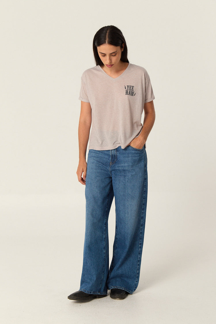 Jean wide leg de tiro alto confeccionado en denim 100% algodón rígido, con lavado azul claro y localizado que aporta un look urbano y relajado. Cuenta con cinco bolsillos funcionales y avíos metálicos en color oro rosa.