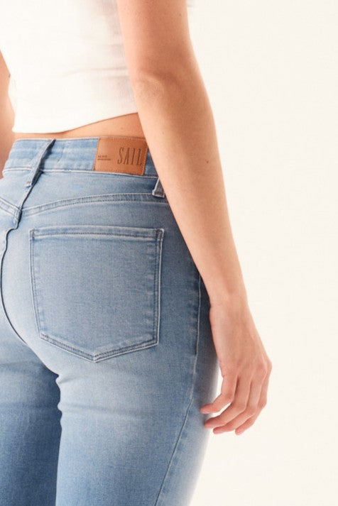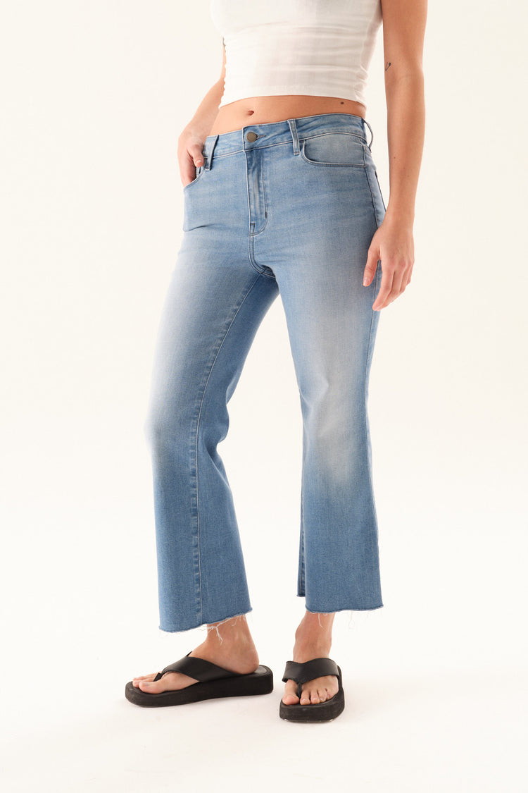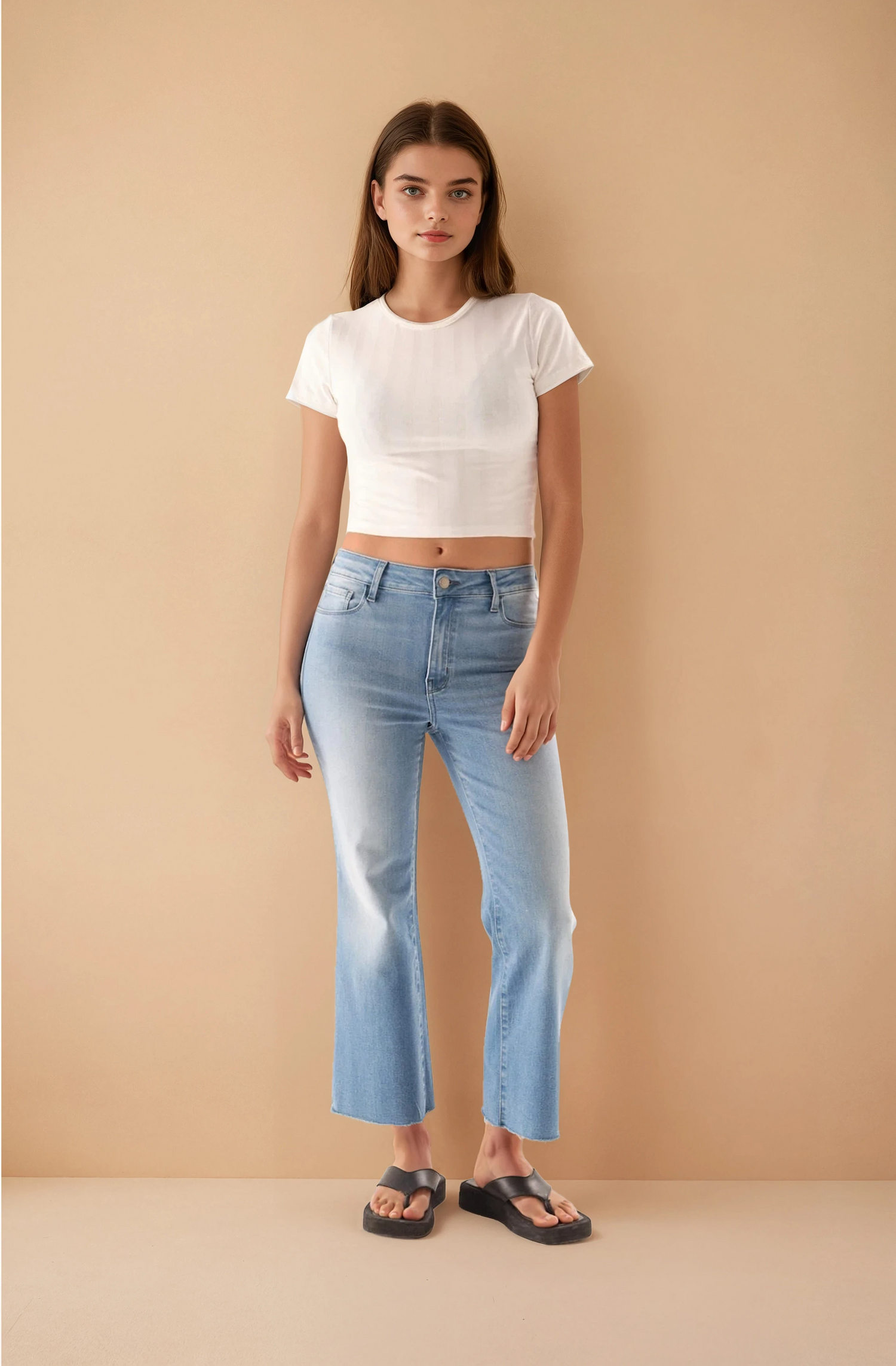 Jean flare crop tiro alto, celeste con localizado. Posee 5 bolsillos y ruedo al corte.