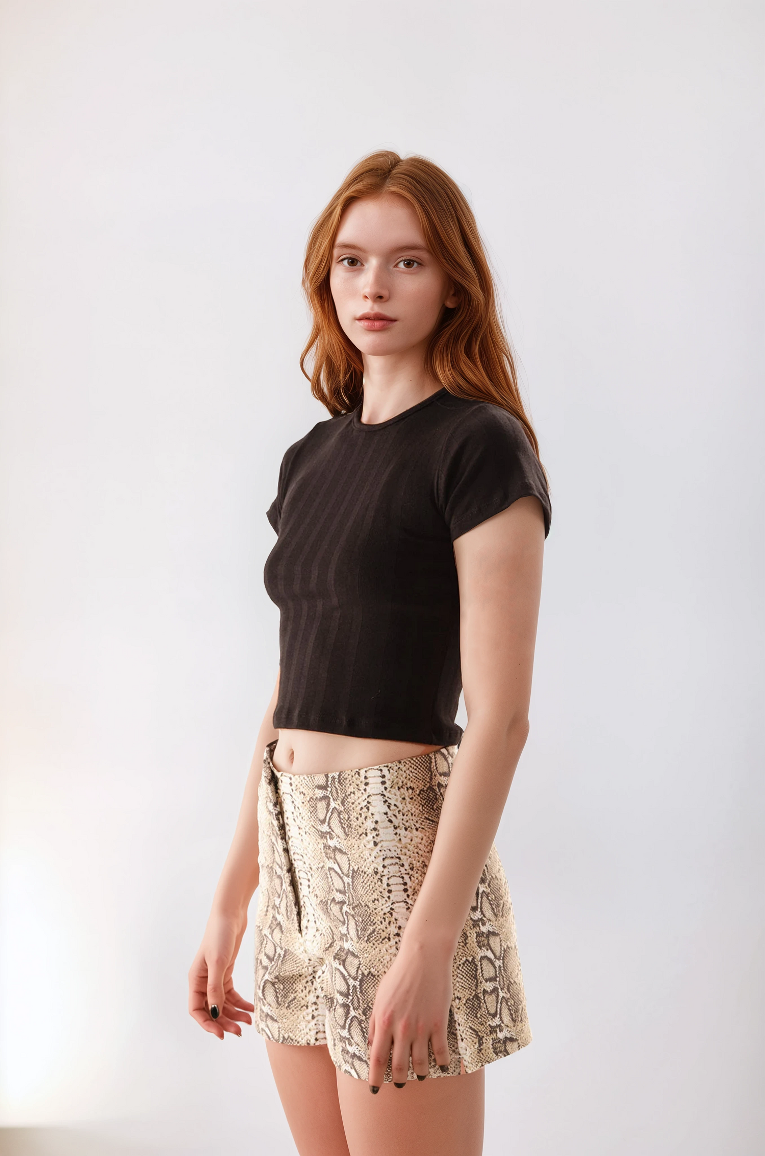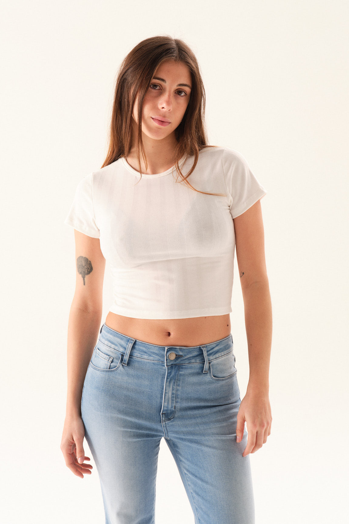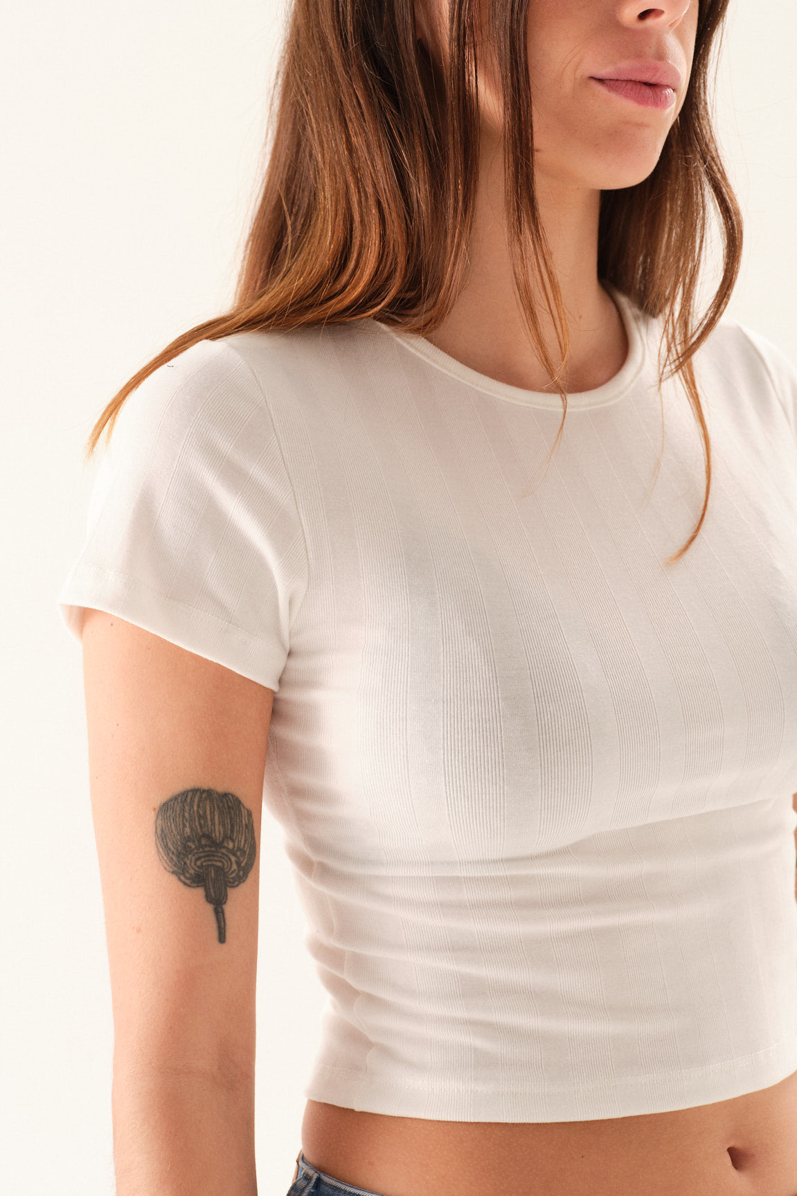 Remera de morley fantasía, escote redondo, manga corta, crop.
