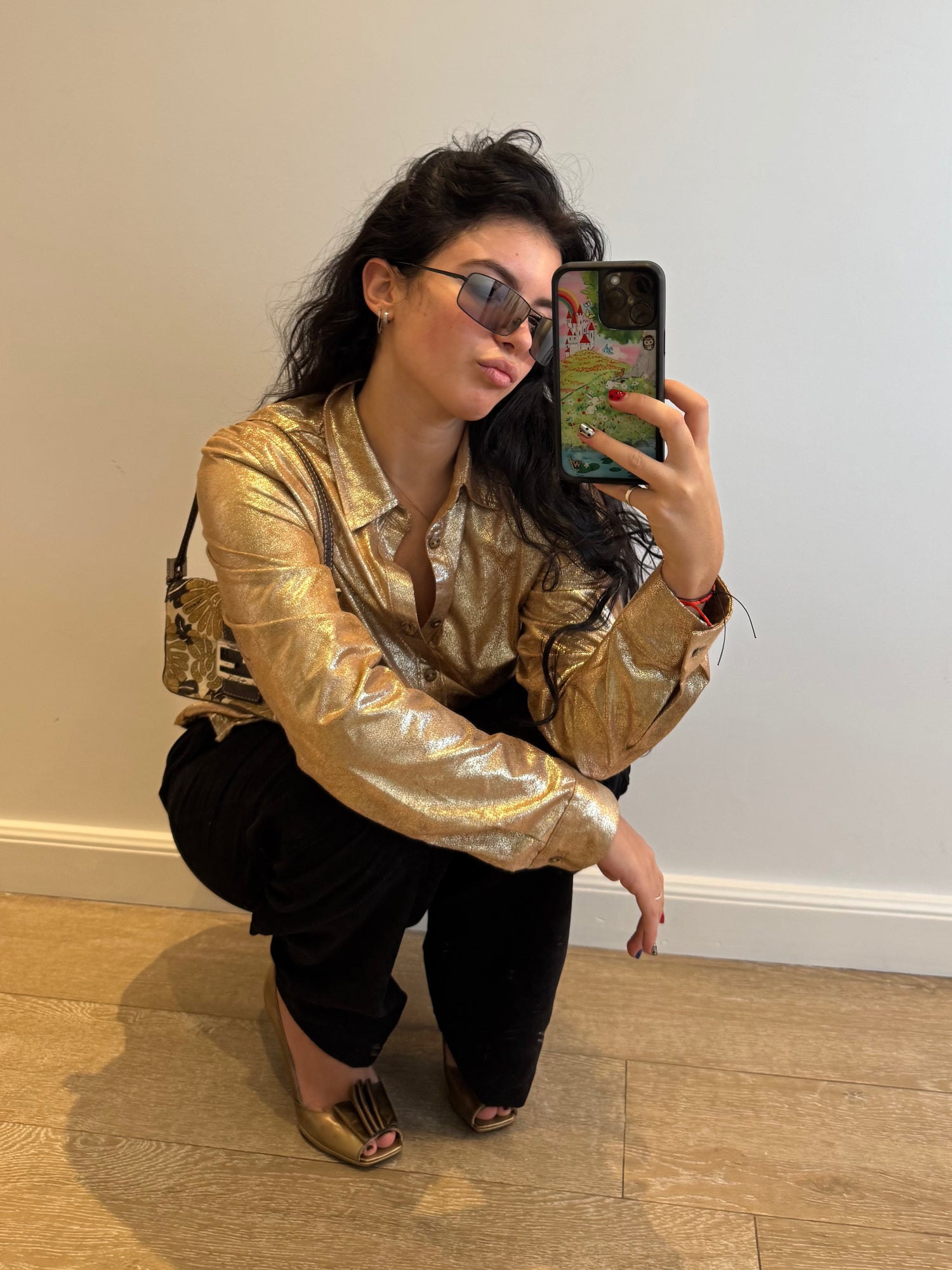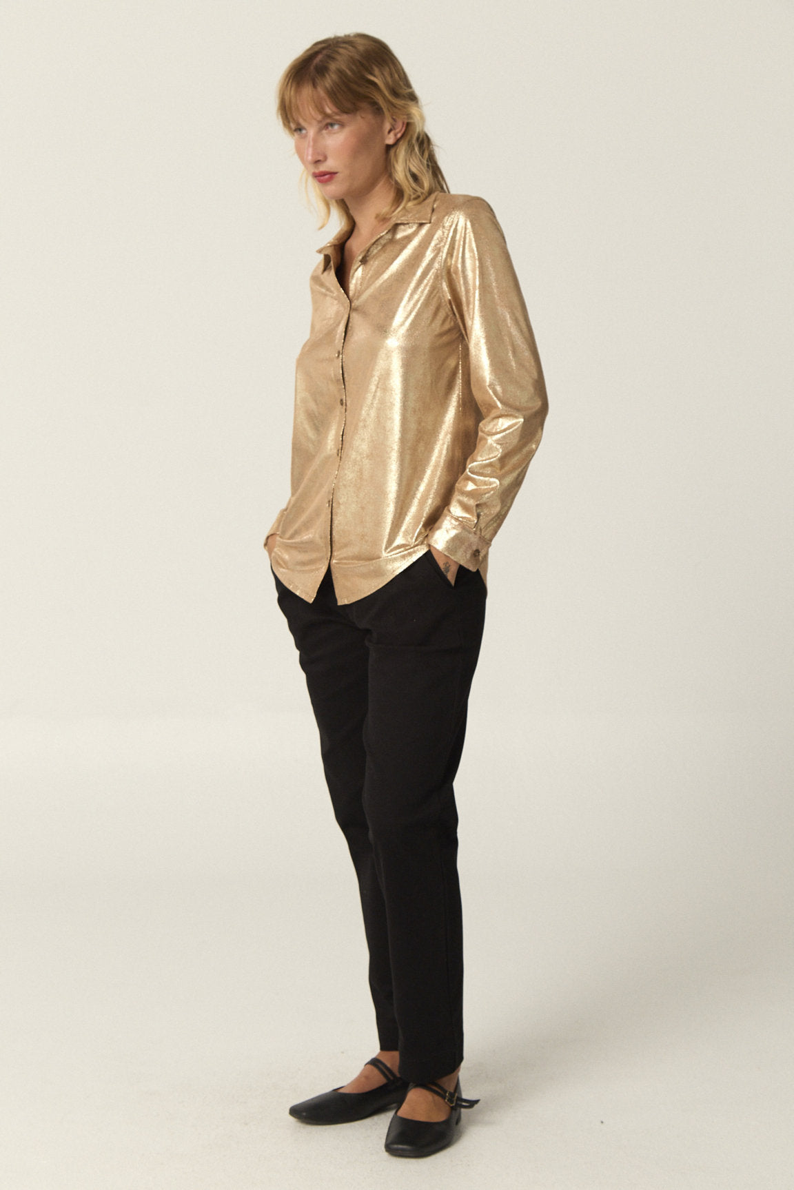 Camisa de tejido efecto gamuzado con foil manga larga.  Posee canesú en espalda.