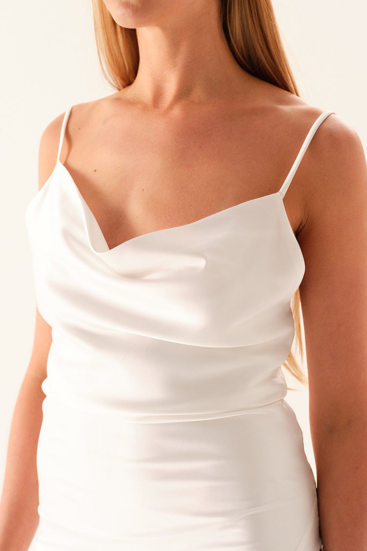 Vestido al cuerpo con escote volcado, breteles y tajo lateral.