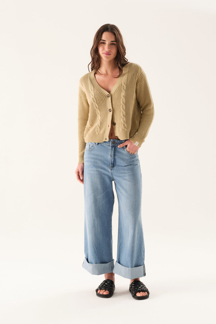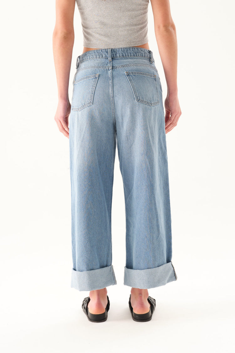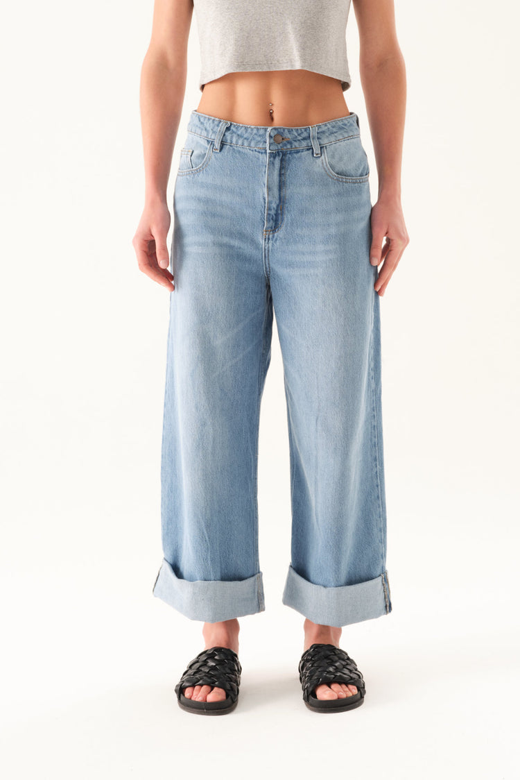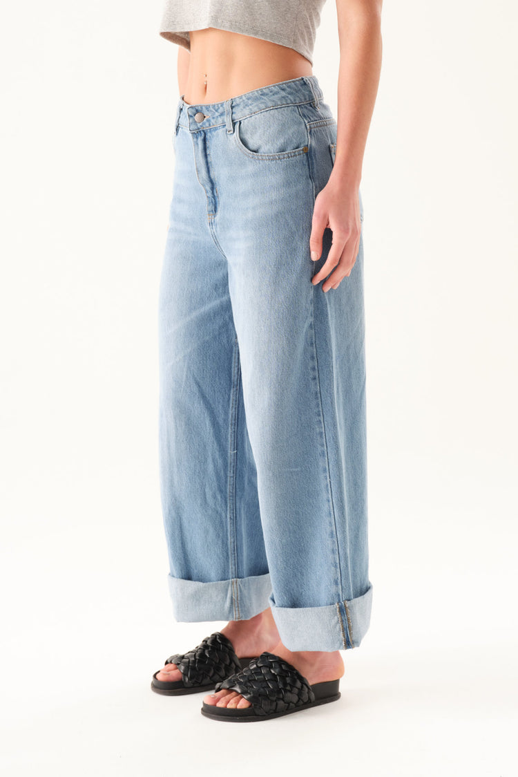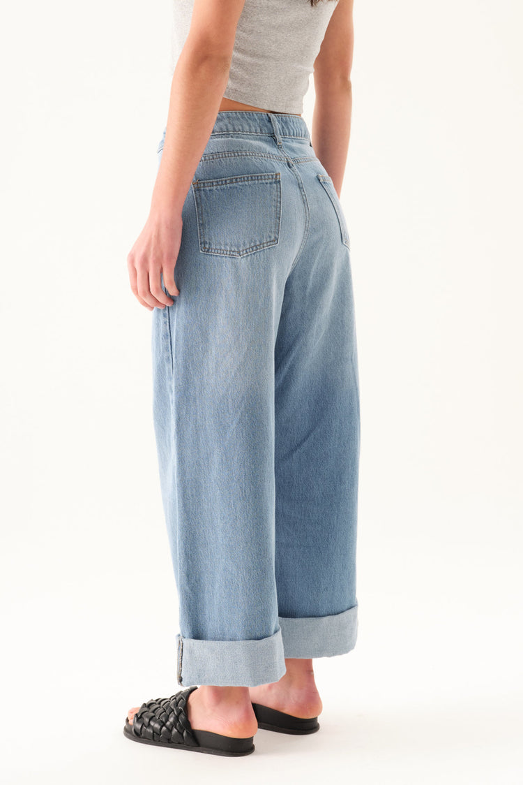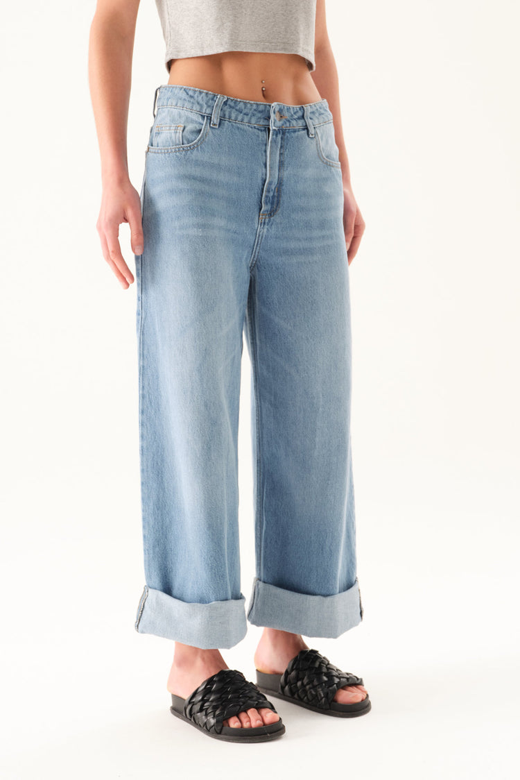 Jean wide leg con bota manga doblada ancha y tiro alto.
