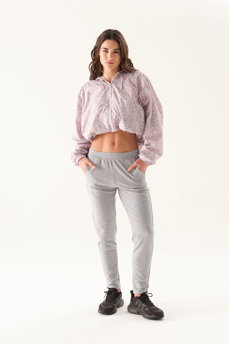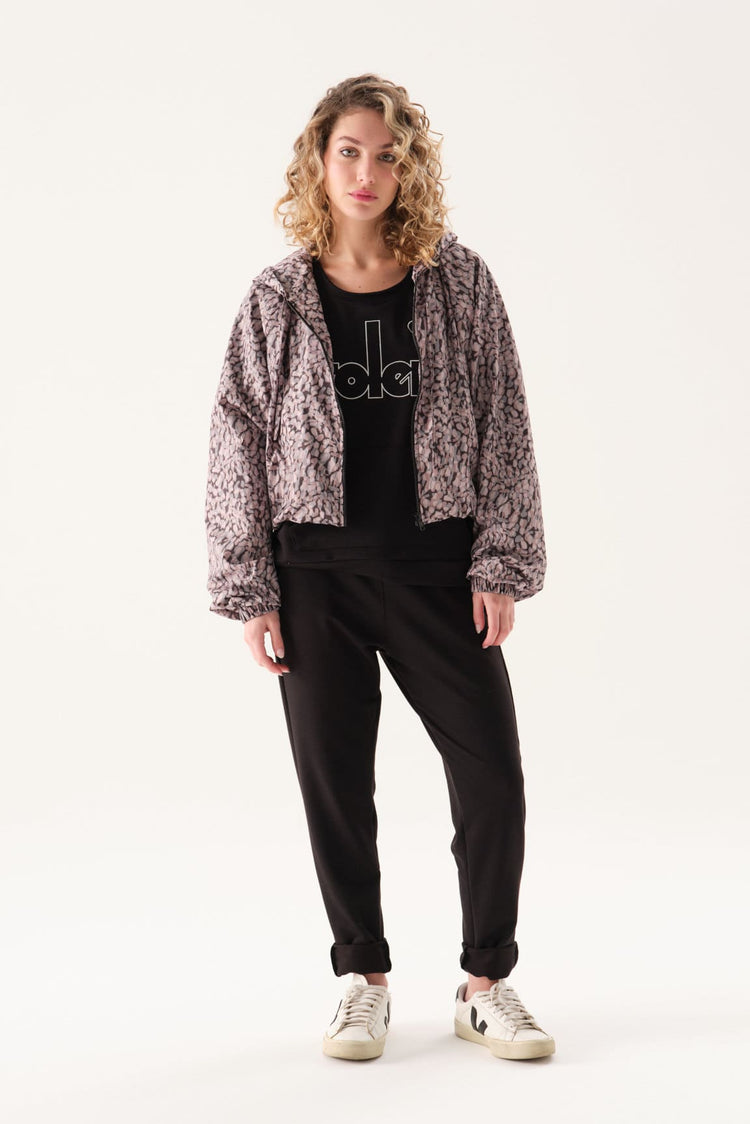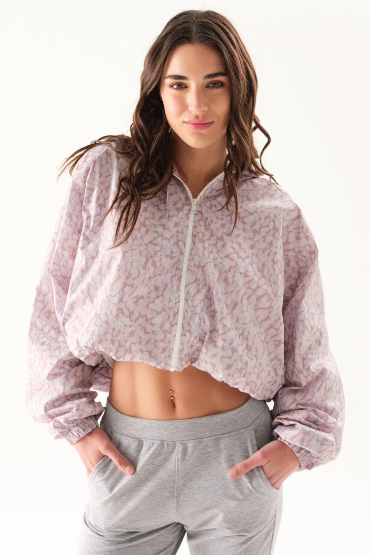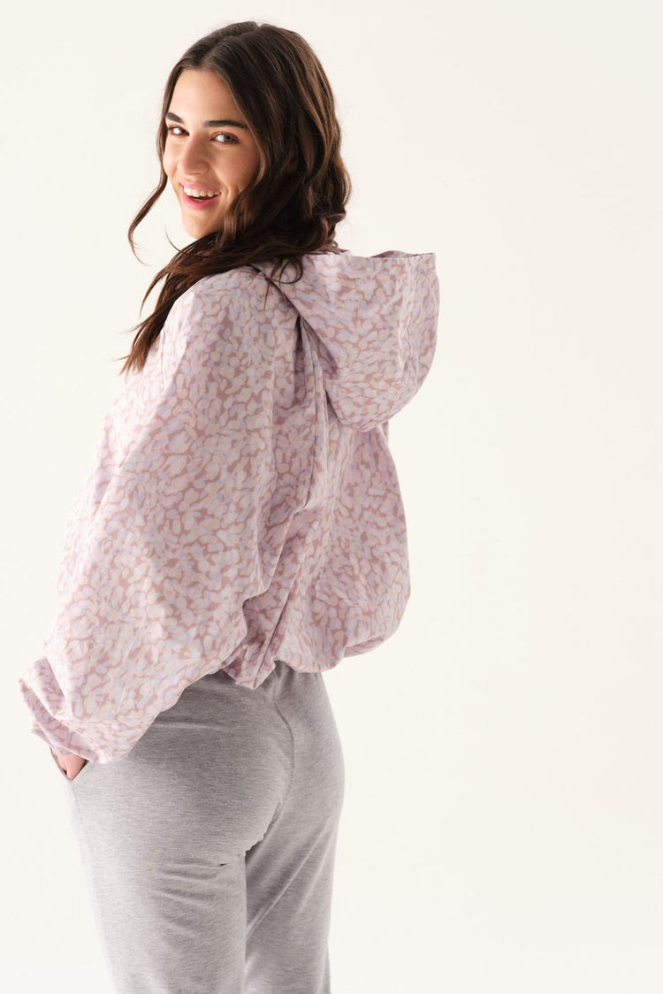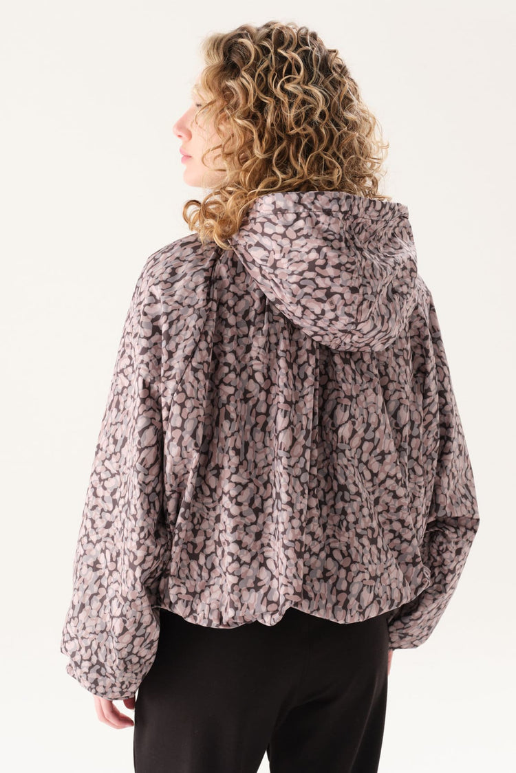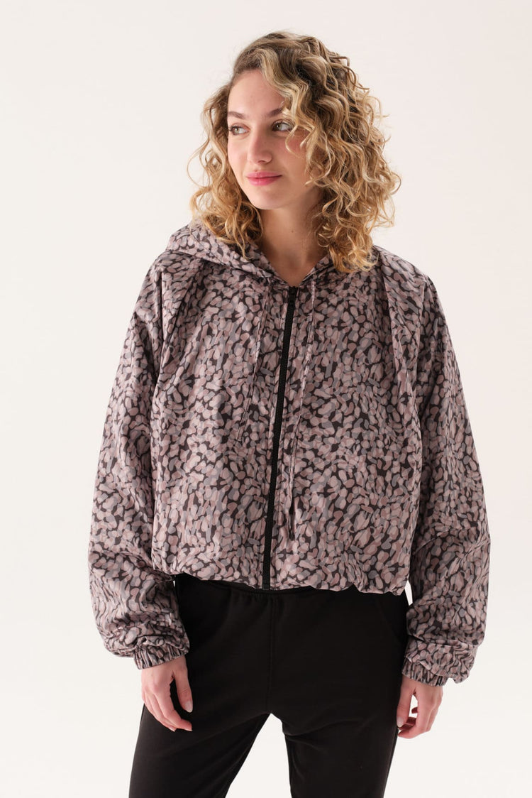 Rompevientos de sire estampado con capucha, tipo balloon fruncido en cuello y ruedo.