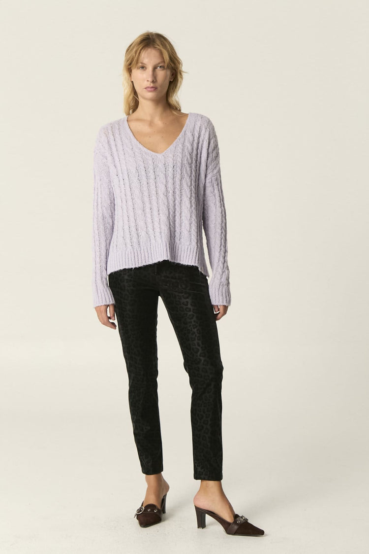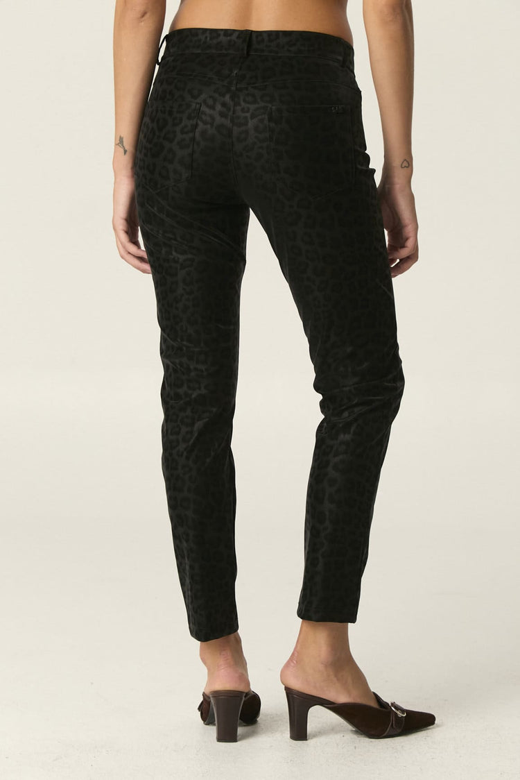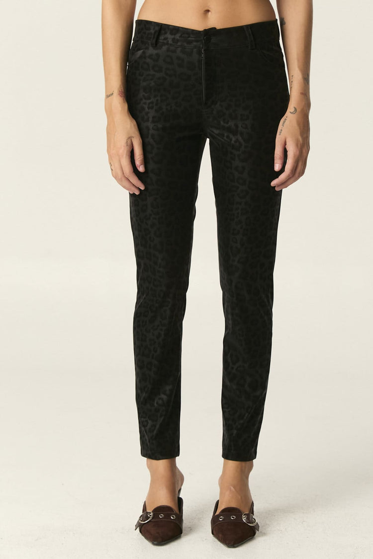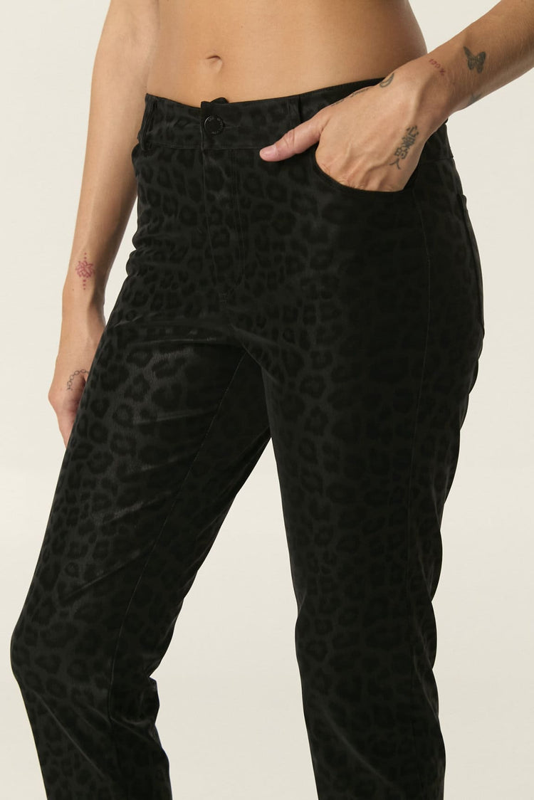 Pantalón de Pu animal print, recto slim, tiro medio. Tiene 5 bolsillos.