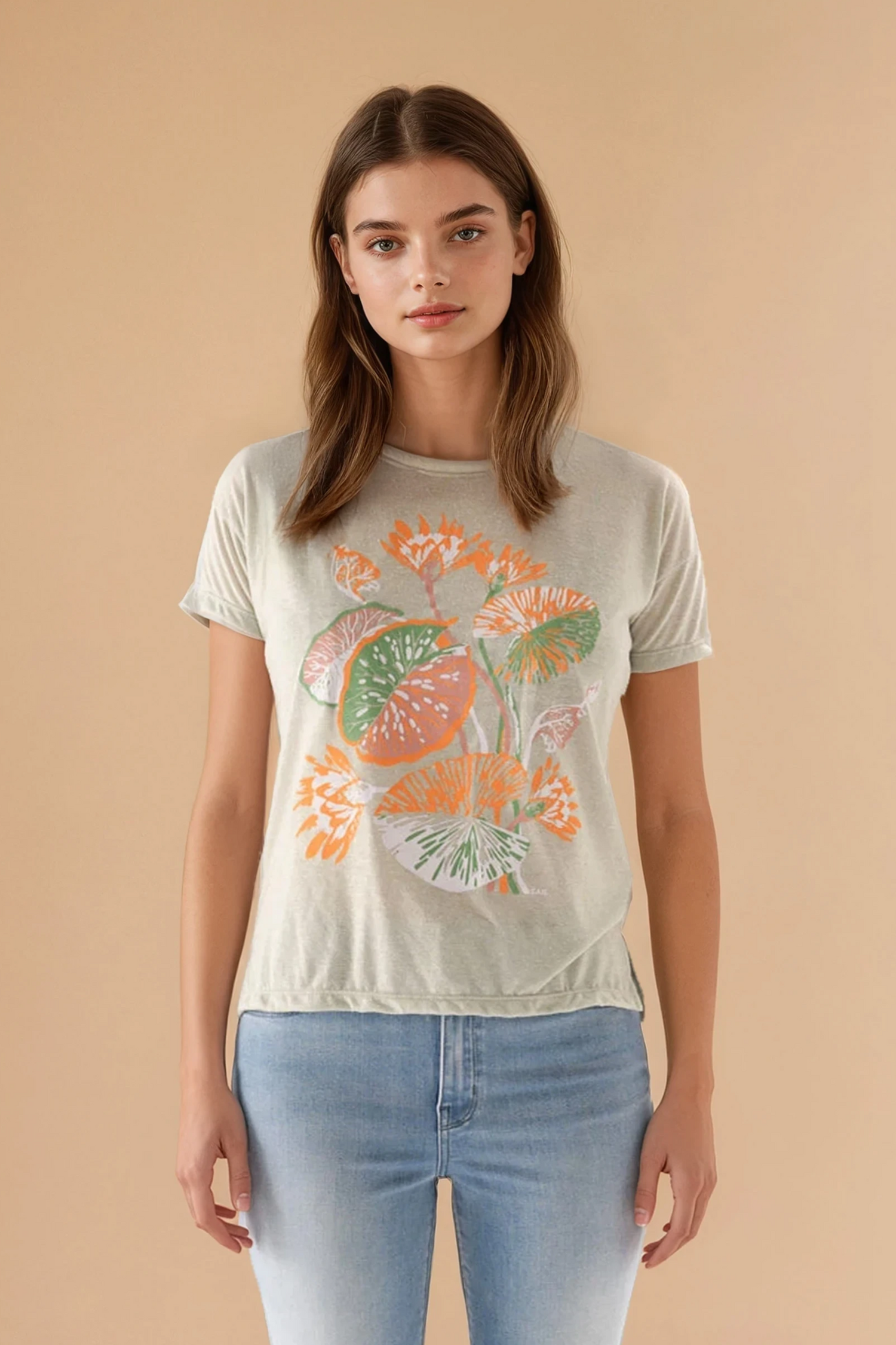 Remera de jersey lino manga corta con escote redondo, espalda irregular y martillo en laterales. Posee estampa en el delantero.