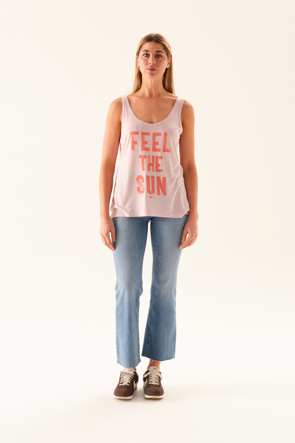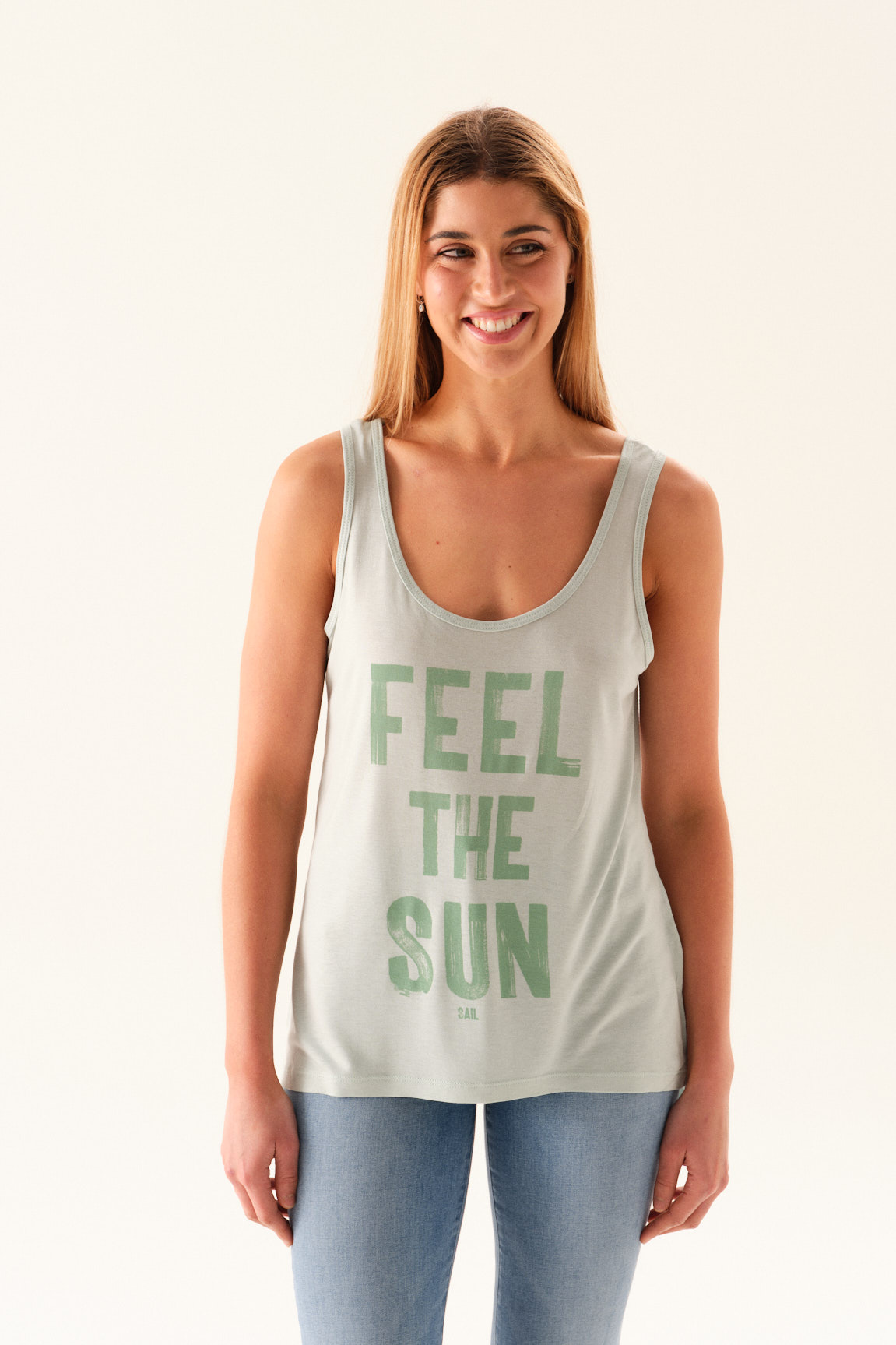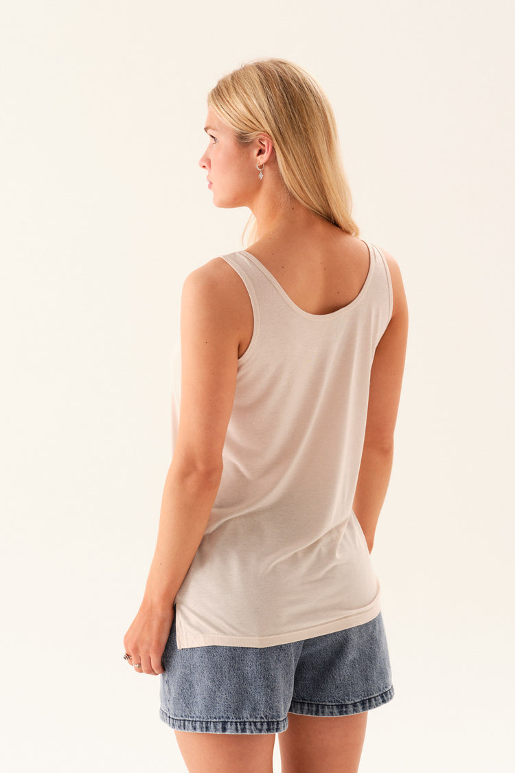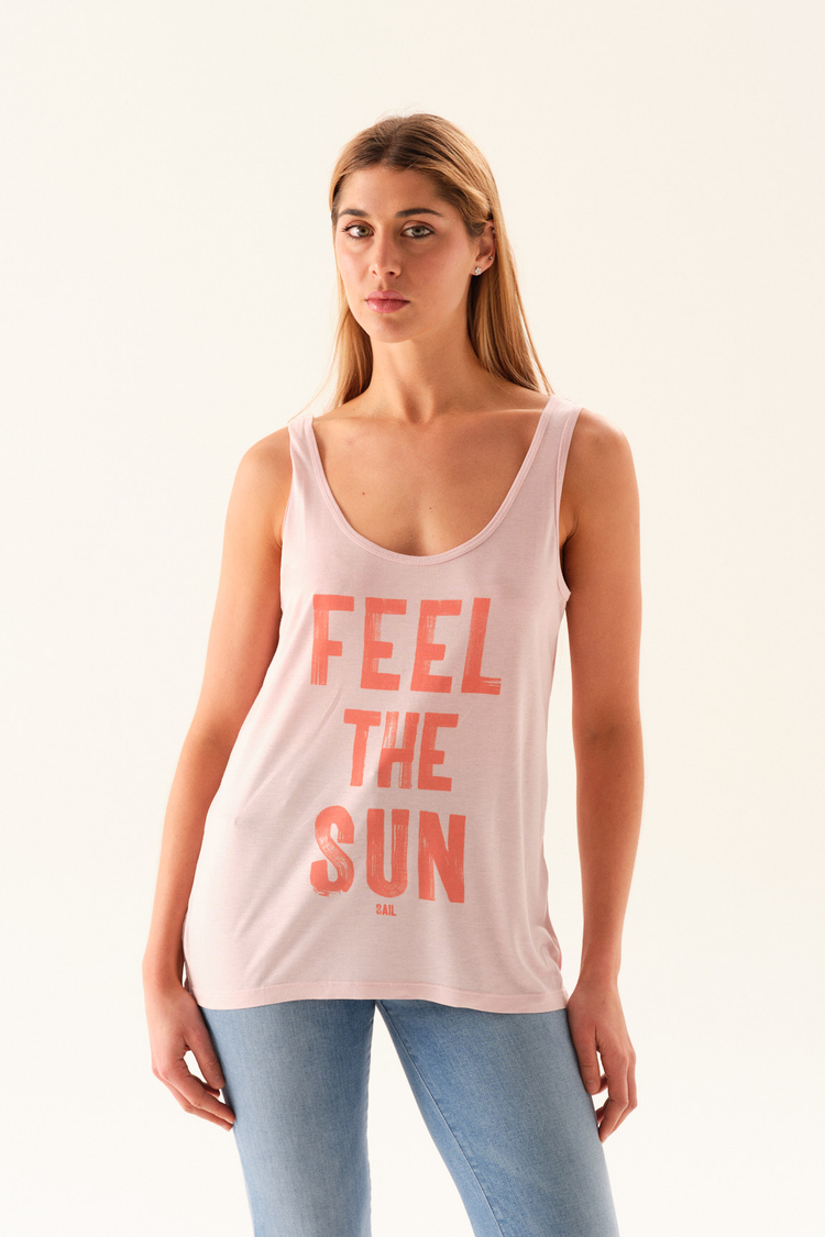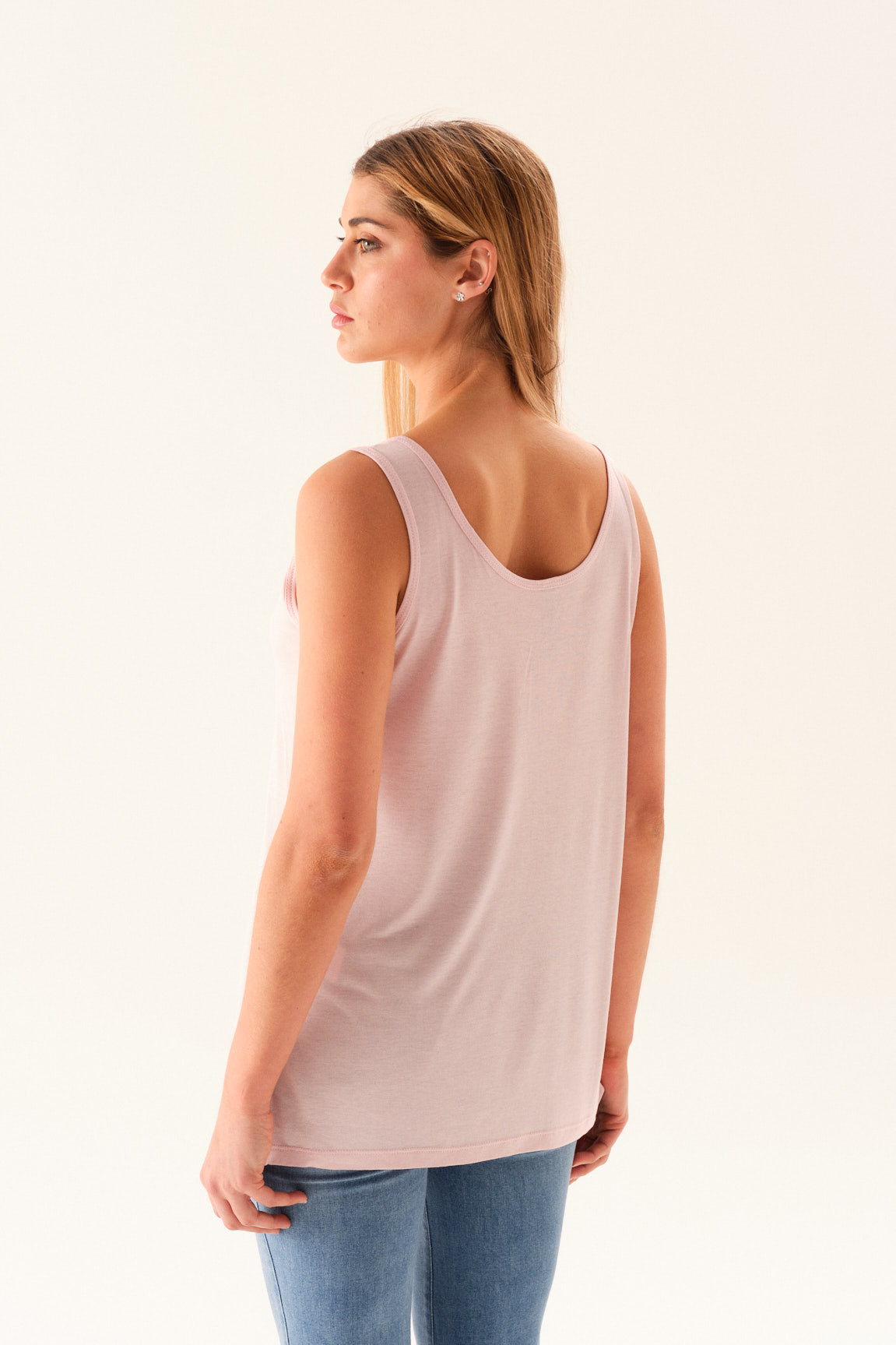 Top de viscosa con escote redondo y breteles anchos con martillo lateral a los costados. Lleva estampa en el delantero.