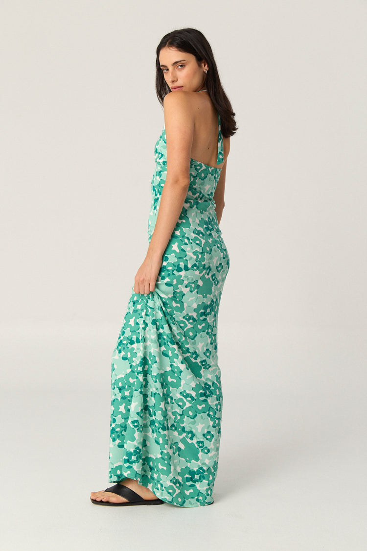 Vestido largo estampado con breteles que se atan en el cuello, espalda descubierta y detalle de tiras en escote para atar.