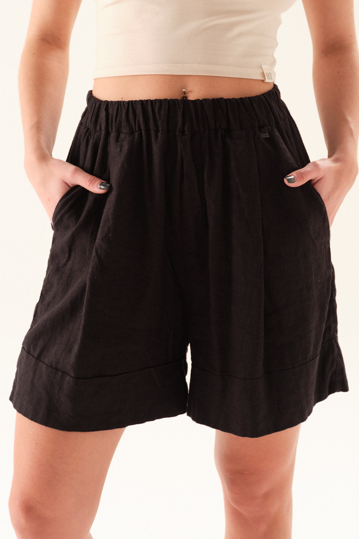 Bermuda de lino con dobladillo ancho en ruedo y elástico en cintura espalda.