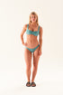 Corpiño con frunce en el centro y recortes delanteros. Posee broche en espalda, y breteles anchos. Bombacha vedetina clasica.