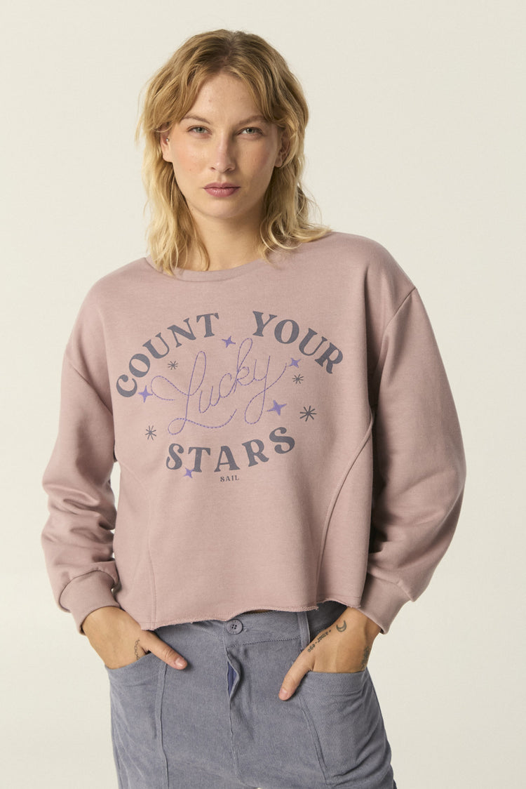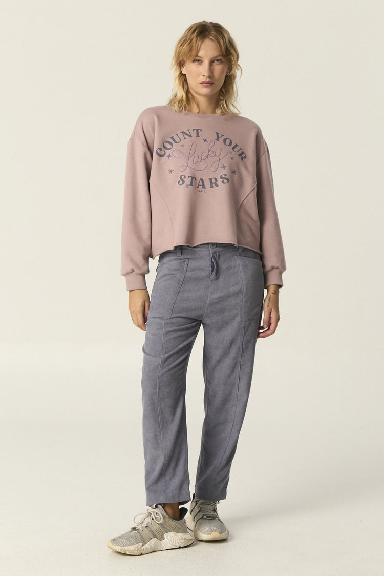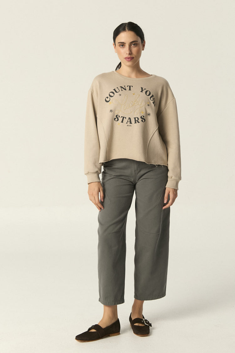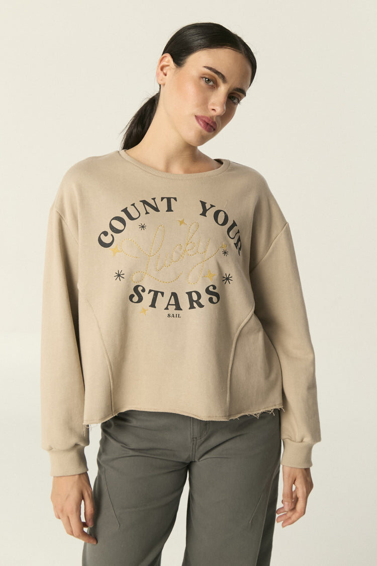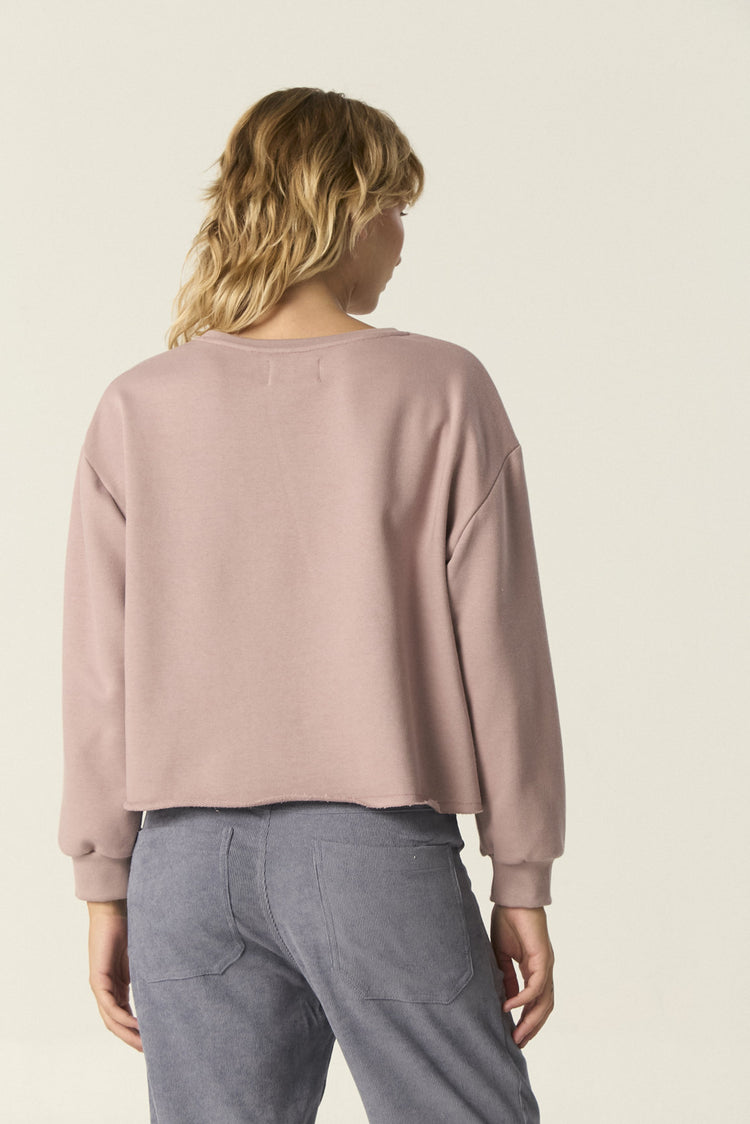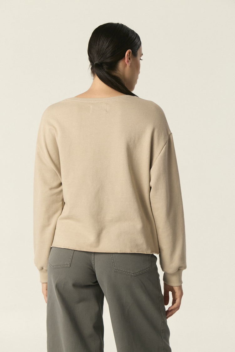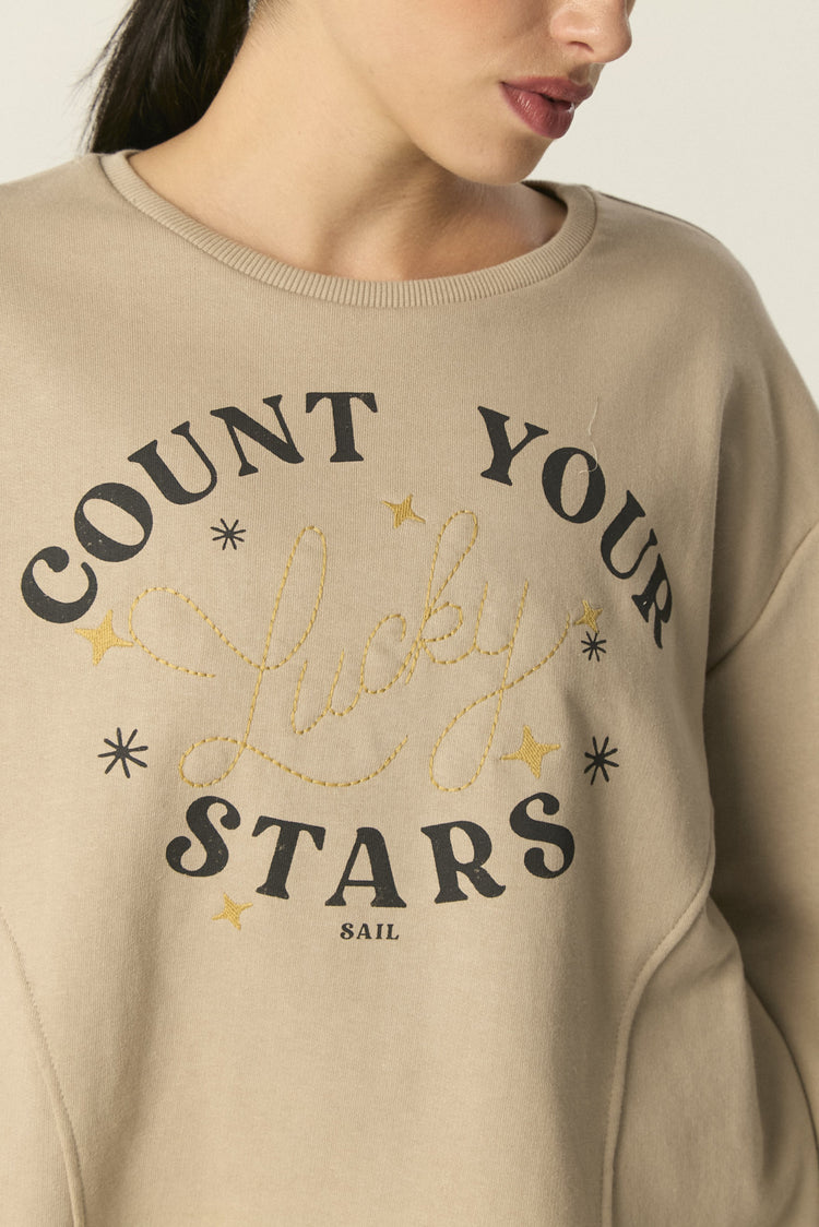 Buzo de rustico manga larga con escote redondo y recortes en delantero. Tiene puños en manga y escote, con arte estampado y bordado en el delantero.