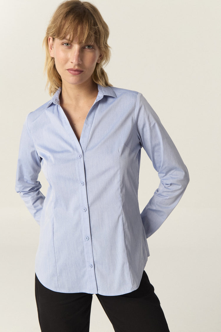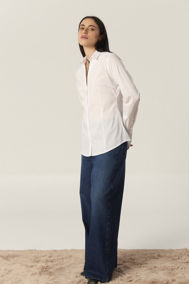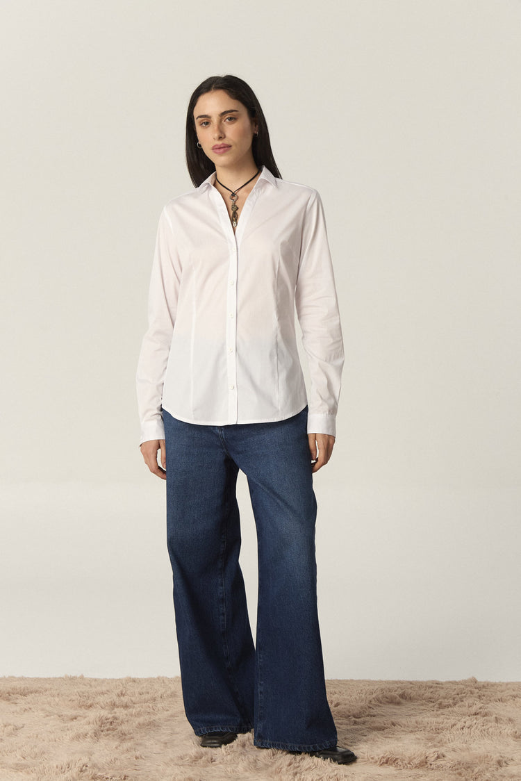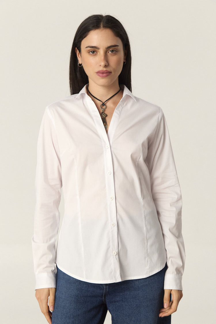 Camisa clásica y entallada con un ajuste cómodo. Confeccionada en poplín con elastano, su diseño entallado y de manga larga se adapta a la silueta, brindando un look prolijo y versátil.
