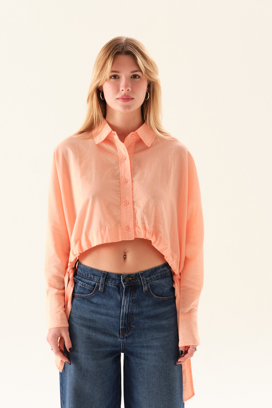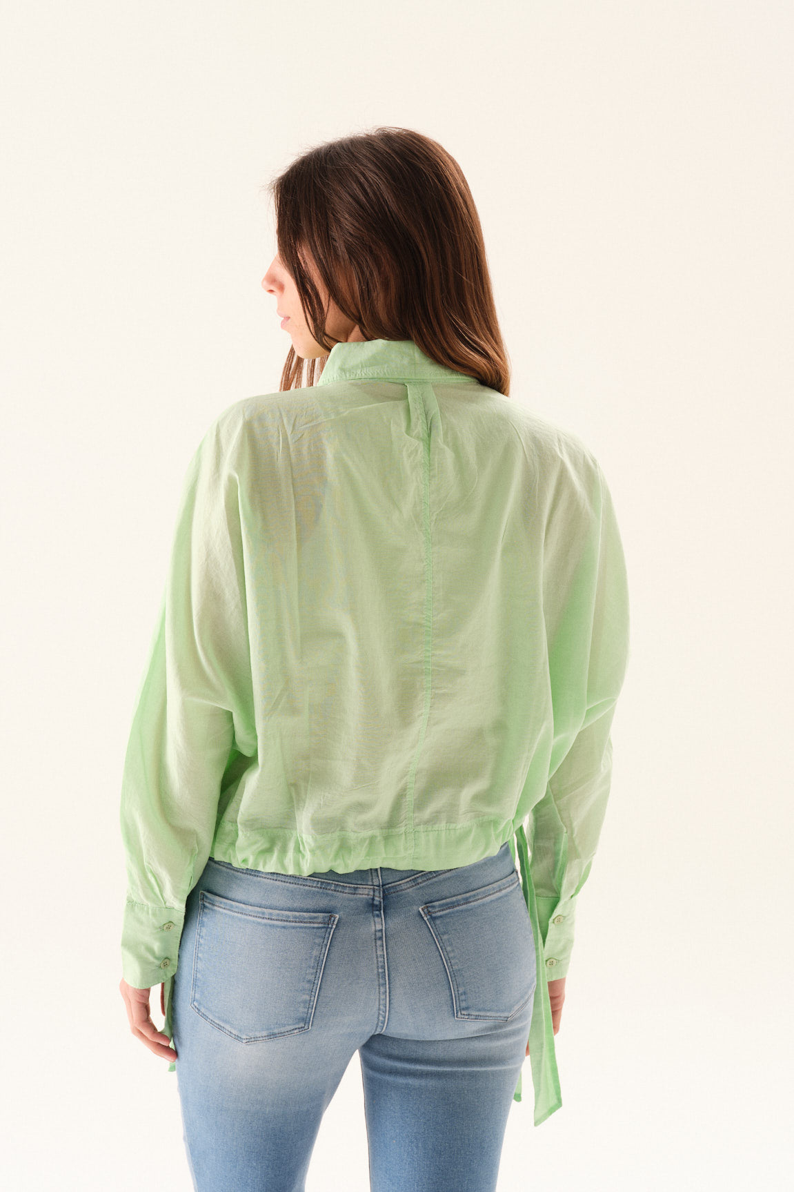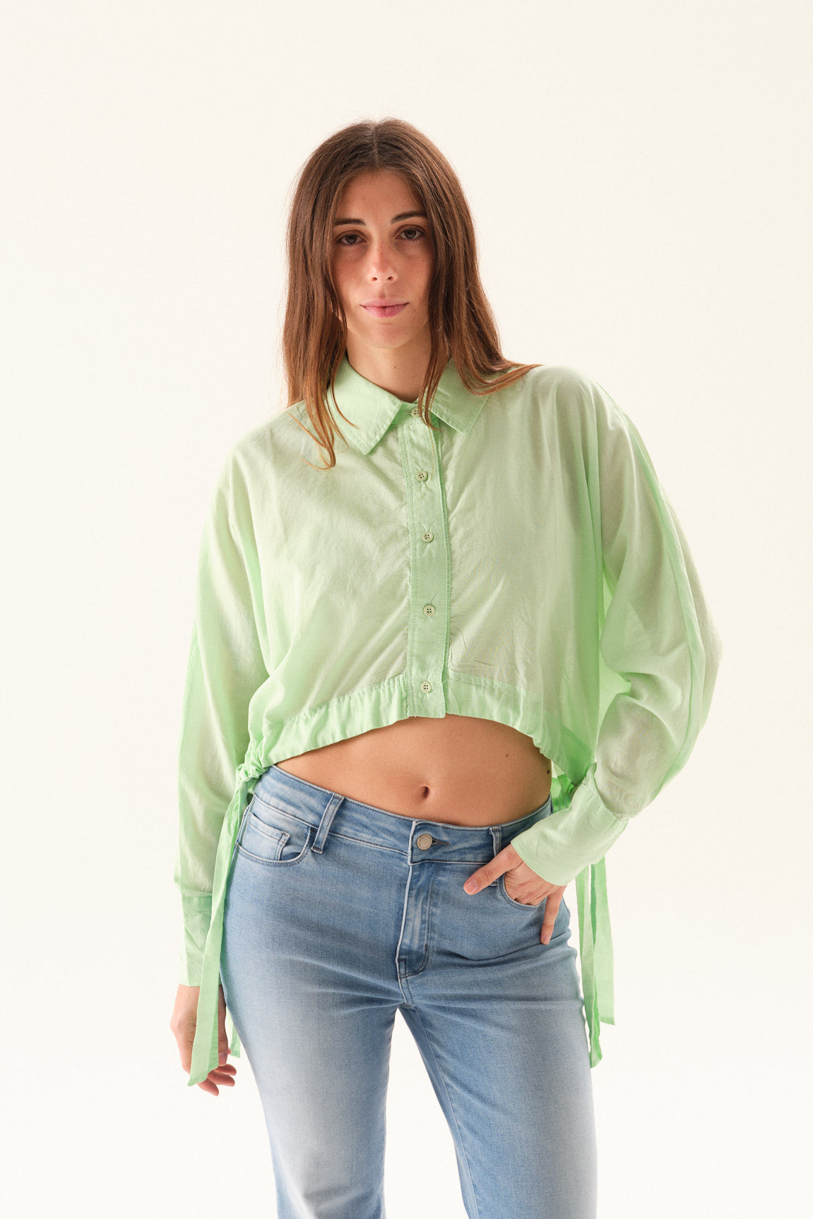Camisa de voile crop con manga larga murcielago y tunel con lazo para fruncir en cintura.