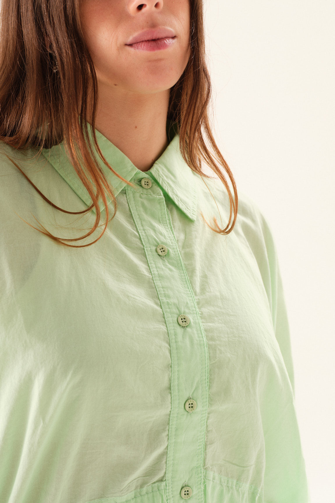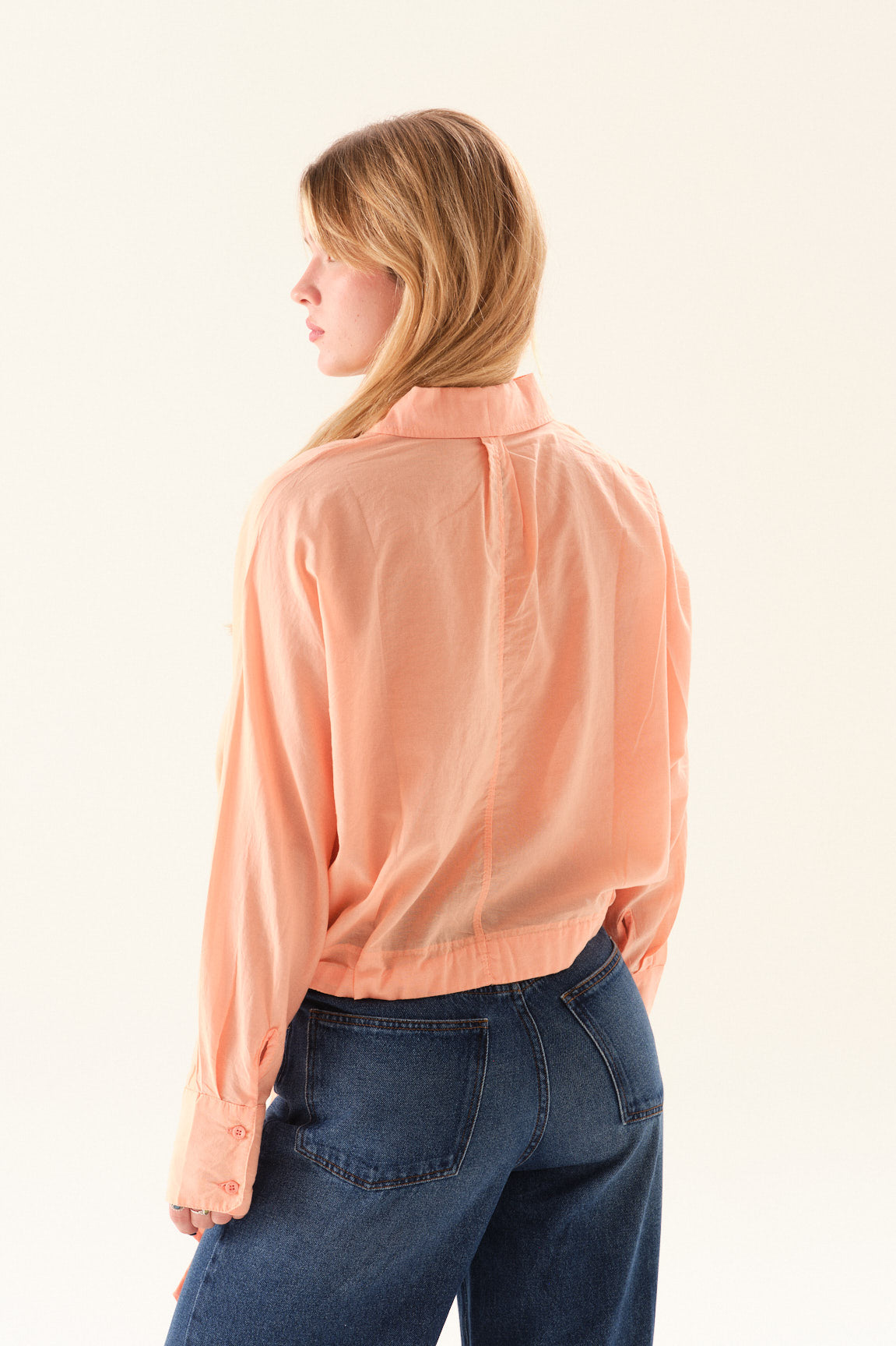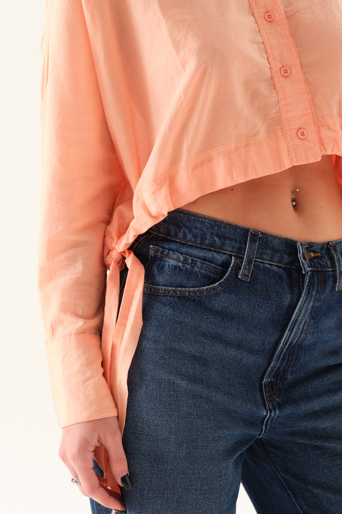 Camisa de voile crop con manga larga murcielago y tunel con lazo para fruncir en cintura.