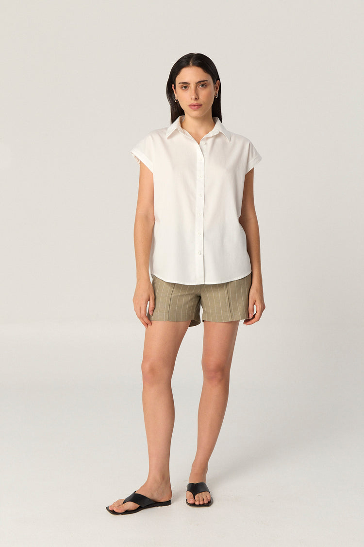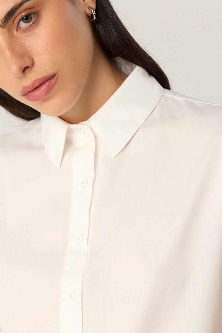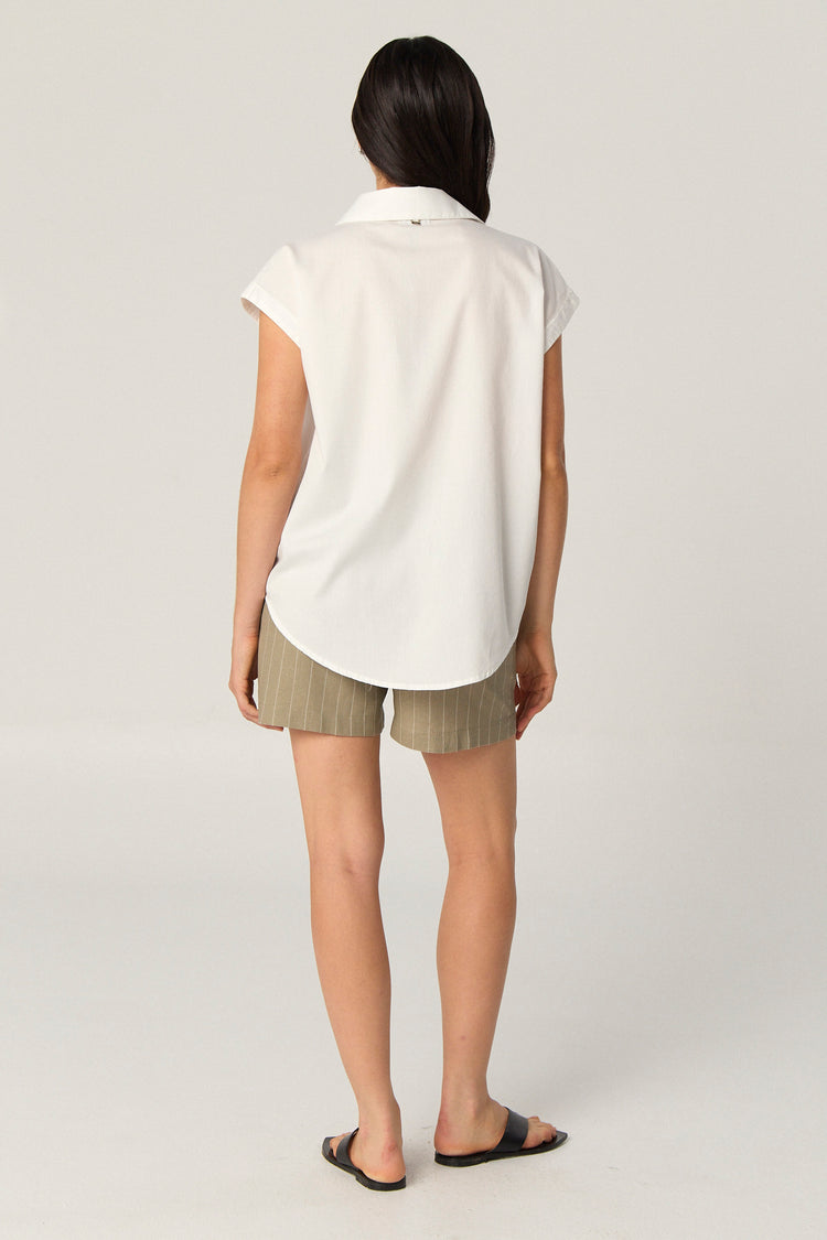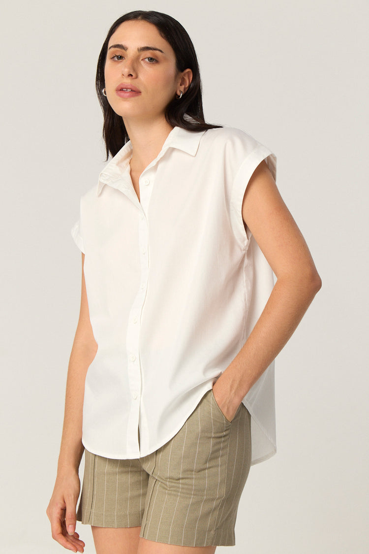 Camisa amplia de denim camisero, sin mangas y con ruedo irregular.