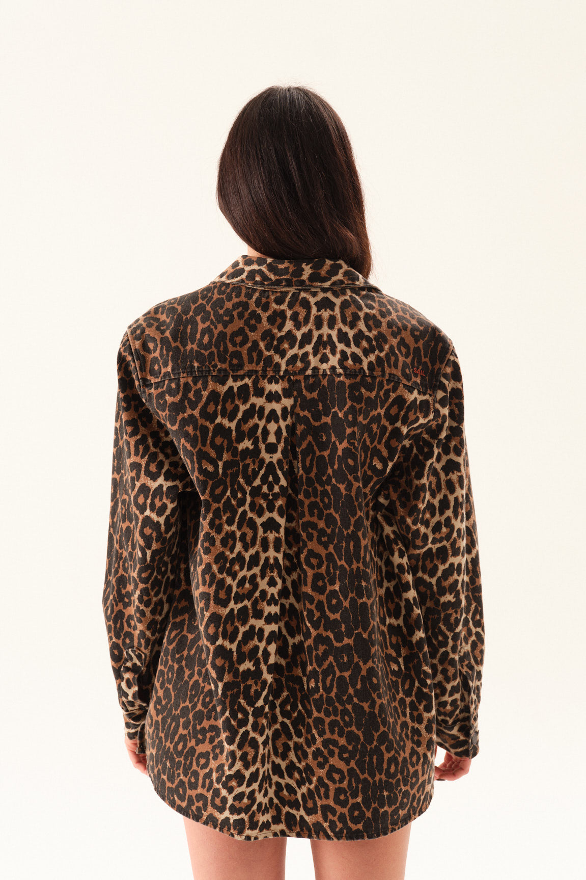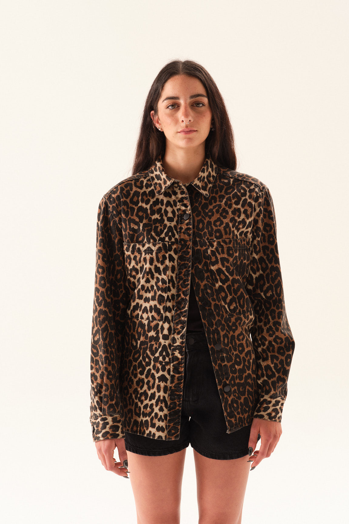 Camisaco de gabardina animal print, con manga larga, bolsillos delanteros y tajos laterales.