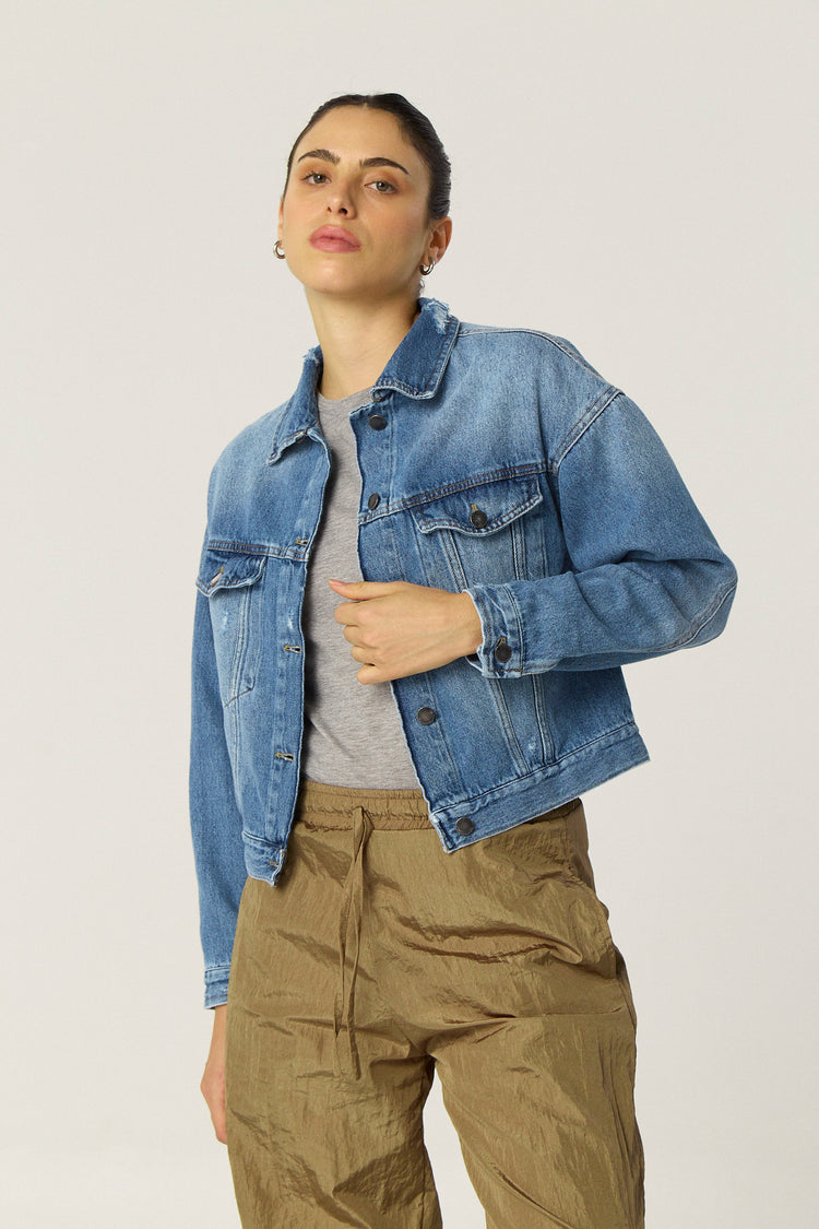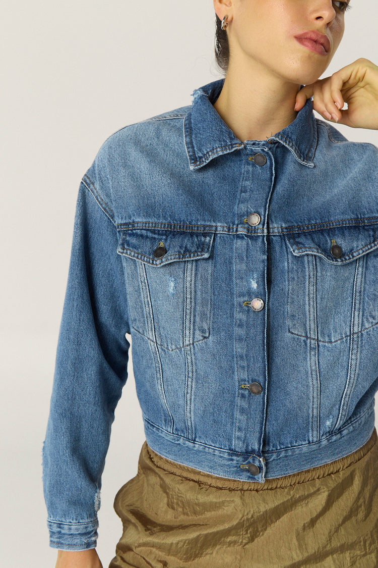Campera de jean corta con pinzas en espalda, lavada con roturas.