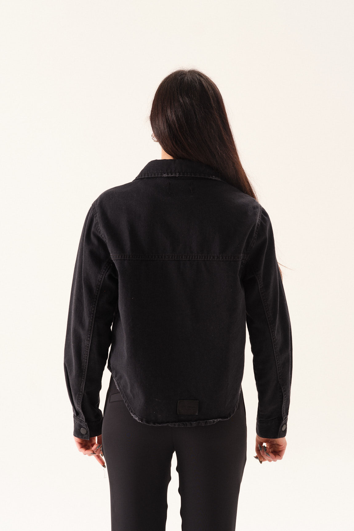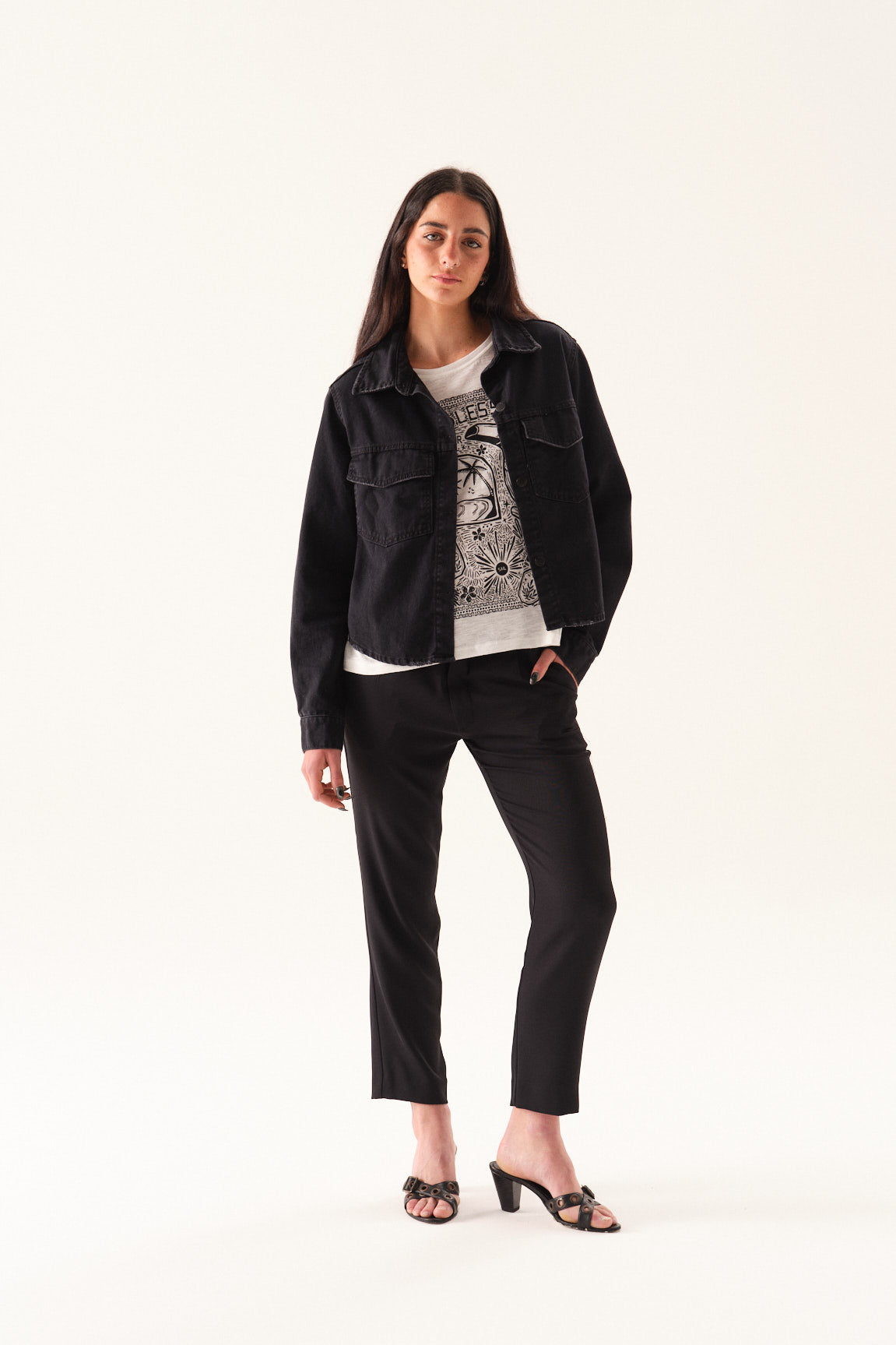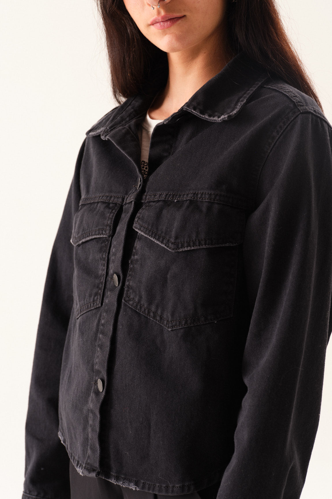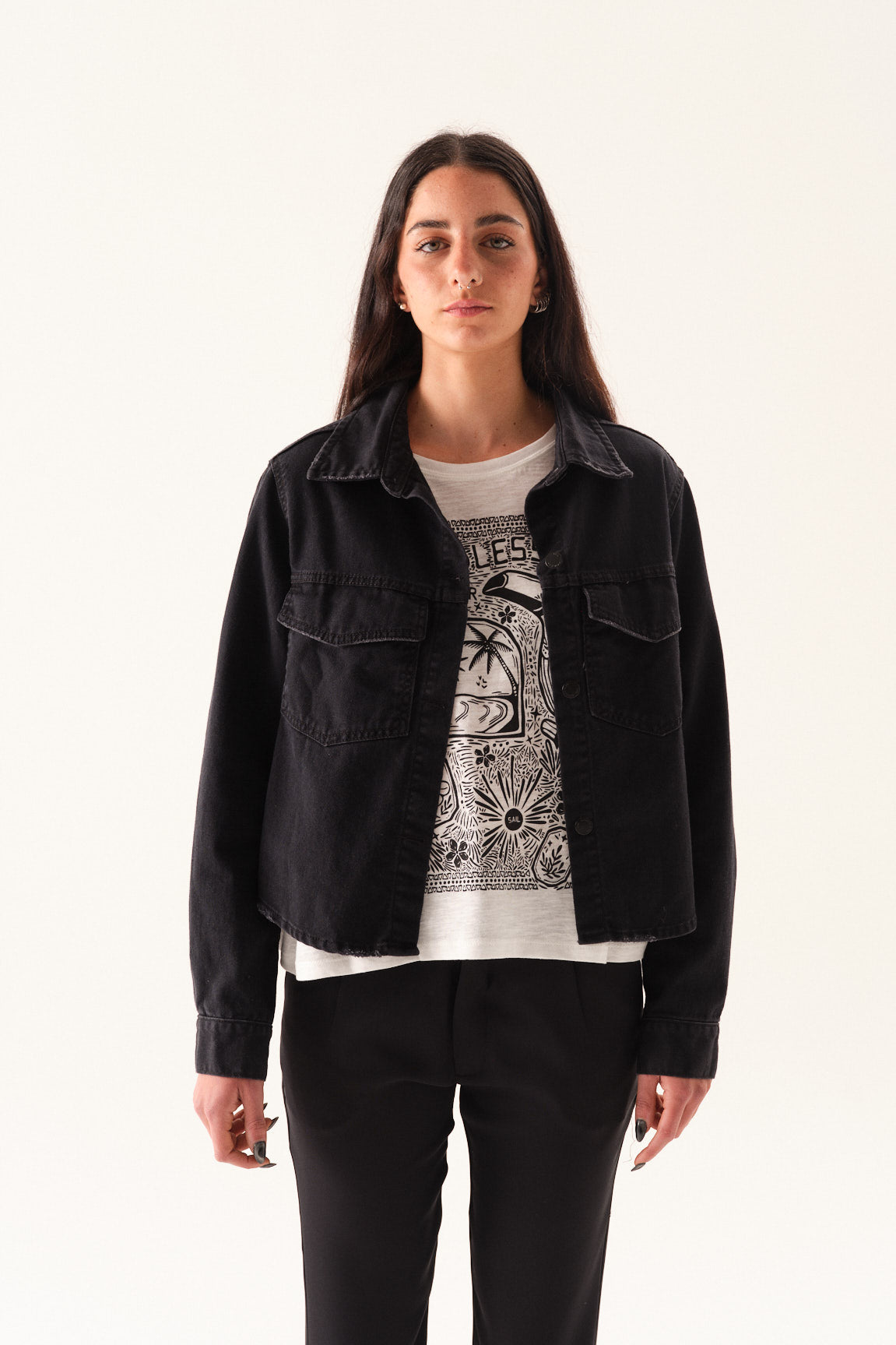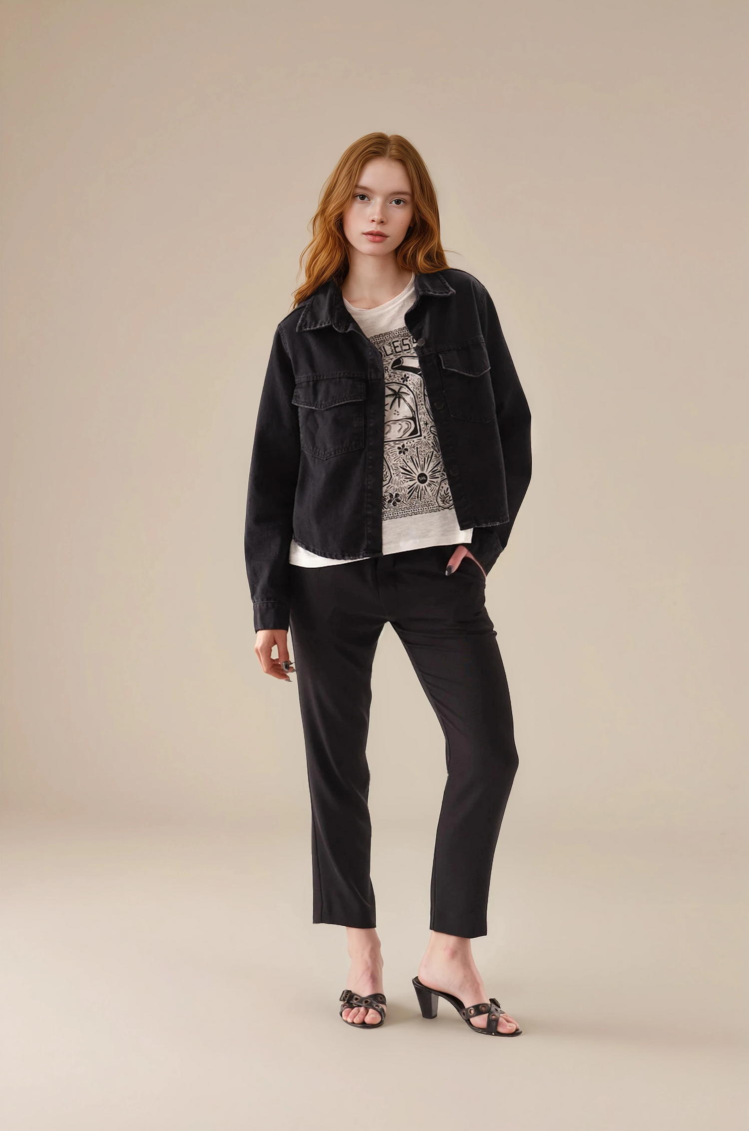 Chaqueta corta de denim regular fit abotonada con bolsillos con tapa en el frente.