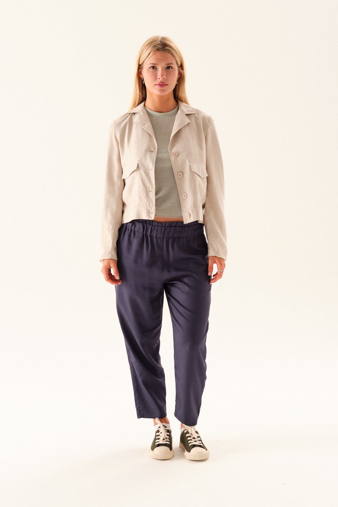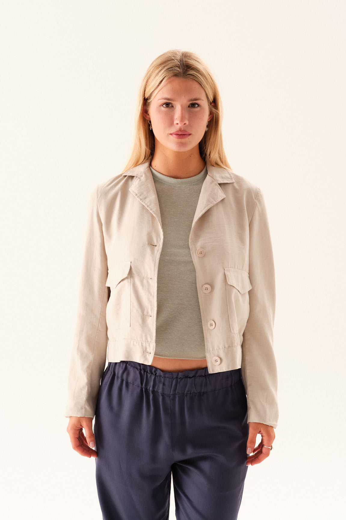Chaqueta tipo sastrera de sarga rayon con bolsillos aplicados con tapa.