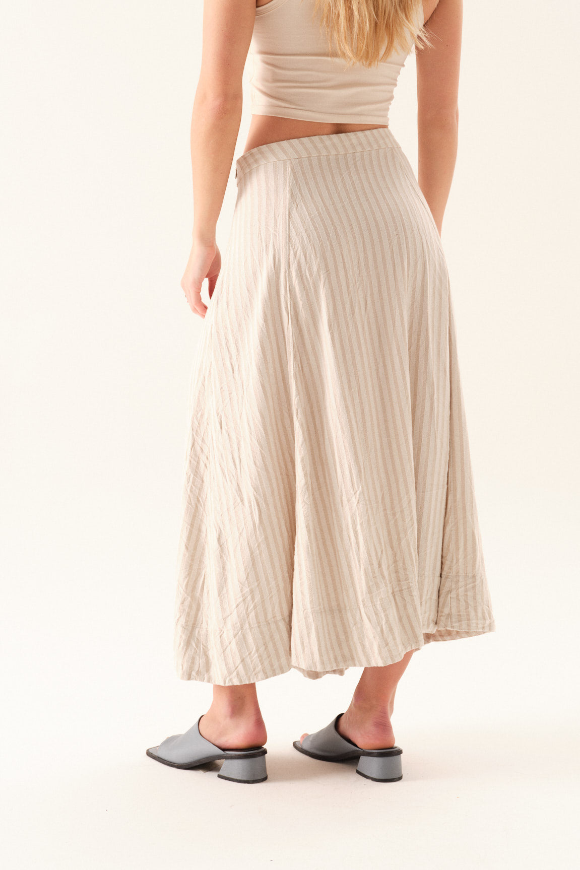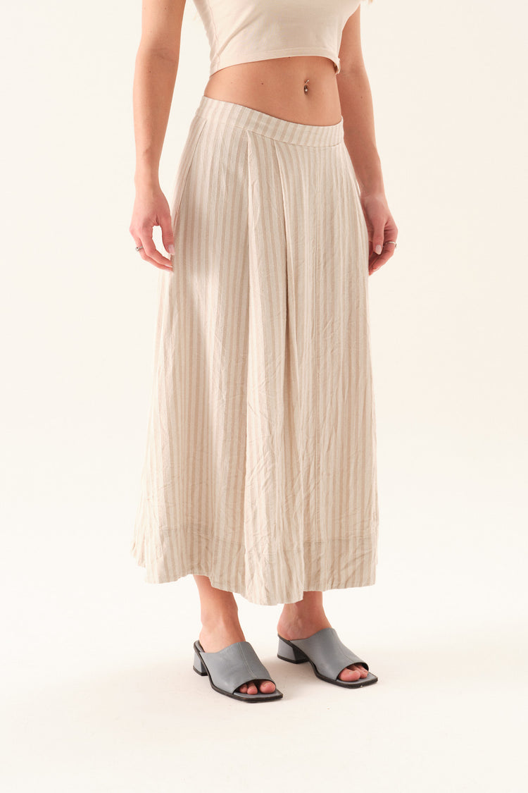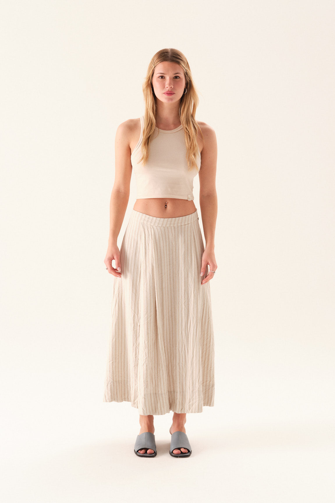 Falda evase de lino, rayada con tablas y bolsillo escondido.