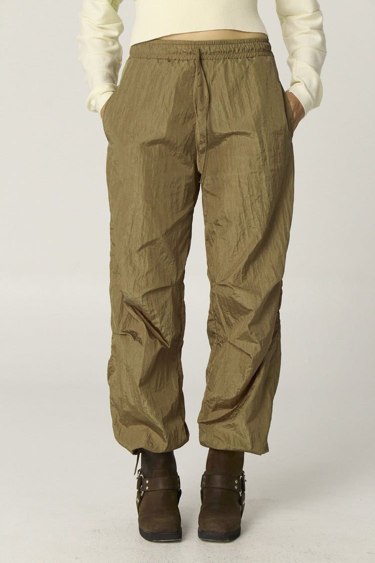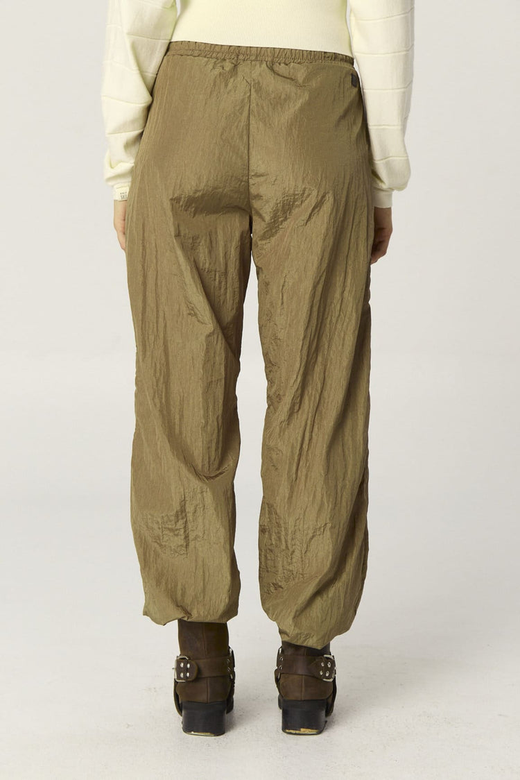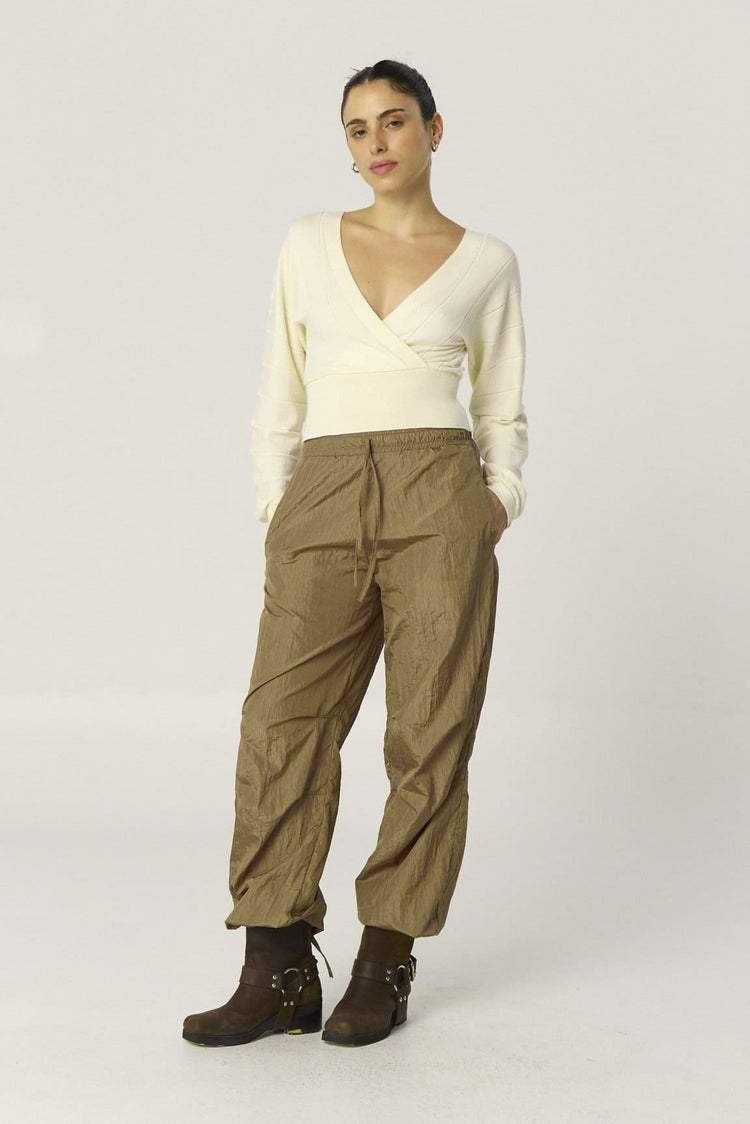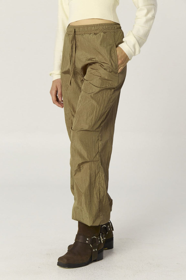 Pantalón en sire brilloso parachute, con elástico en cintura. Posee pinzas en rodillas y tirilla en ruedo.