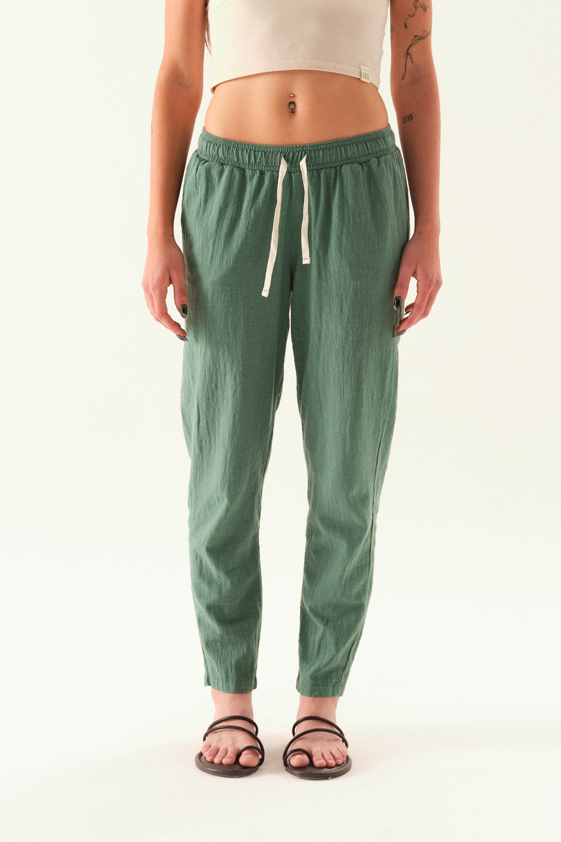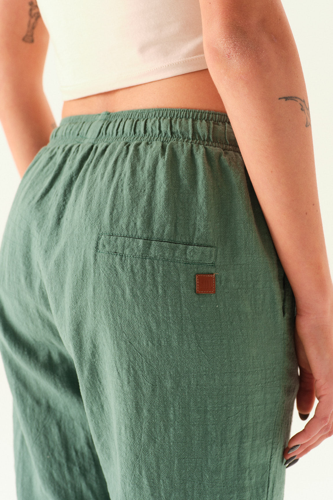 Pantalón babucha liso de algodón con bolsillos laterales y bolsillo ojal trasero. Posee elástico en cintura y tirilla en cinta hilera.