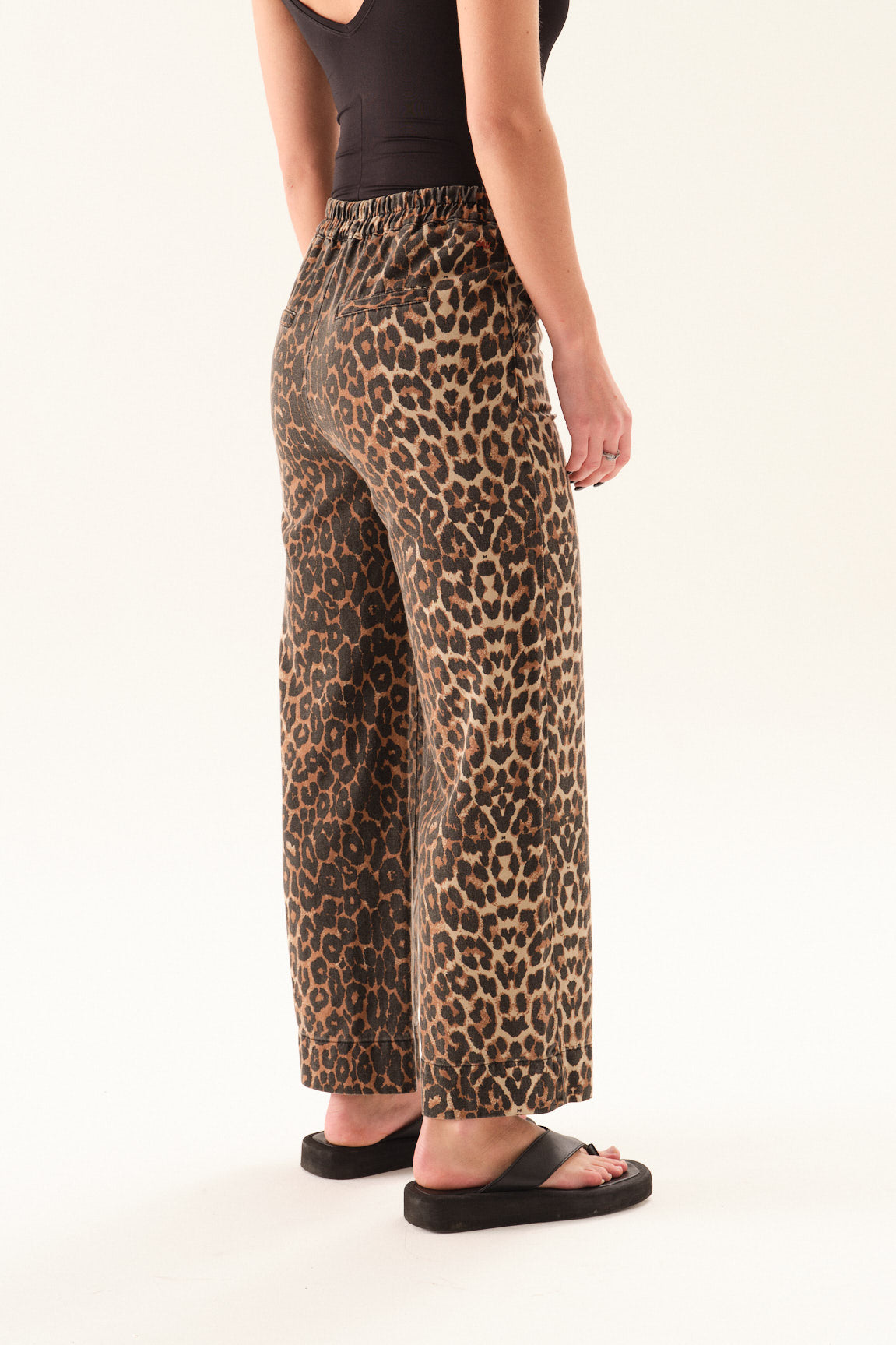 Pantalón wide leg de gabardina animal print, con bolsillos delanteros y elástico en la cintura trasera.