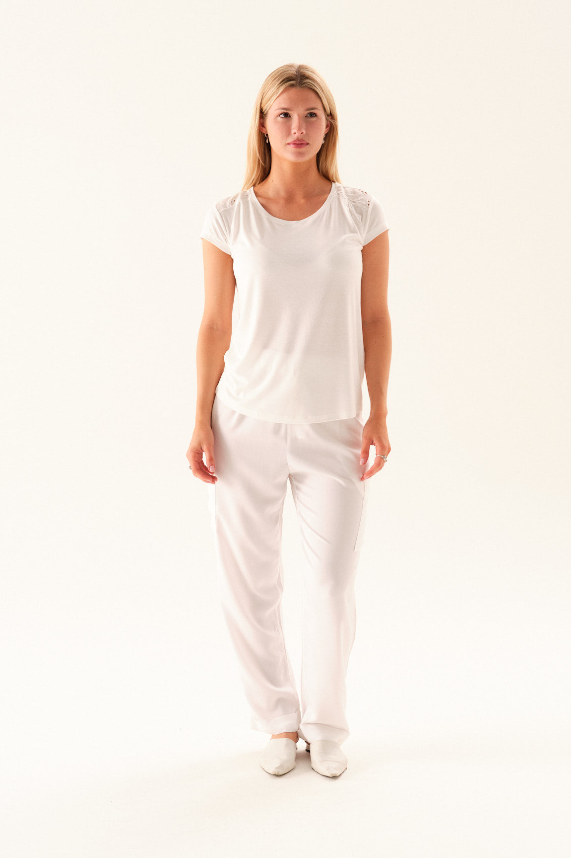 Remera de jersey escote redondo y manga corta .Tiene pequeños frunces en el delantero en tela combinación.