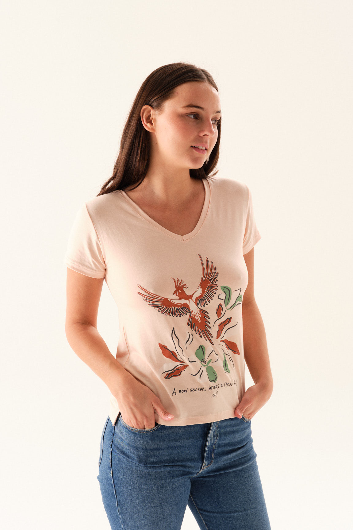 Remera de viuscosa manga corta escote V con estama en el delantero.