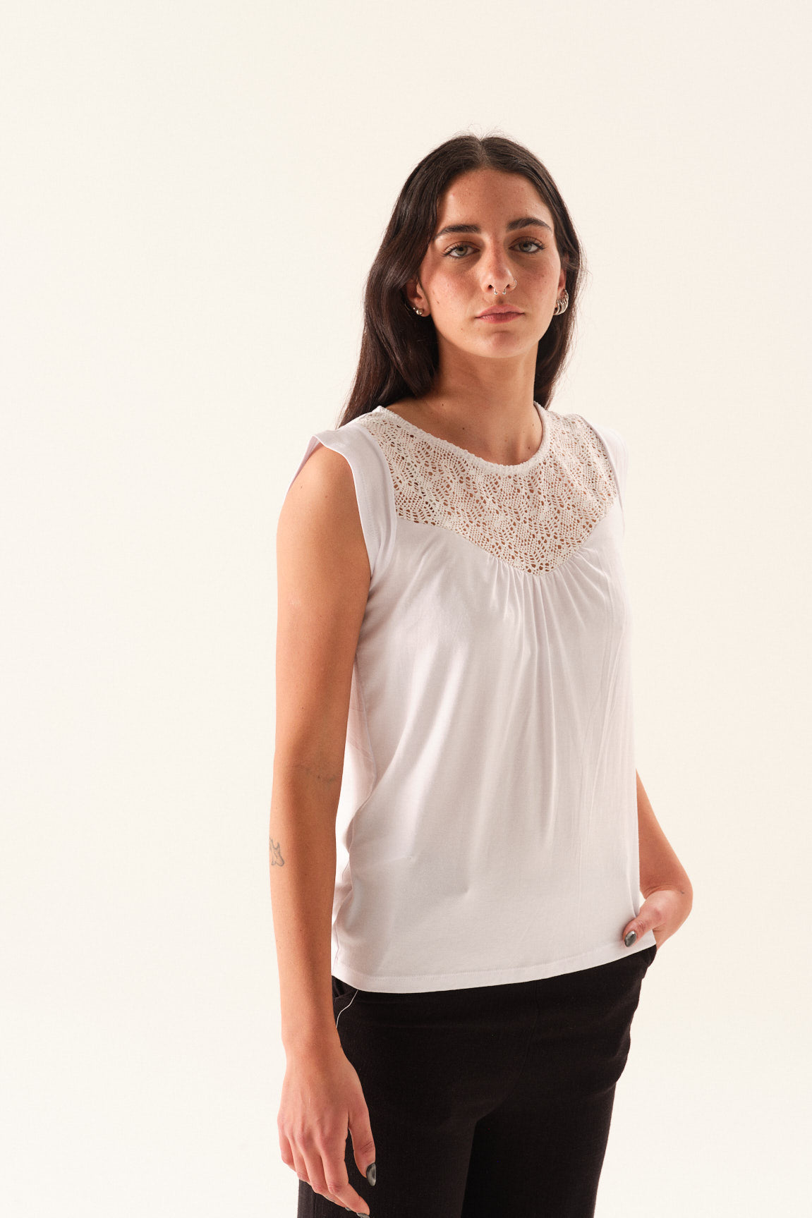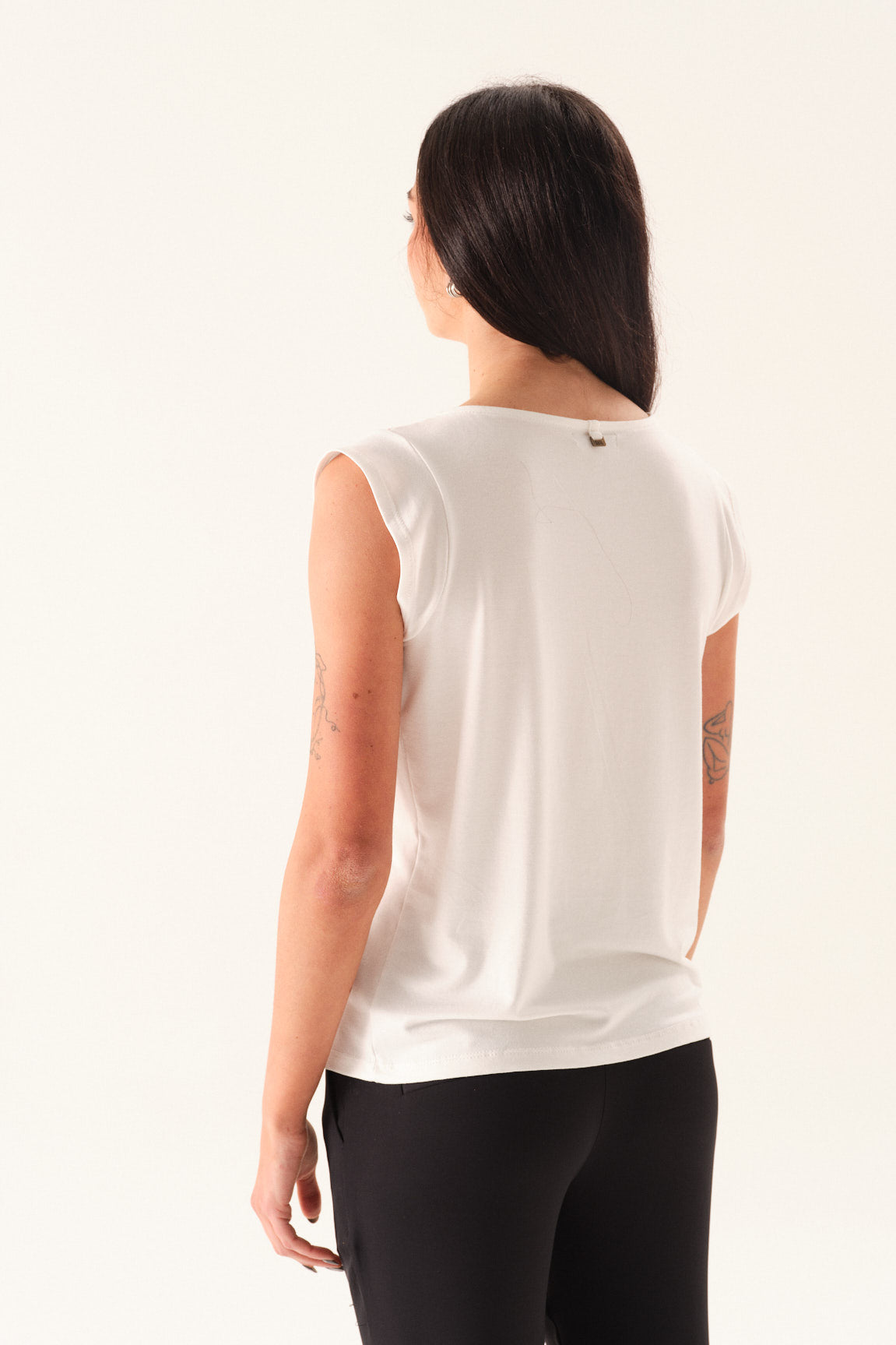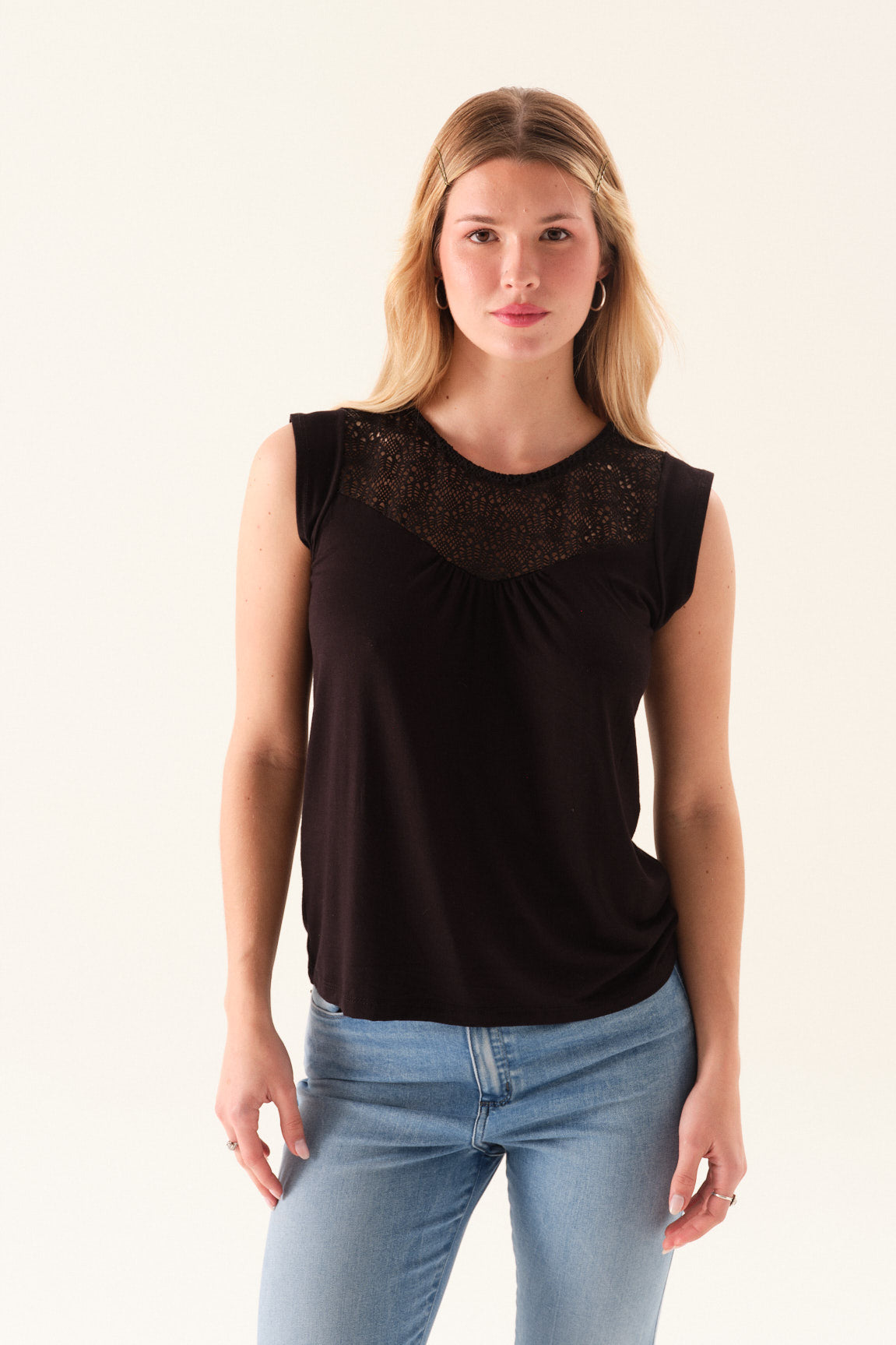 Remera de viscosa con escote redondo y manga con volado. Lleva canesú delantero en tela combinación.