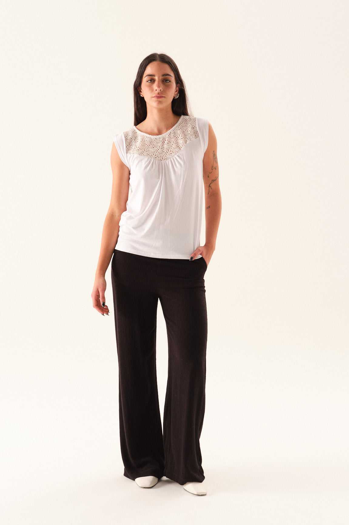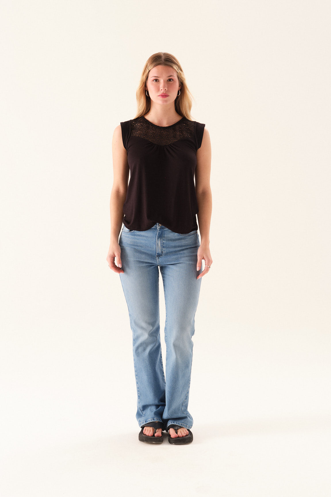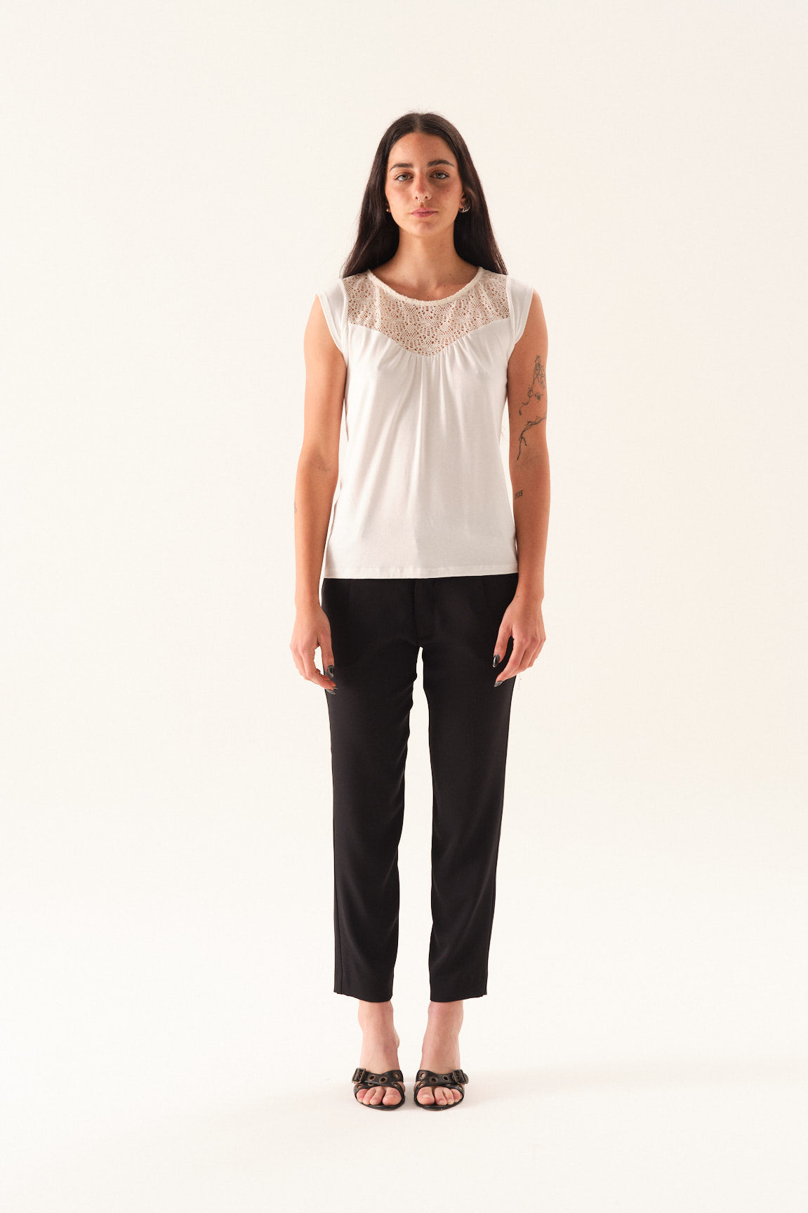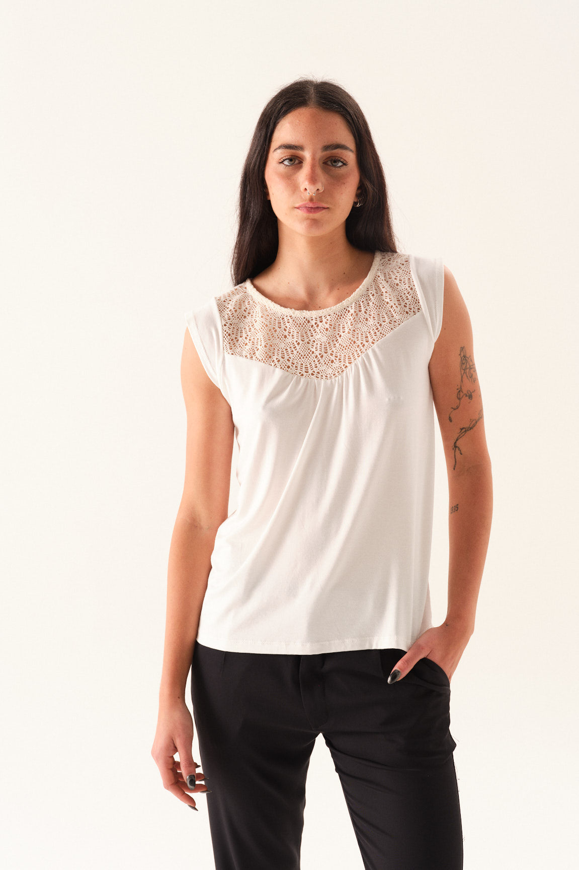 Remera de viscosa con escote redondo y manga con volado. Lleva canesú delantero en tela combinación.