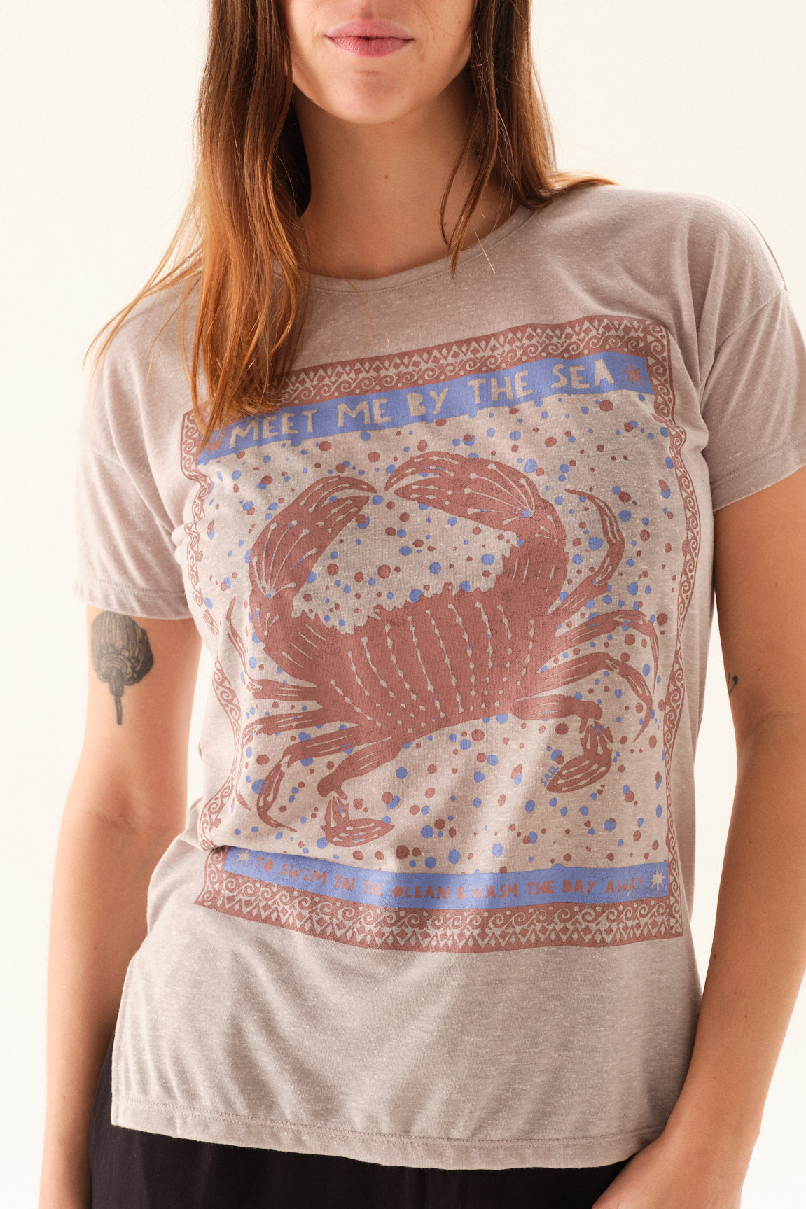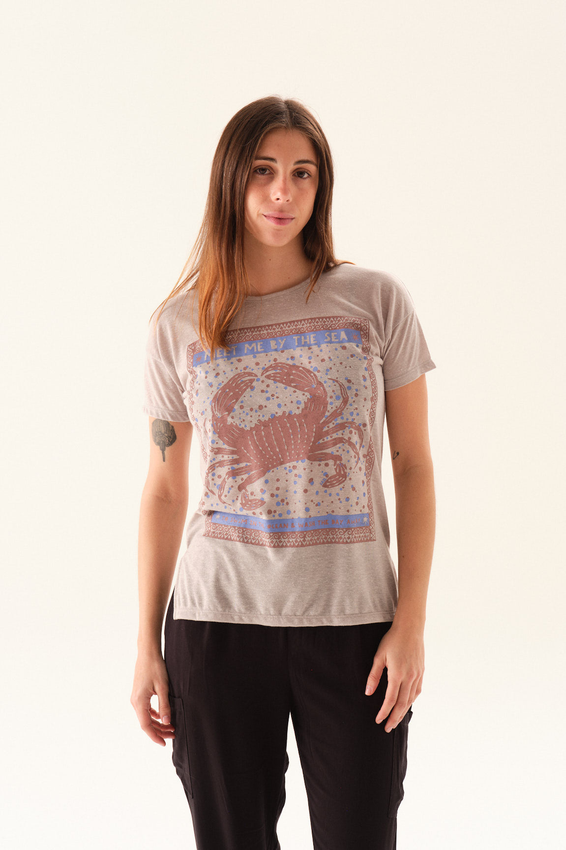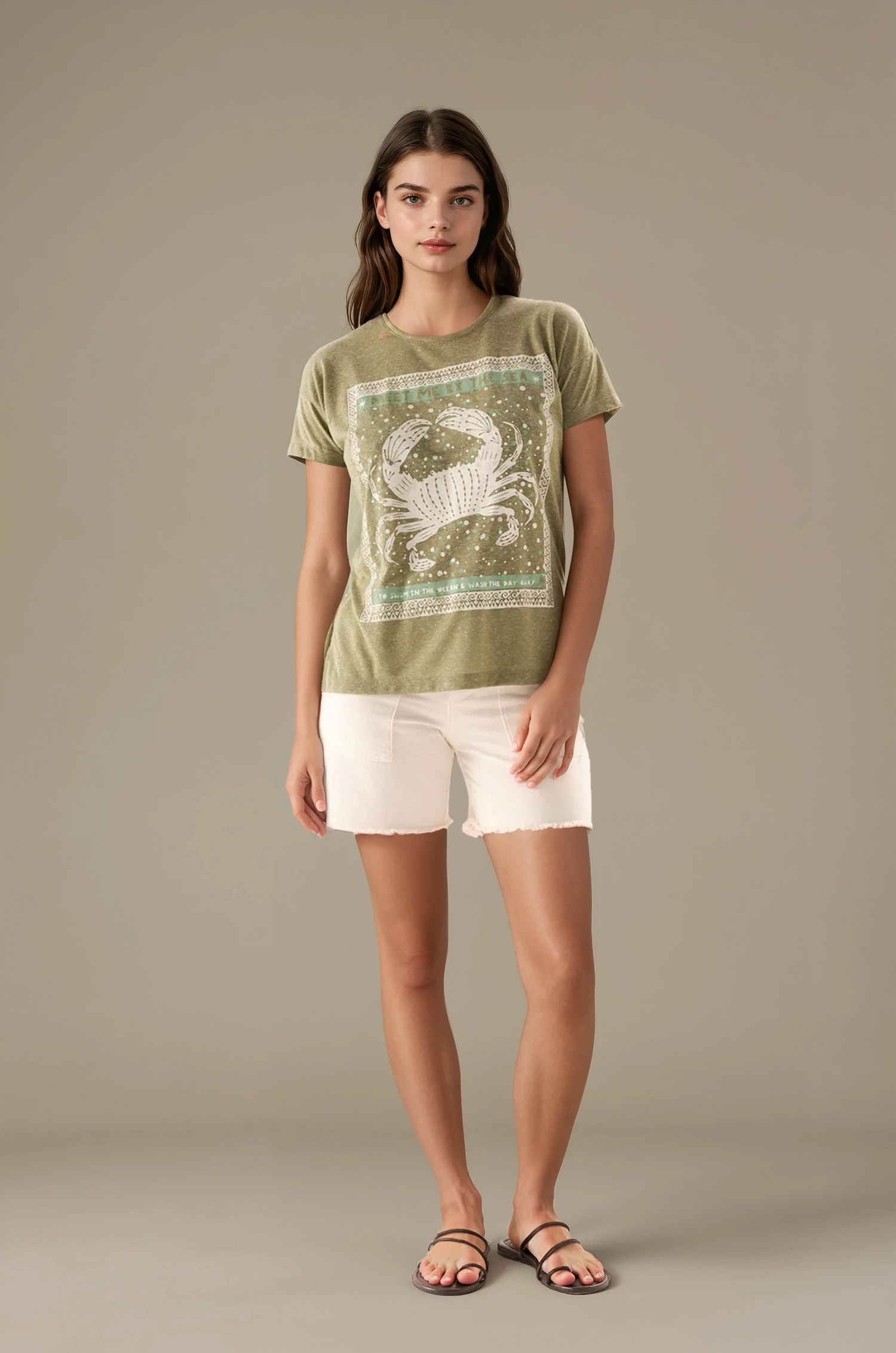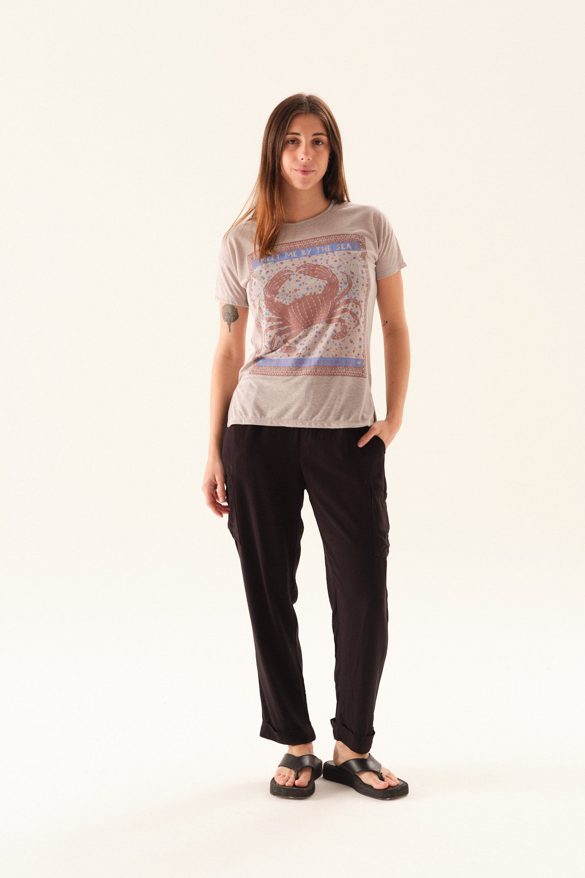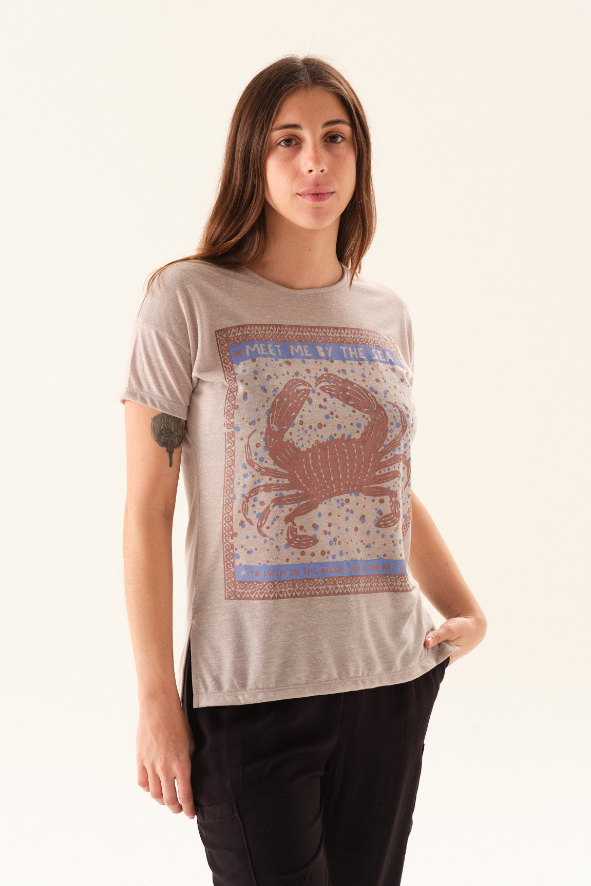 Remera de jersey lino manga corta con escote redondo y espalda irregular, con martillo lateral. Lleva estampa en le delantero.